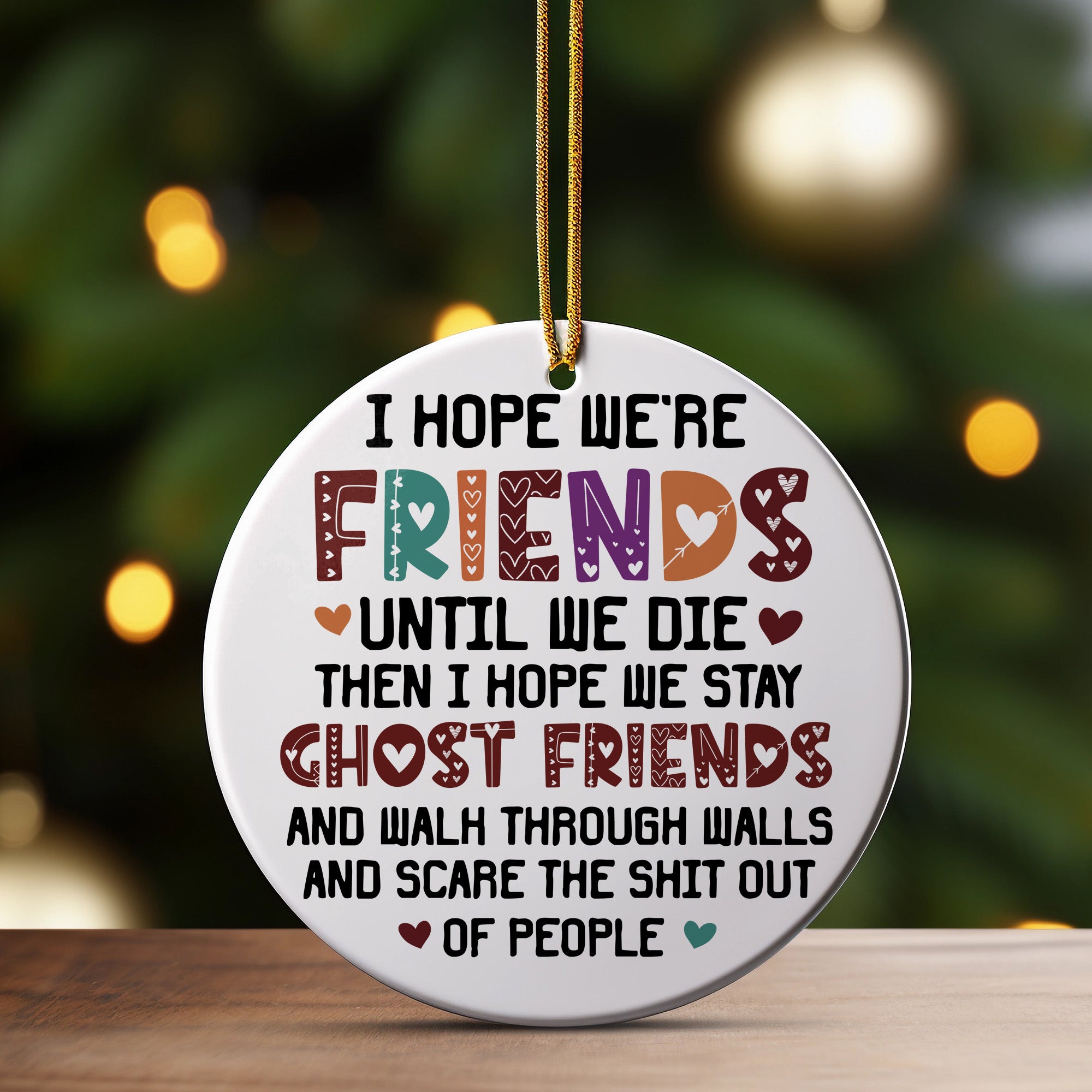 Celebrate the everlasting bond of friendship with our delightful Personalized Friendship Ceramic Ornament. This unique piece features a whimsical design with vibrant colors and patterns that add a playful touch to any setting. The bold text reads: “I hope we’re friends until we die, then I hope we stay ghost friends and walk through walls and scare the shit out of people.” It's sure to bring a smile and evoke fond memories shared with your best friend.