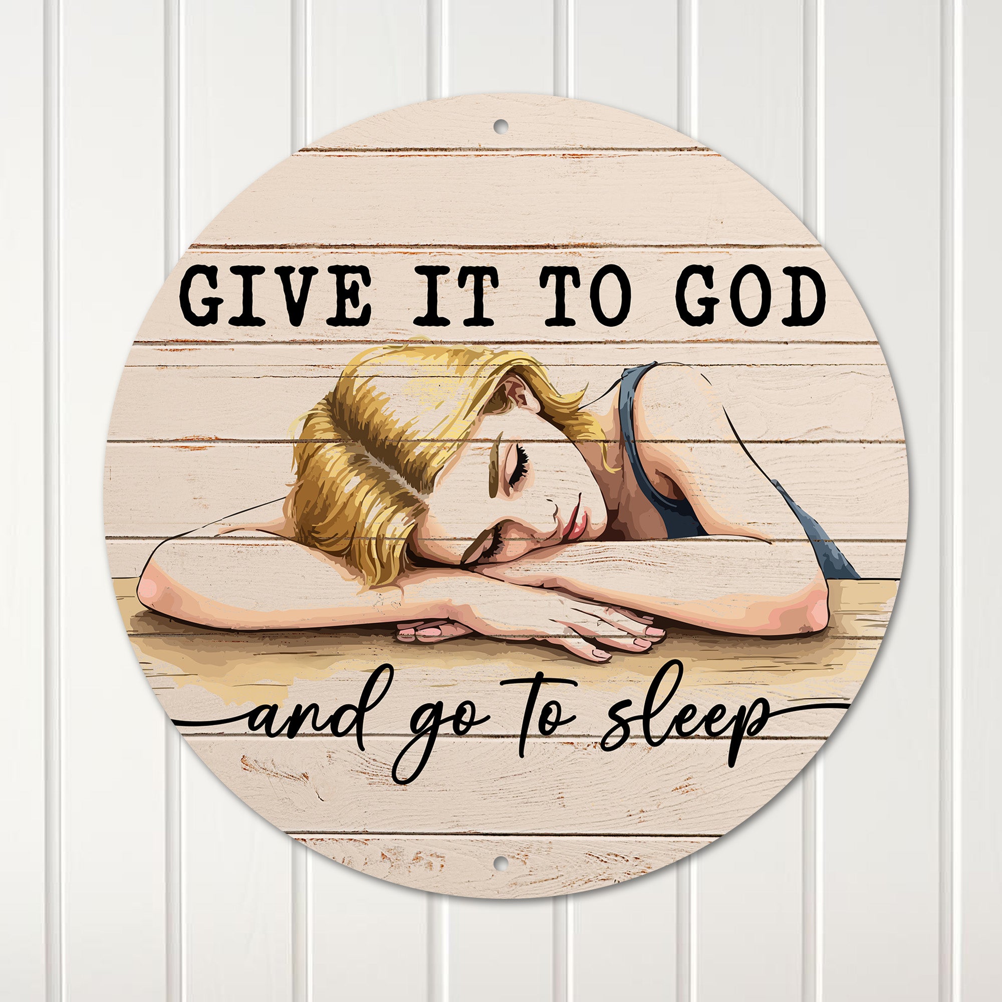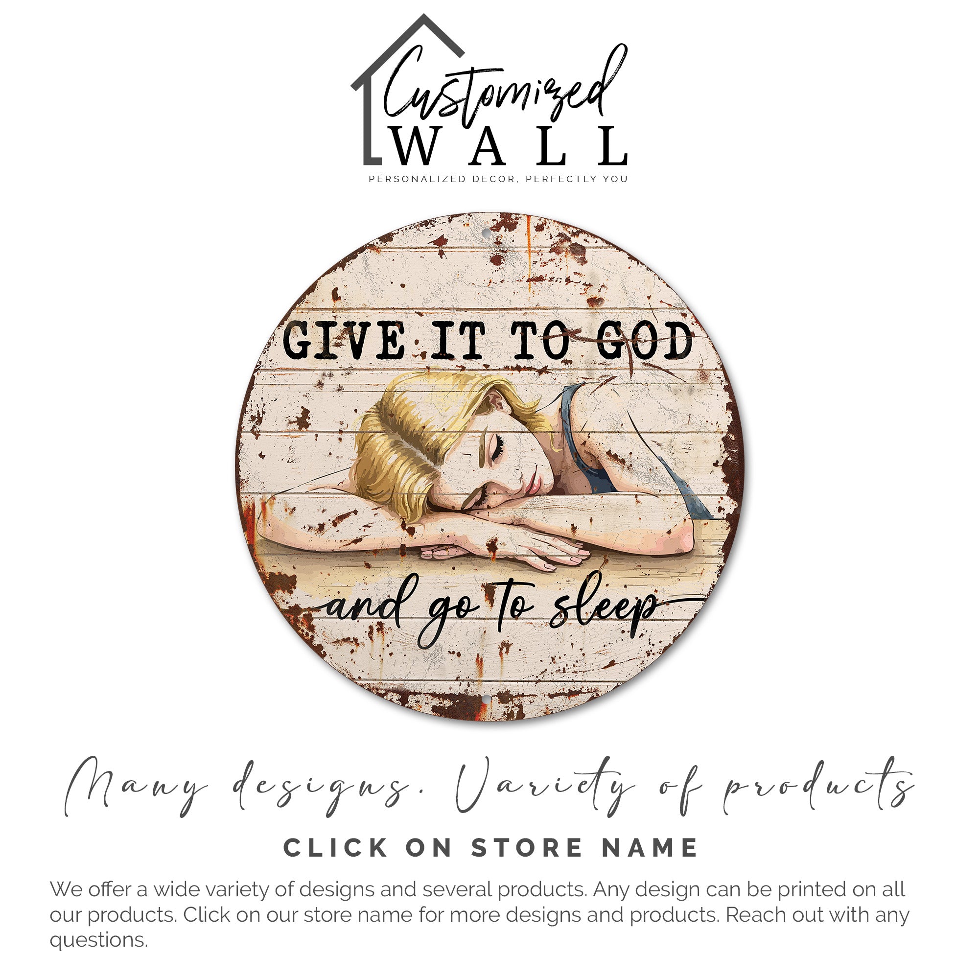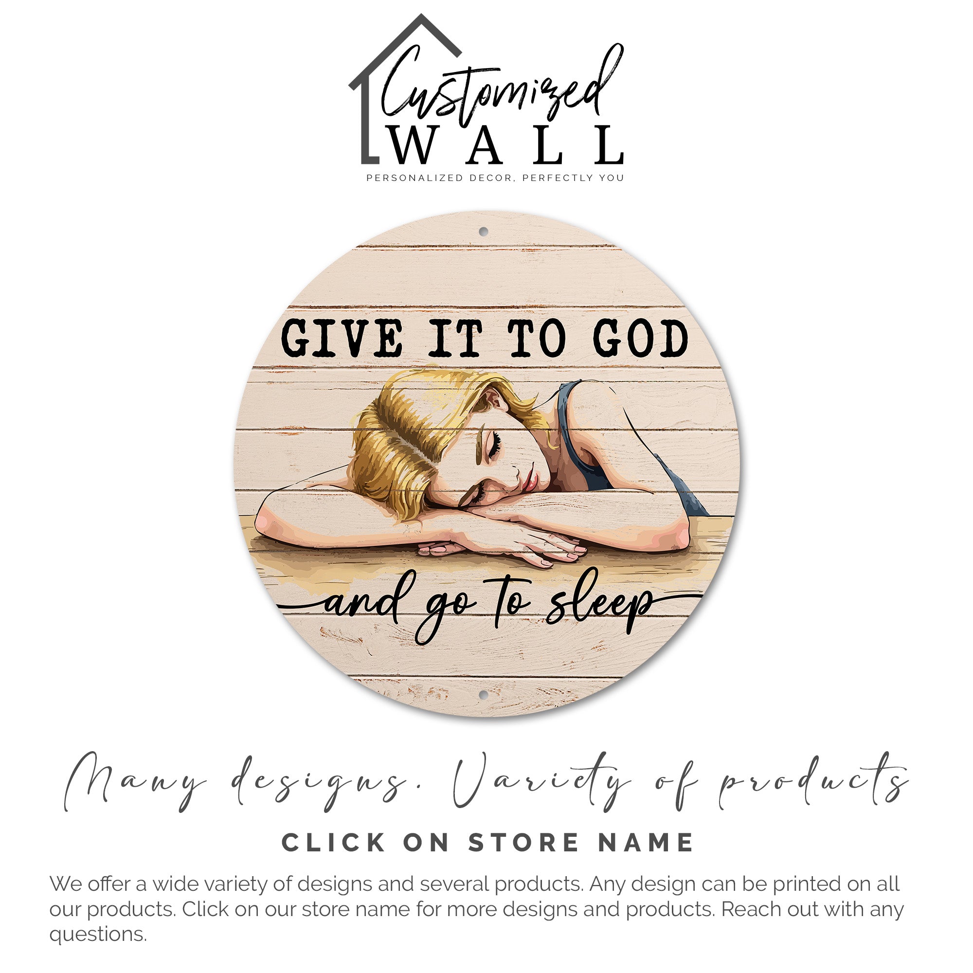 Add a touch of inspiration and warmth to any room with our personalized "Give It to God and Go to Sleep" round metal sign. This beautiful piece is carefully crafted from high-quality metal, ensuring durability and a sophisticated finish. The sign features a serene image of a woman resting, exquisitely illustrated with soft, calming colors and subtle wood texture patterns that create a sense of tranquility and peace.