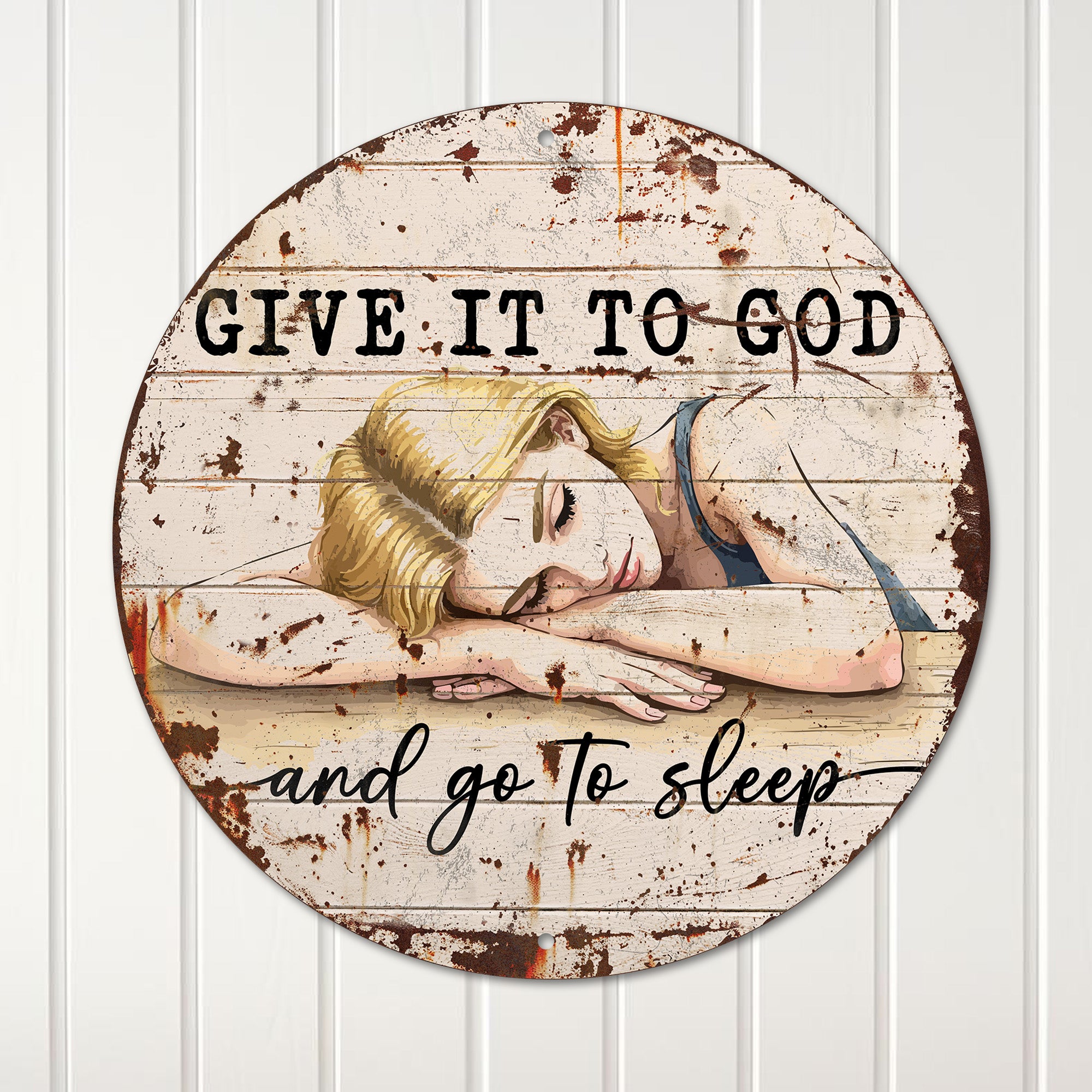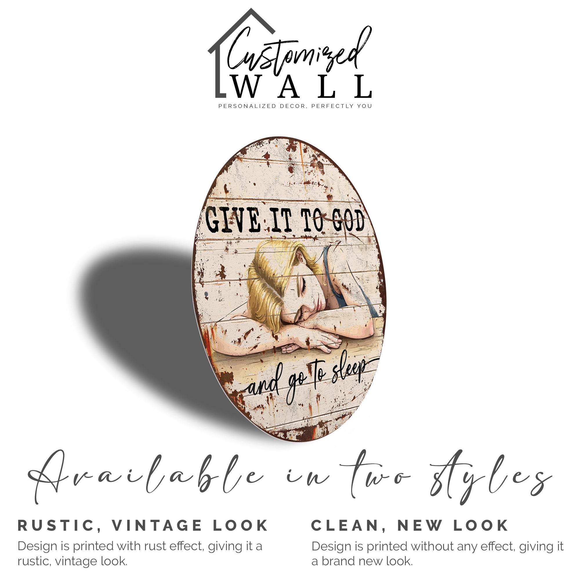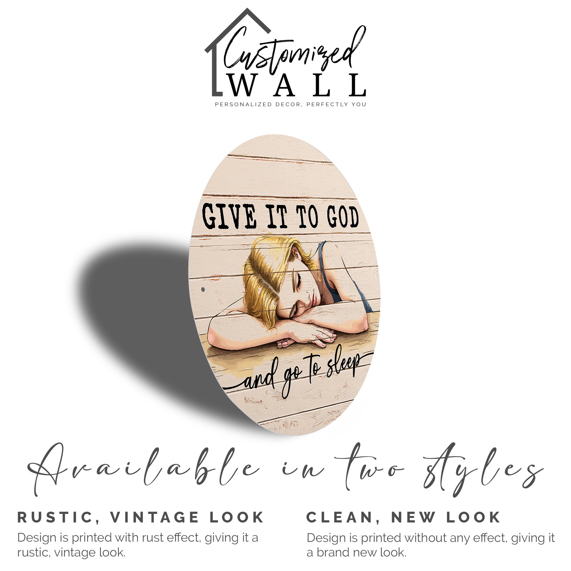 Add a touch of inspiration and warmth to any room with our personalized "Give It to God and Go to Sleep" round metal sign. This beautiful piece is carefully crafted from high-quality metal, ensuring durability and a sophisticated finish. The sign features a serene image of a woman resting, exquisitely illustrated with soft, calming colors and subtle wood texture patterns that create a sense of tranquility and peace.