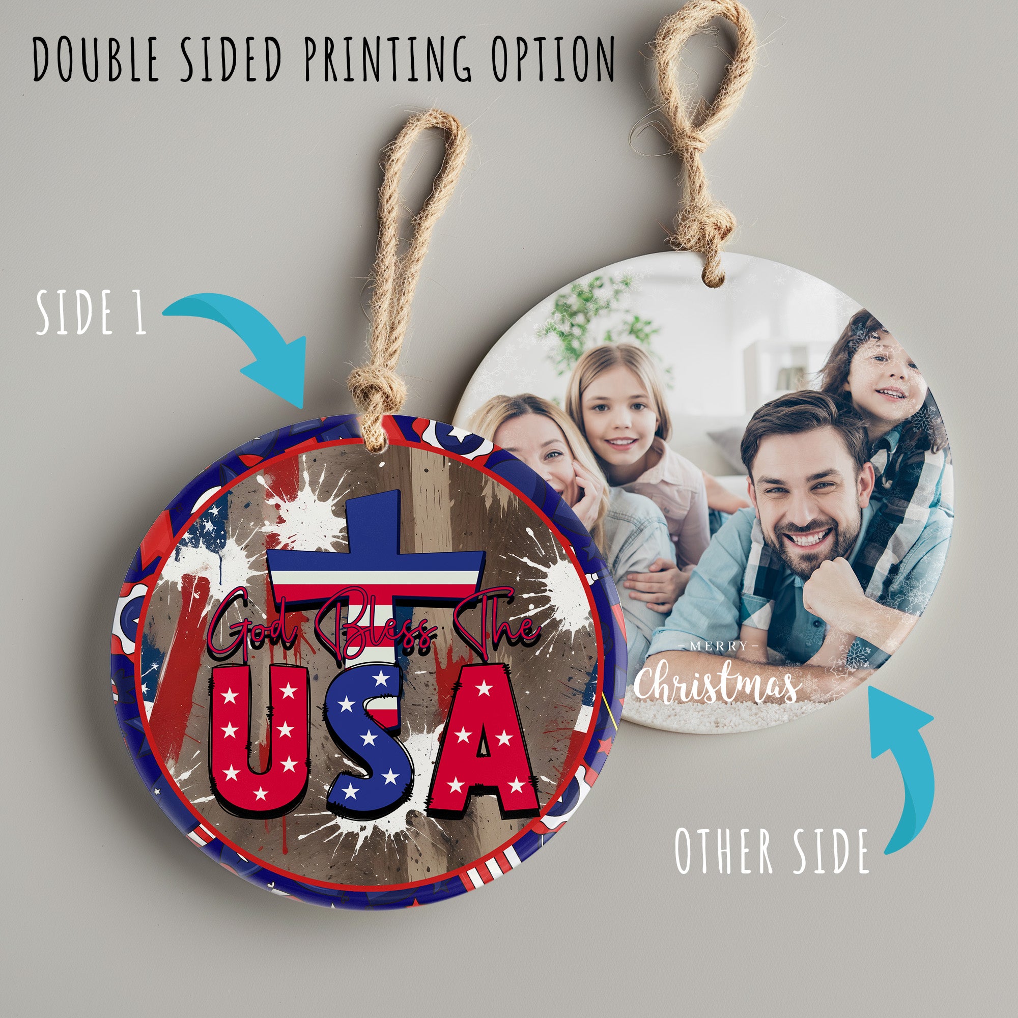 TAGS: patriotic ornament, ceramic ornament, personalized gift, holiday decor, USA pride, American flag, home decoration, gift for mom, Christmas ornament, handmade, military appreciation, faith-based decor, Veterans Day gift, customizable, unique present