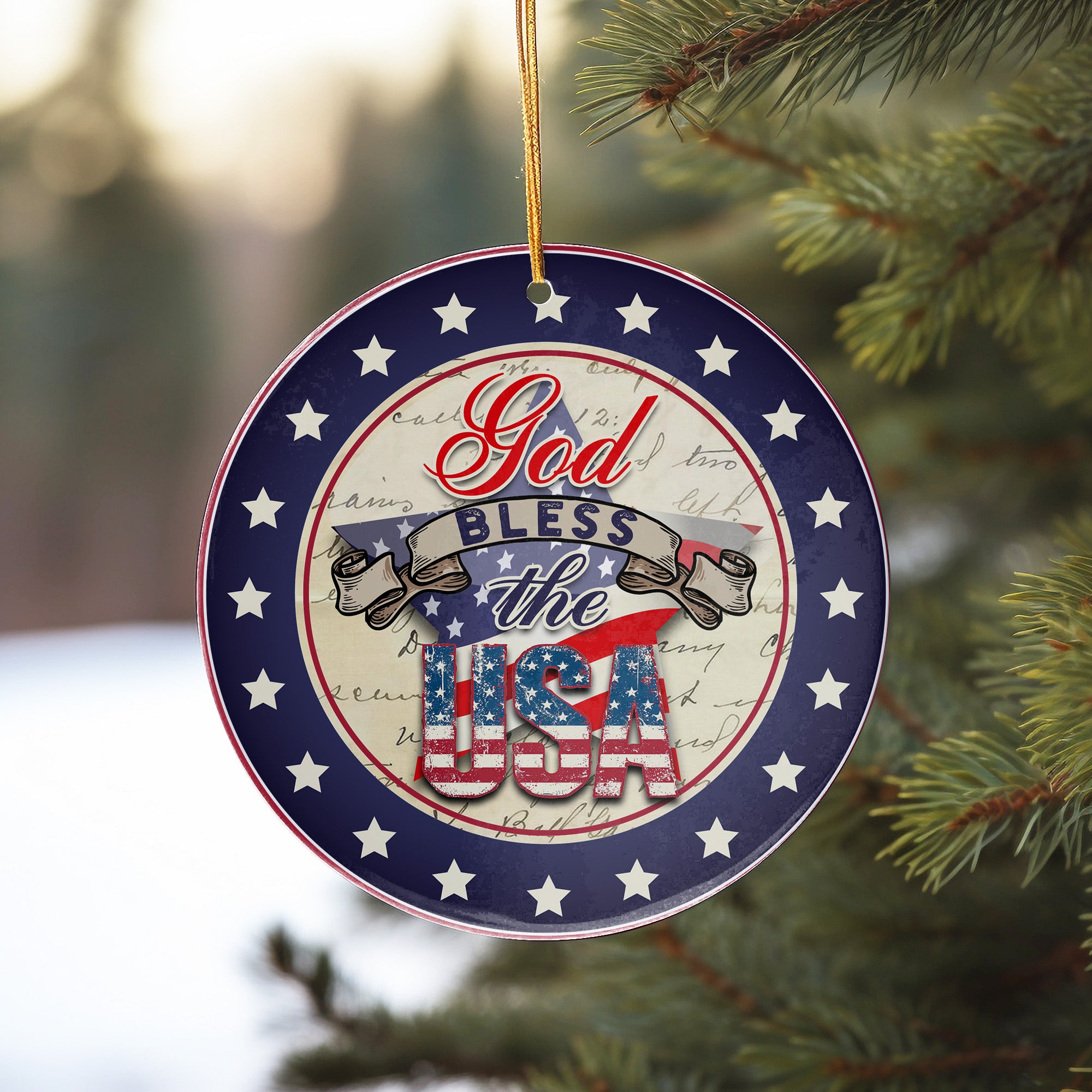 Celebrate your patriotic spirit with our "God Bless the USA" Ceramic Ornament, beautifully designed for those who hold America close to their hearts. This exquisite ornament features vibrant red, white, and blue colors, meticulously arranged in a star and banner pattern. The bold lettering stands out against a vintage script background, creating an elegant yet spirited declaration of pride and hope.
