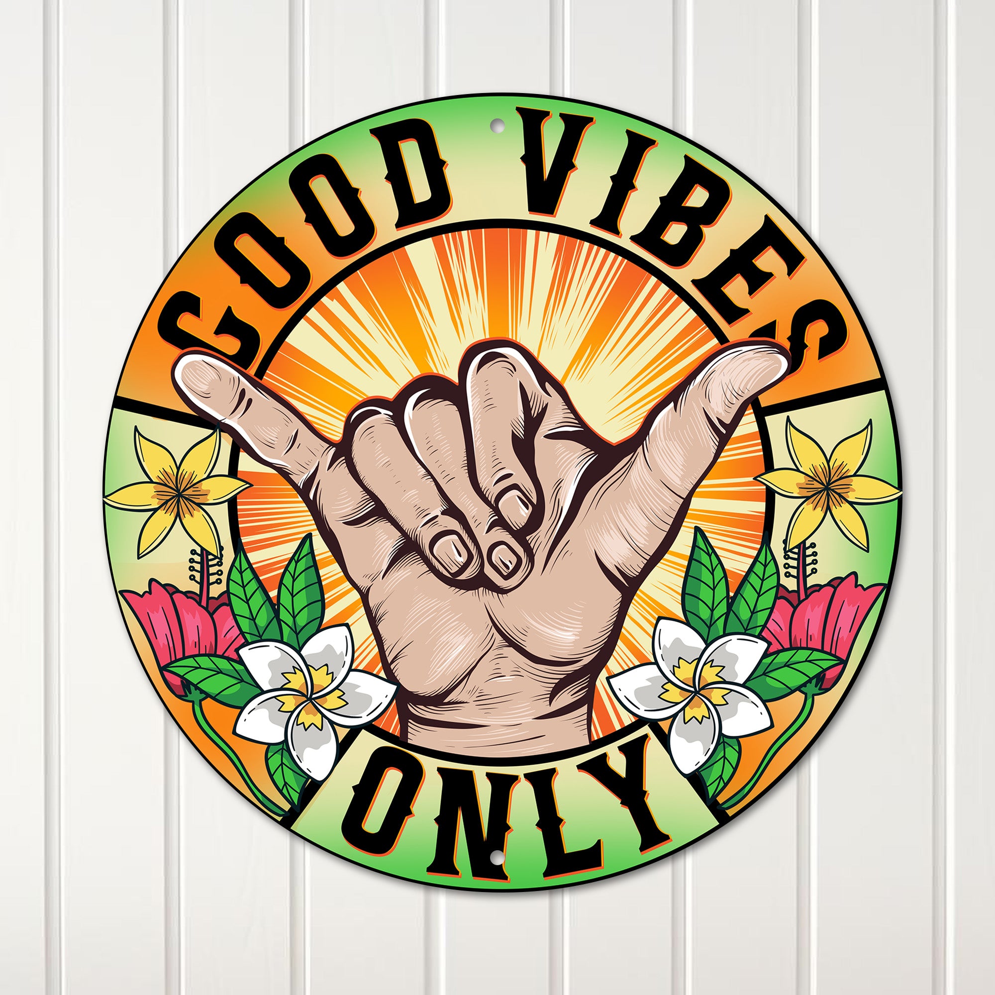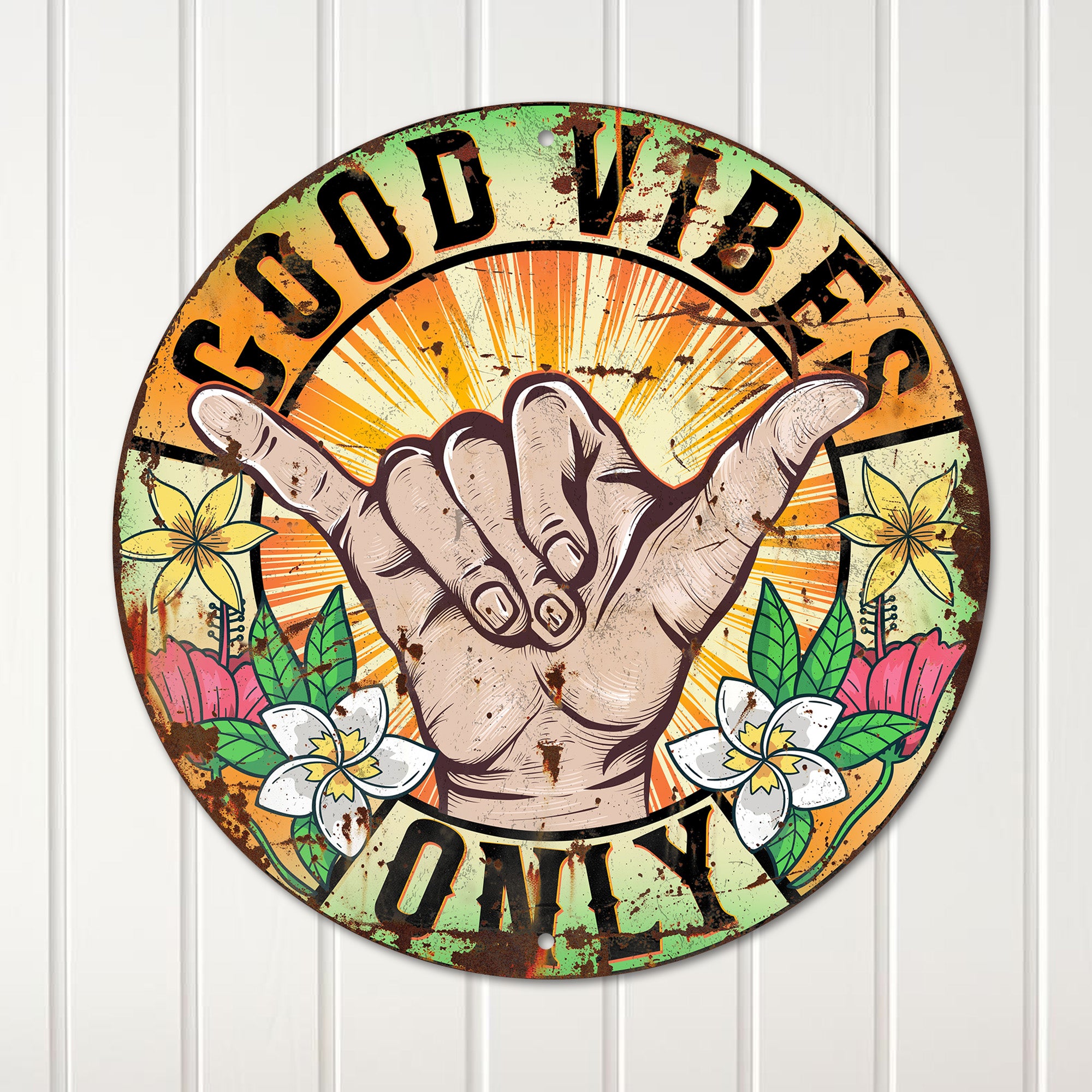 Add a touch of positivity to your space with our handmade “Good Vibes Only” Round Metal Sign. Perfect for bringing warmth and happiness, this sign features a lively design with a vibrant blend of colors, including uplifting oranges, greens, and yellows. It showcases a classic shaka hand symbol surrounded by tropical flowers, capturing that laid-back, island vibe.