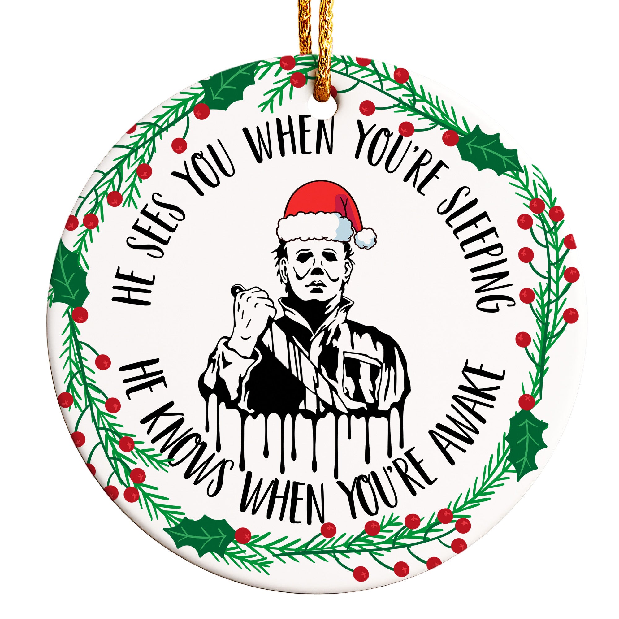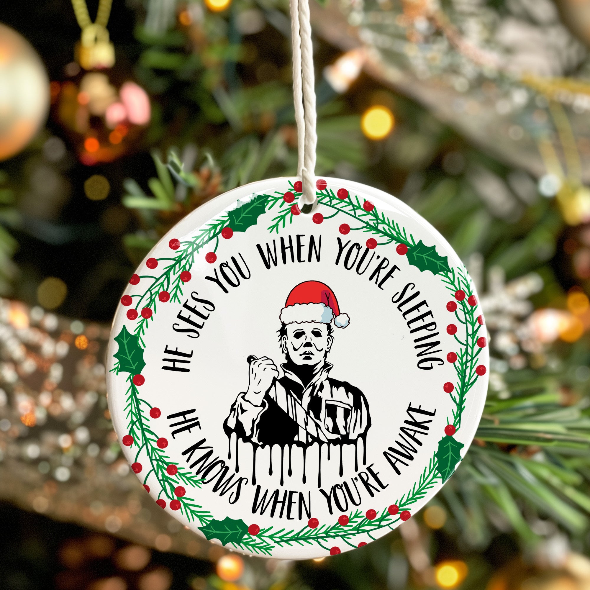 Crafted from high-quality ceramic, this ornament showcases vibrant colors and intricate patterns, including a classic Santa hat, holly leaves, and bright red berries. The amusing text, "He sees you when you're sleeping, he knows when you're awake," adds a playful twist and is sure to bring a smile to any horror enthusiast's face.