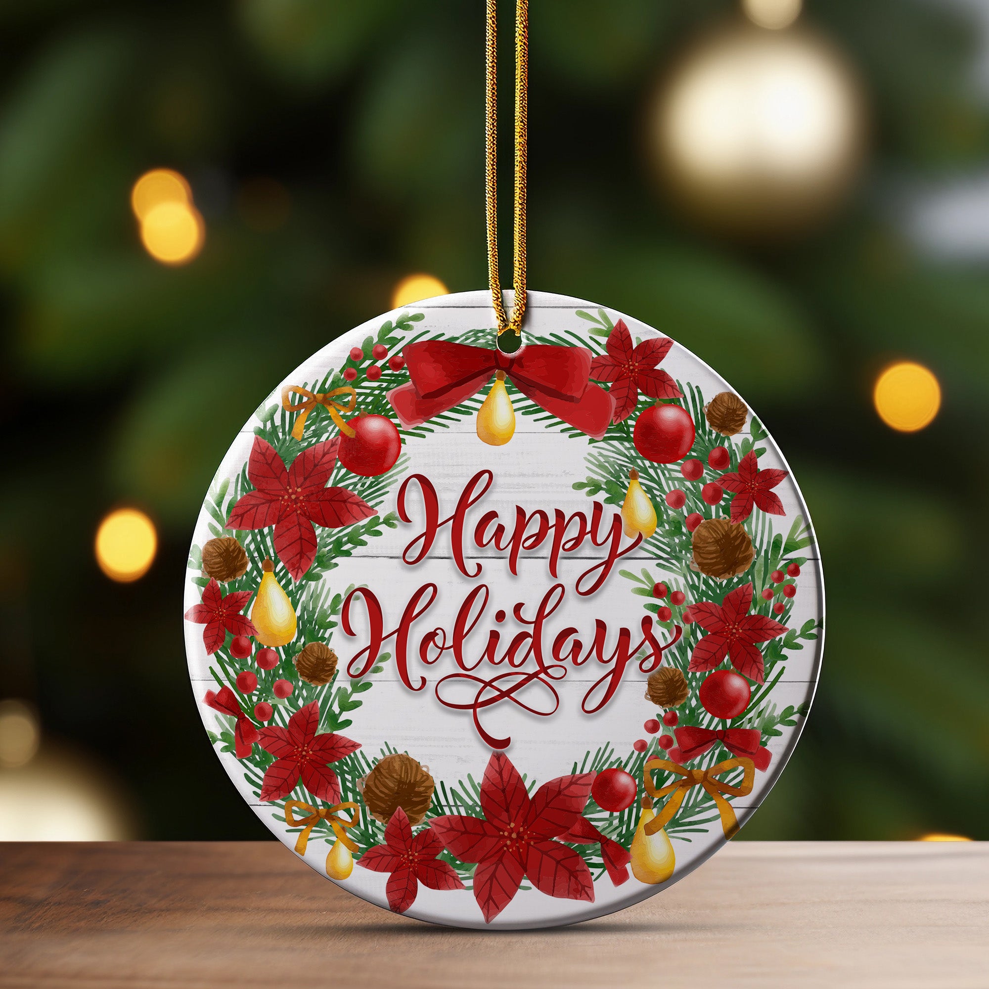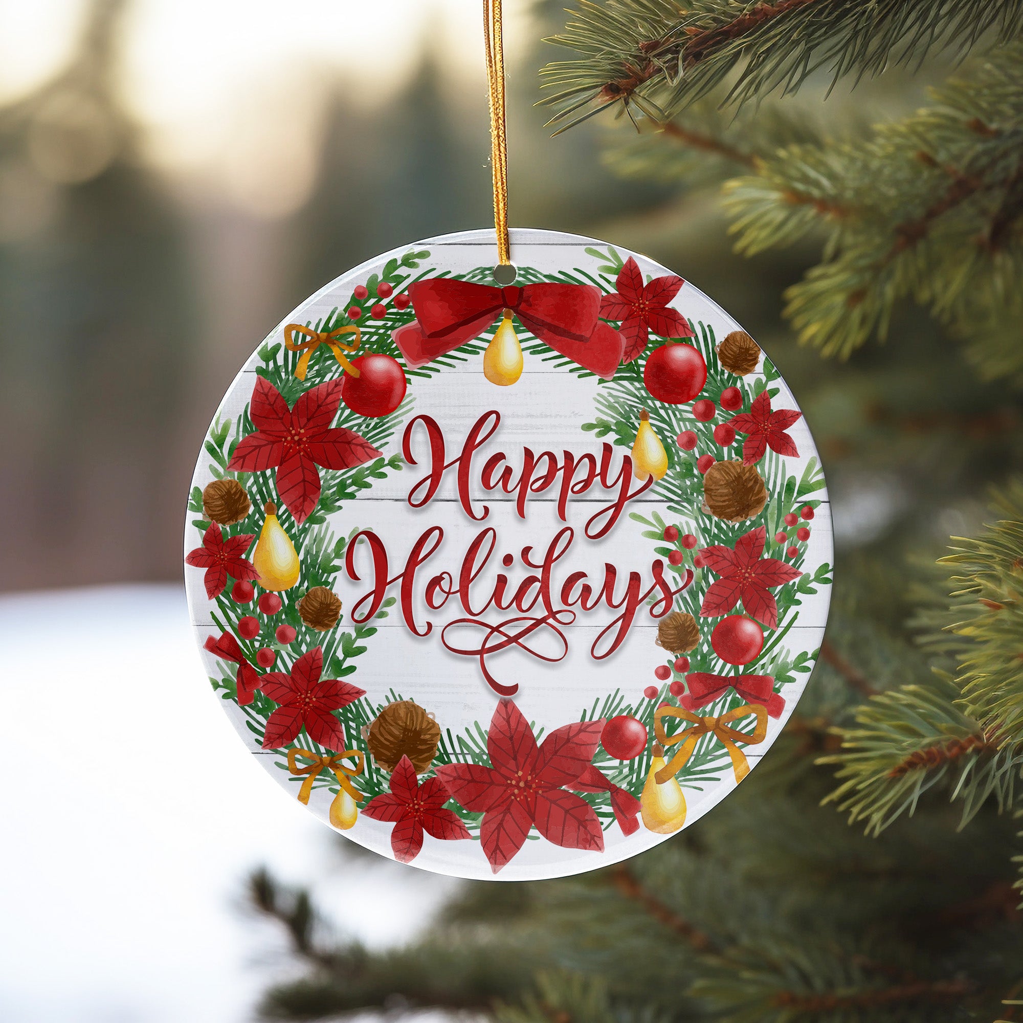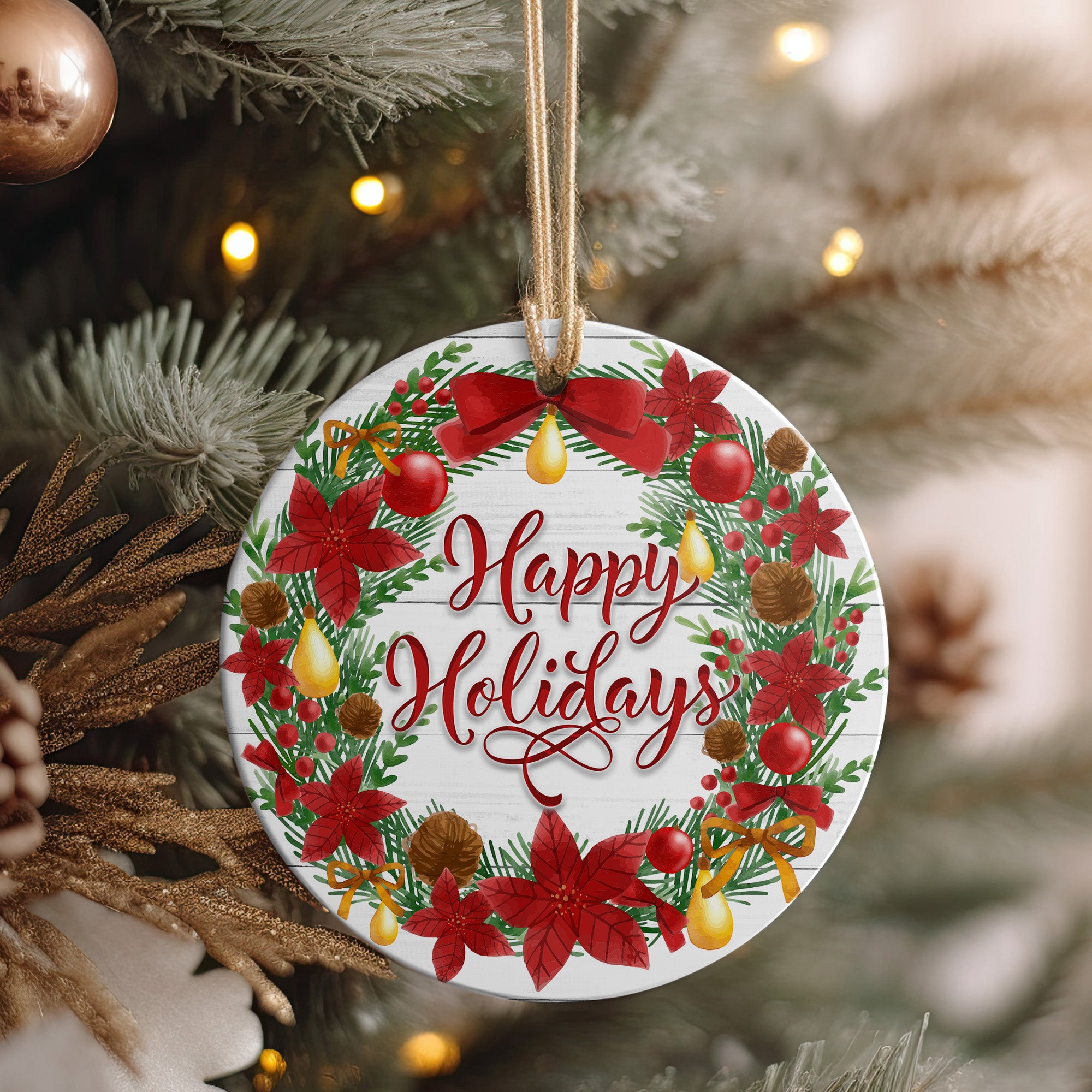 Enhance your holiday festivities with our exquisite Handmade Ceramic Ornament, featuring a vibrant wreath design adorned with classic red poinsettias, golden bows, pine cones, and lush green foliage. The elegant "Happy Holidays" message in a graceful script adds a touch of warmth and cheer to your home.