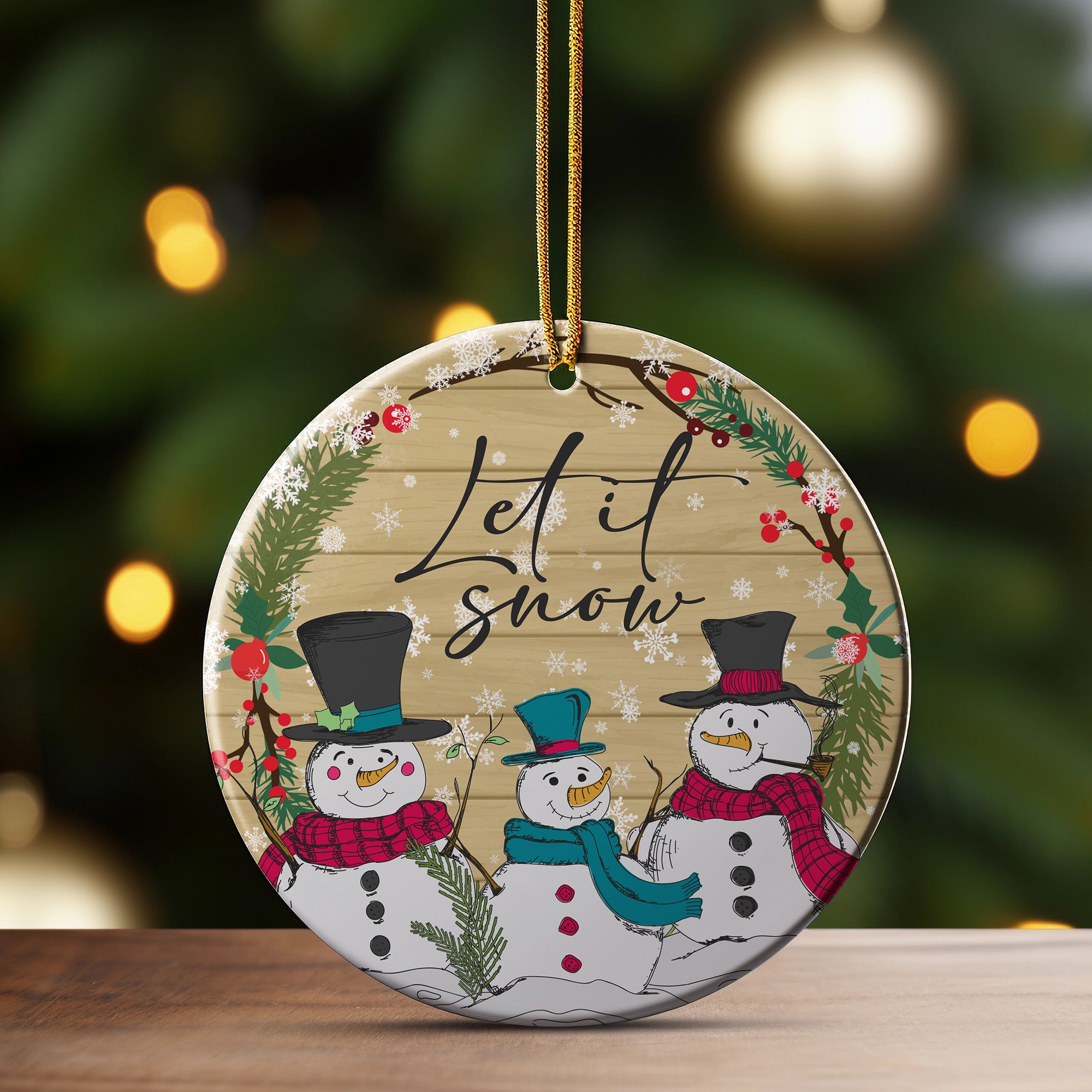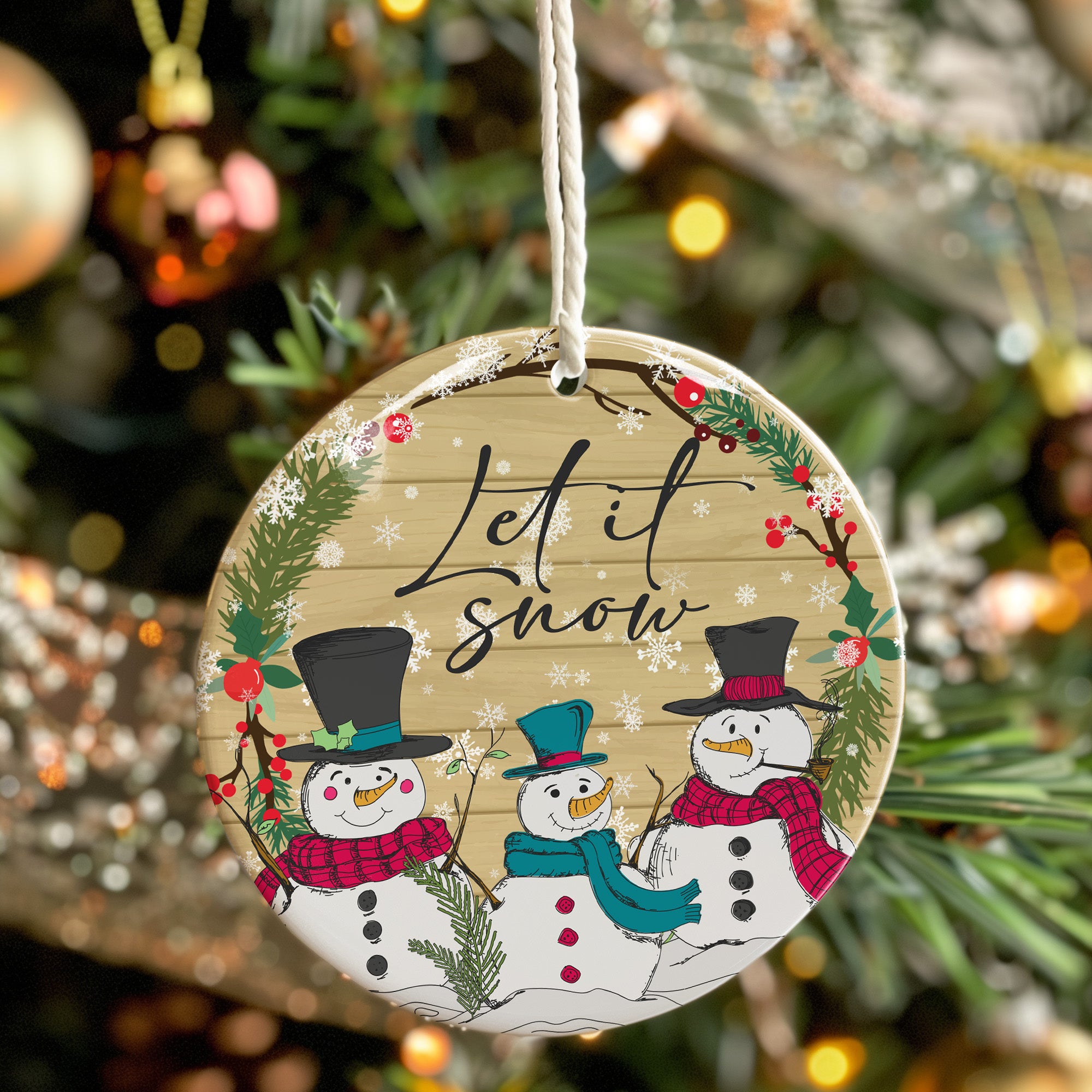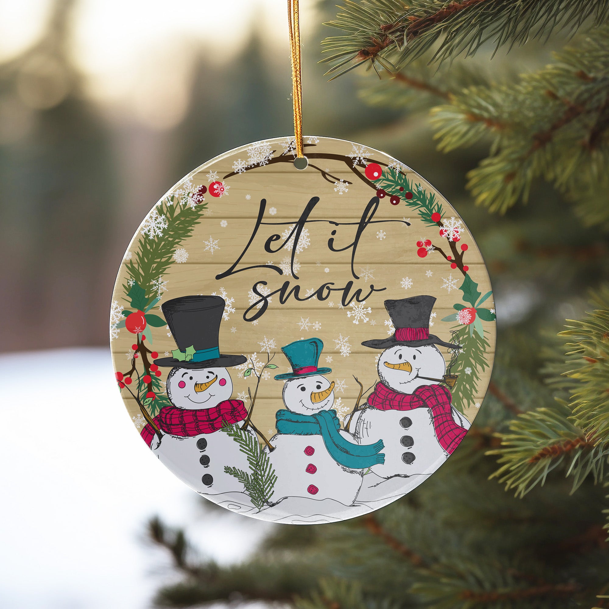 Add a touch of whimsy and warmth to your holiday decor with our "Let It Snow" Ceramic Ornament. Handcrafted with precision and love, this charming ornament features three delightful snowmen, adorned with vibrant scarves and top hats, surrounded by a festive wreath of greenery and red berries. The elegant script of "Let It Snow" adds a magical wintery touch to your seasonal celebrations.