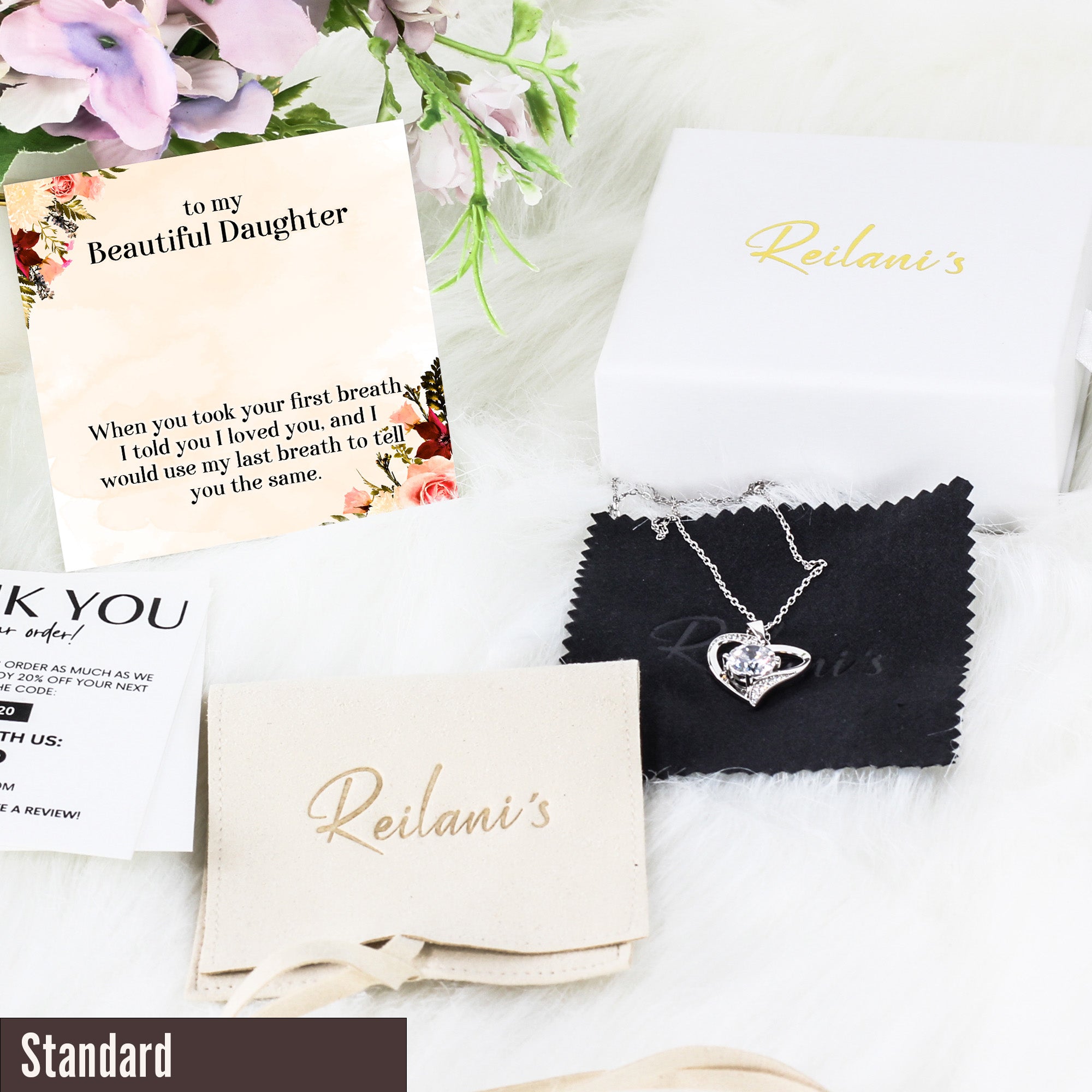 This elegant necklace is more than just a piece of jewelry; it's a heartfelt expression of love. Featuring a beautifully crafted silver knot pendant, this keepsake hangs gracefully on a delicate chain, symbolizing the unbreakable bond between you and your daughter. The necklace comes with a thoughtfully designed message card, delicately adorned with floral patterns in soft, warm colors, enhancing its emotional appeal.