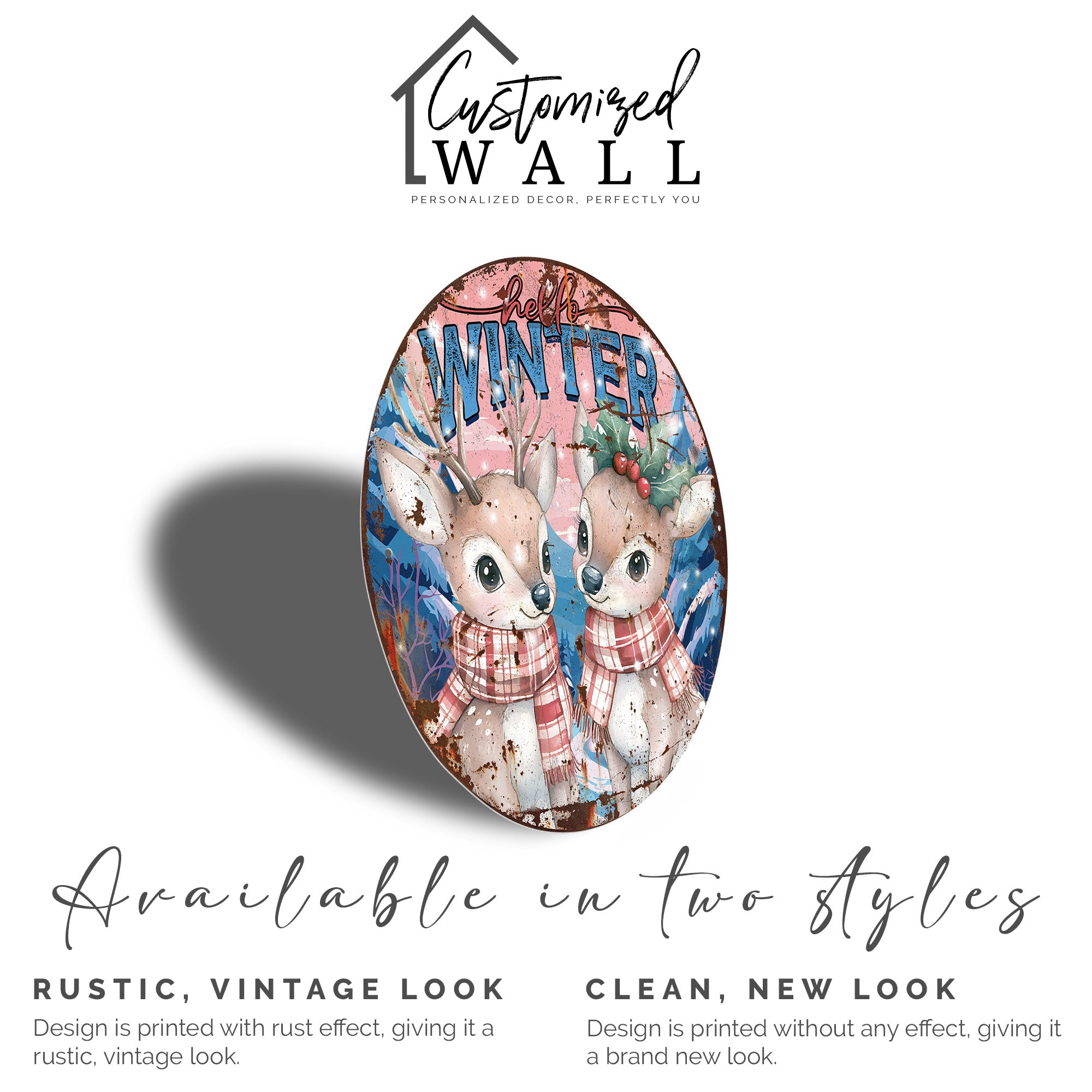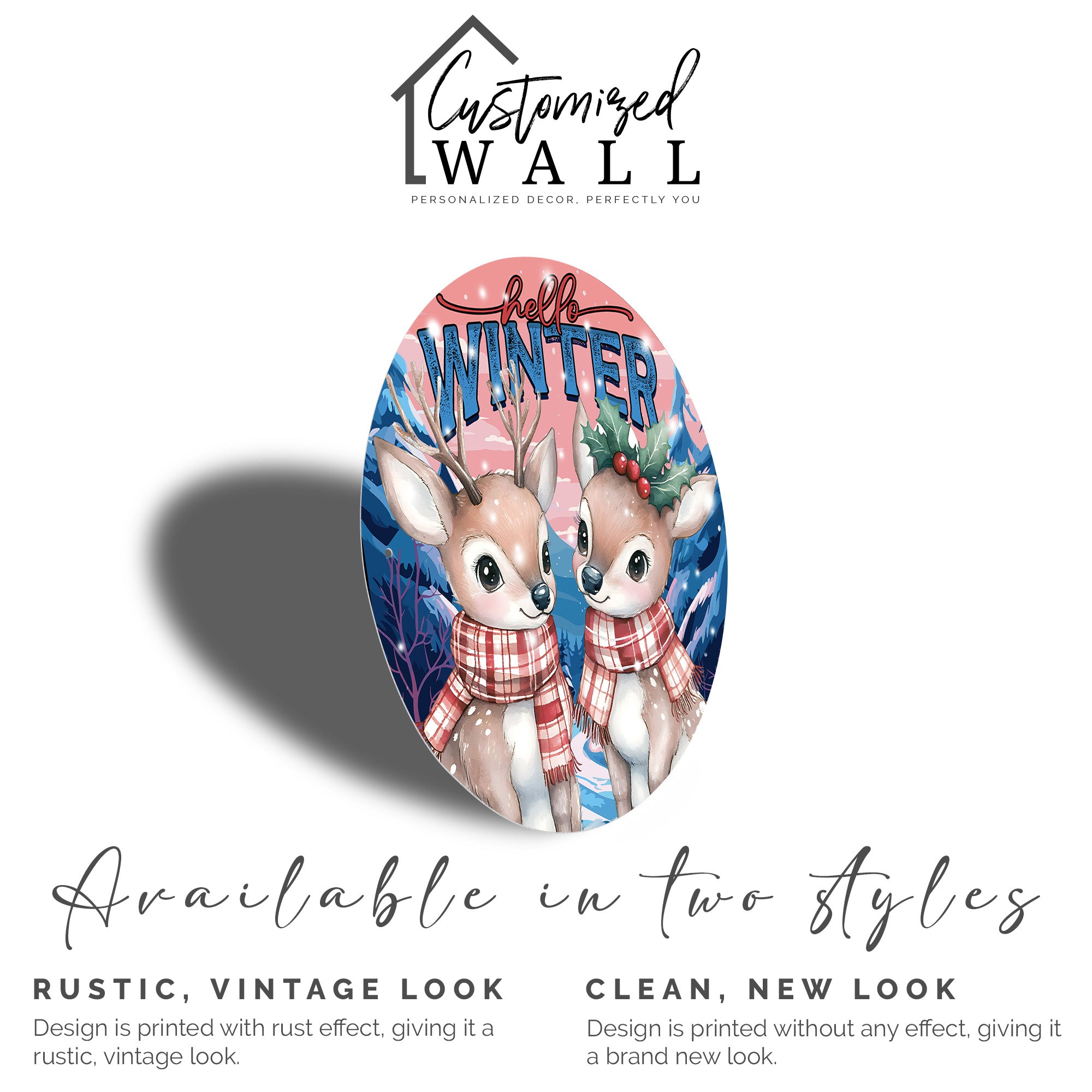 Transform your home into a winter wonderland with our enchanting "Hello Winter" Round Metal Sign. This beautifully illustrated piece features two adorable deer, wrapped in cozy plaid scarves, set against a picturesque snowy background. The elegant, hand-lettered "Hello Winter" greeting adds a touch of festive cheer, making it the perfect decor for your seasonal celebrations.