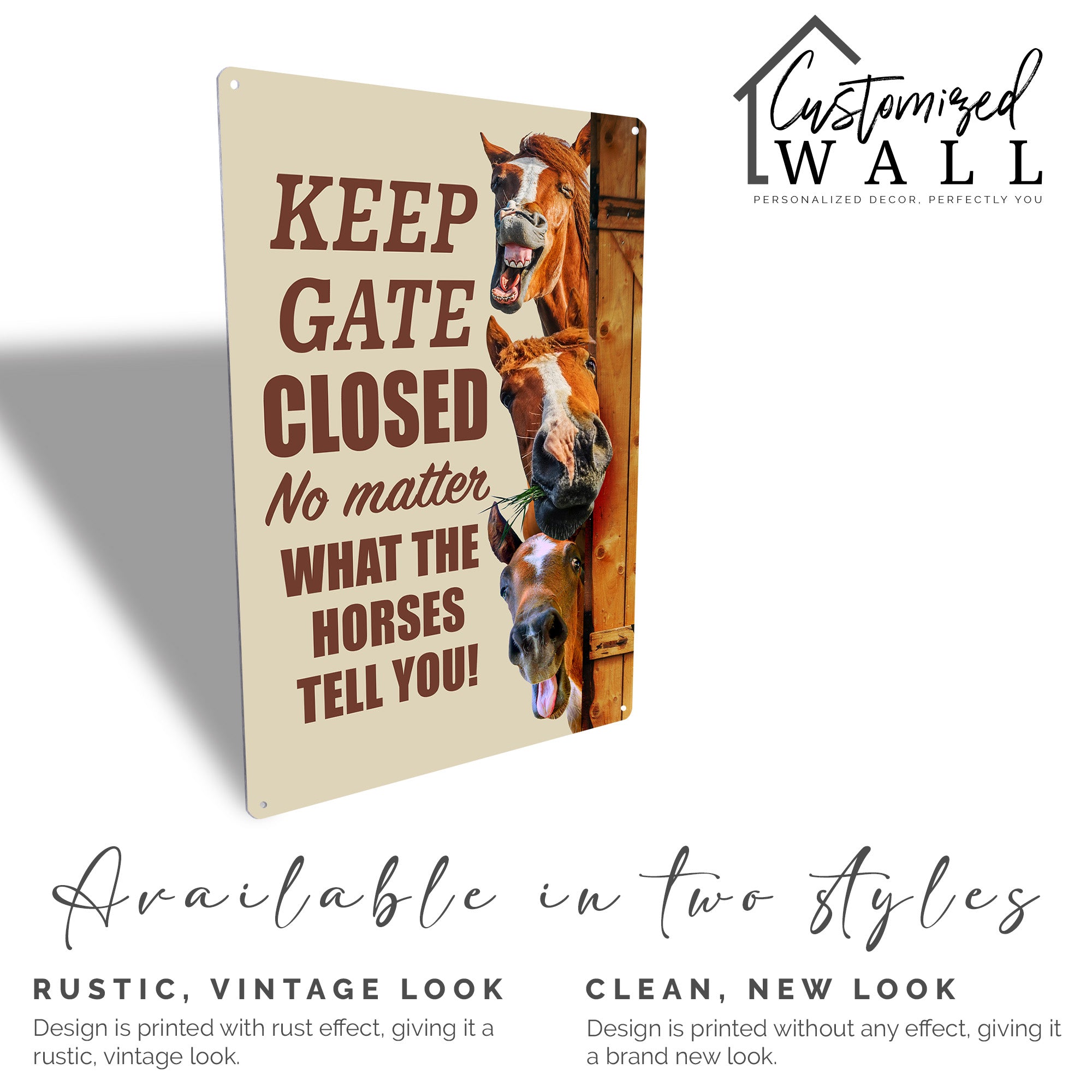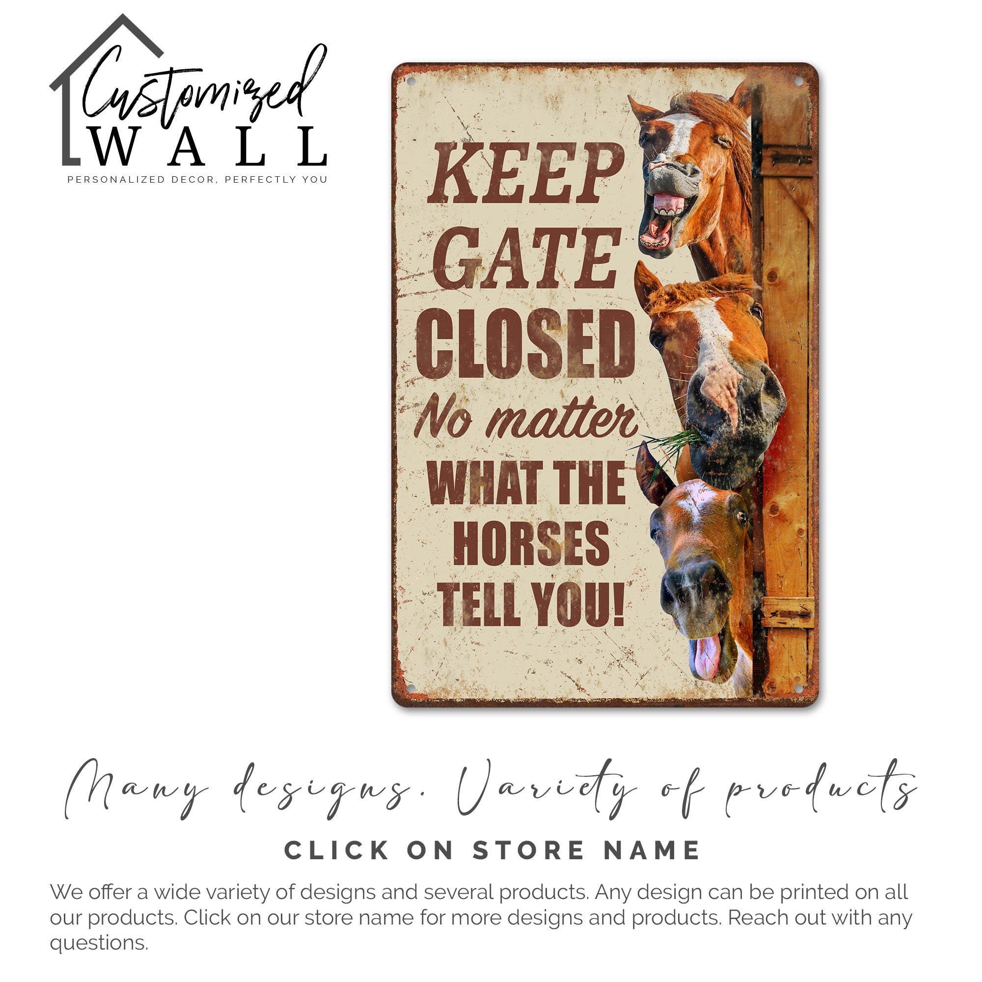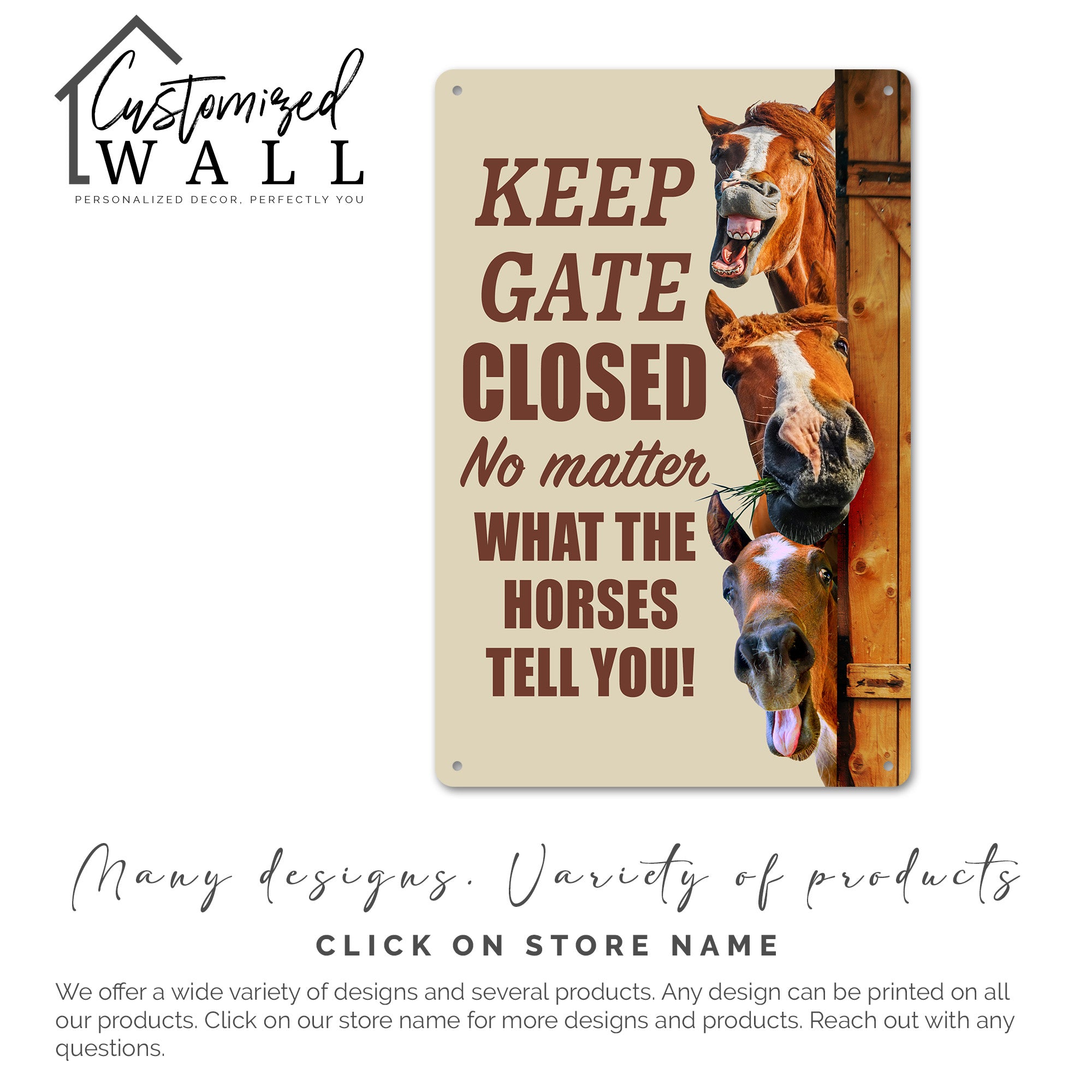 Add a touch of humor and charm to any space with our Personalized Horse Humor Metal Sign. Perfect for horse lovers and equestrian enthusiasts, this rustic farmhouse-inspired sign is crafted from high-quality metal, ensuring durability and a timeless aesthetic. The playful imagery of cheerful horses peeking through a gate is complemented by the humorous message, "KEEP GATE CLOSED No matter WHAT THE HORSES TELL YOU!" making it a delightful addition to stables, barns, or even your home.