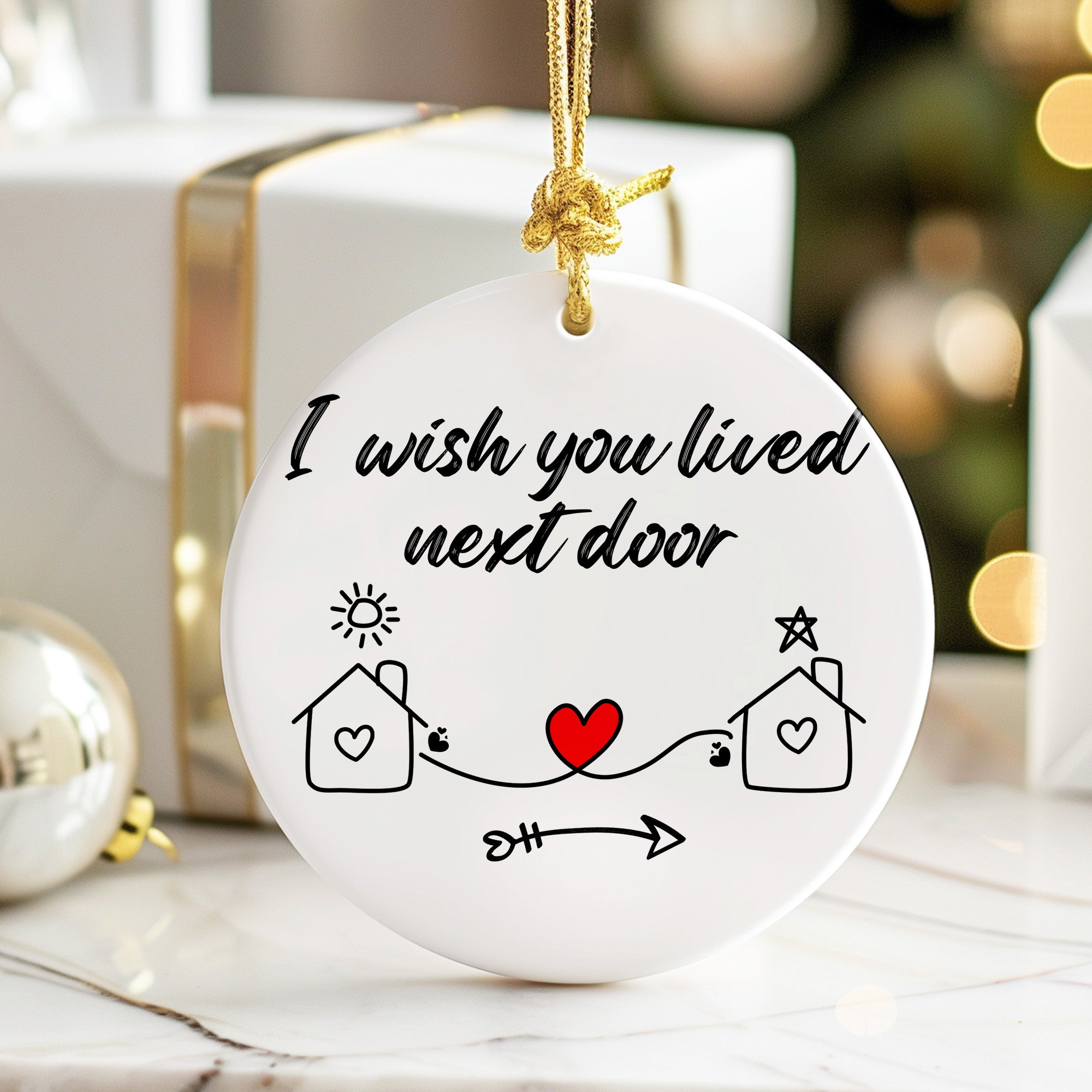 This beautifully crafted ceramic ornament captures the warmth and longing of friendship and connection with its charming design and heartfelt message: "I wish you lived next door." Featuring two hand-drawn houses connected by a whimsical heart and arrow motif, this piece exudes a sense of love and companionship.