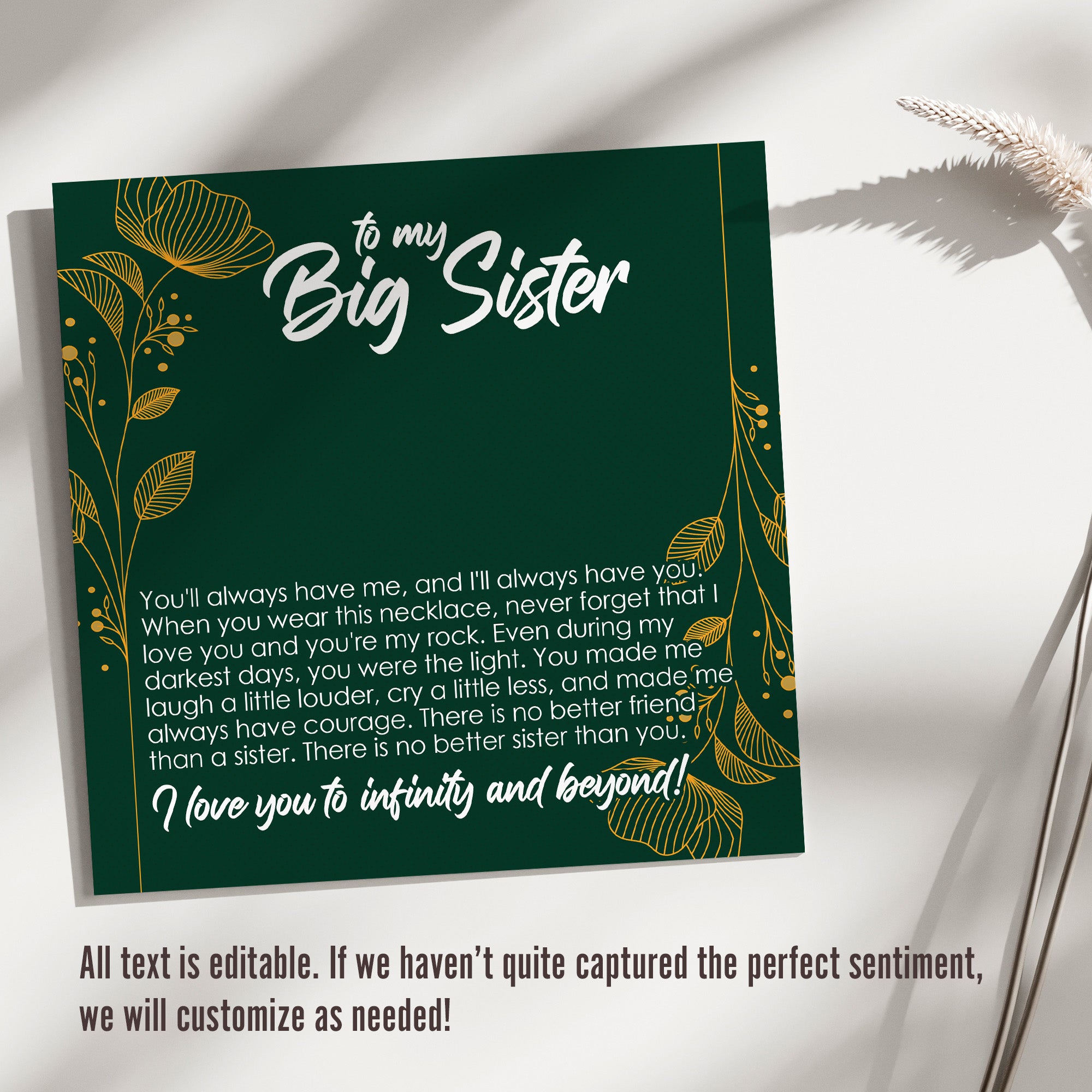 Celebrate the unbreakable bond with your sister with our exquisite Personalized Infinity Knot Necklace. This stunning piece is accompanied by a beautifully designed message card featuring bold, elegant typography and delicate floral patterns in rich greens and golds, creating a visually striking presentation.