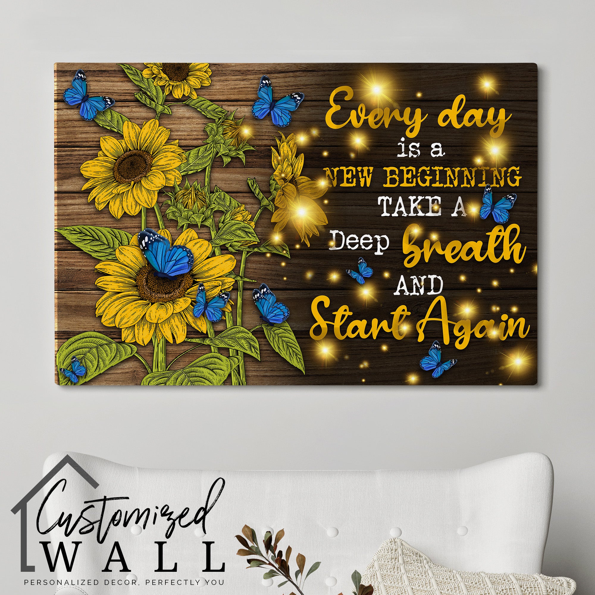 The message, "Every day is a new beginning. Take a deep breath and start again," is elegantly printed, offering daily encouragement and motivation. Personalize this canvas with your name, a special date, or a unique message to make it truly yours. This customization adds a heartfelt touch, turning it into a one-of-a-kind gift perfect for birthdays, housewarmings, or special occasions.