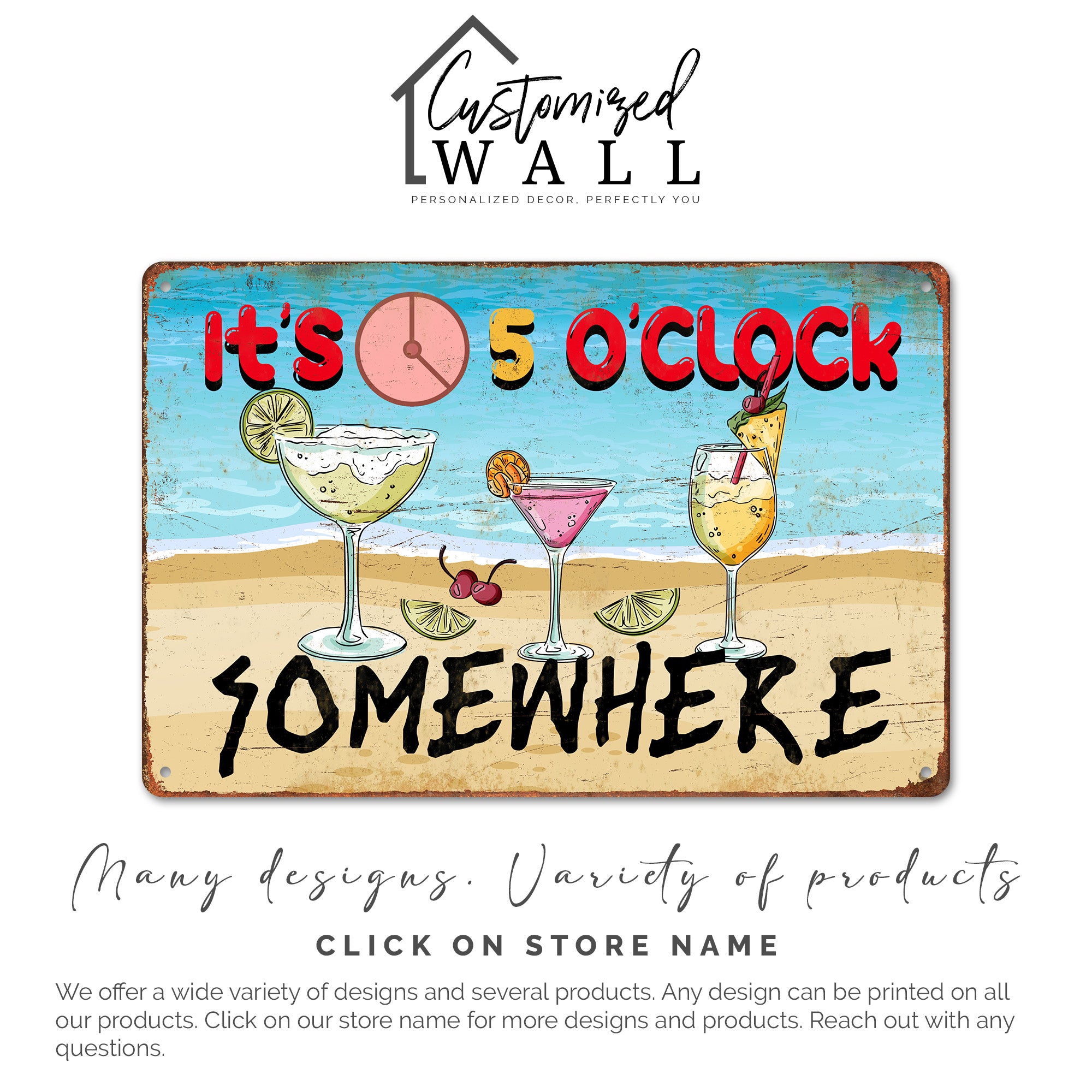 Add a touch of beachy charm and whimsy to your space with this handmade "It's 5 O'Clock Somewhere" metal sign. Meticulously crafted from high-quality metal, this wall decor combines vibrant colors with playful beach imagery, featuring a trio of cocktails set against a serene seaside backdrop. The bold red and black lettering pops on the bright blue background, creating an eye-catching piece perfect for any home bar, kitchen, or outdoor patio.