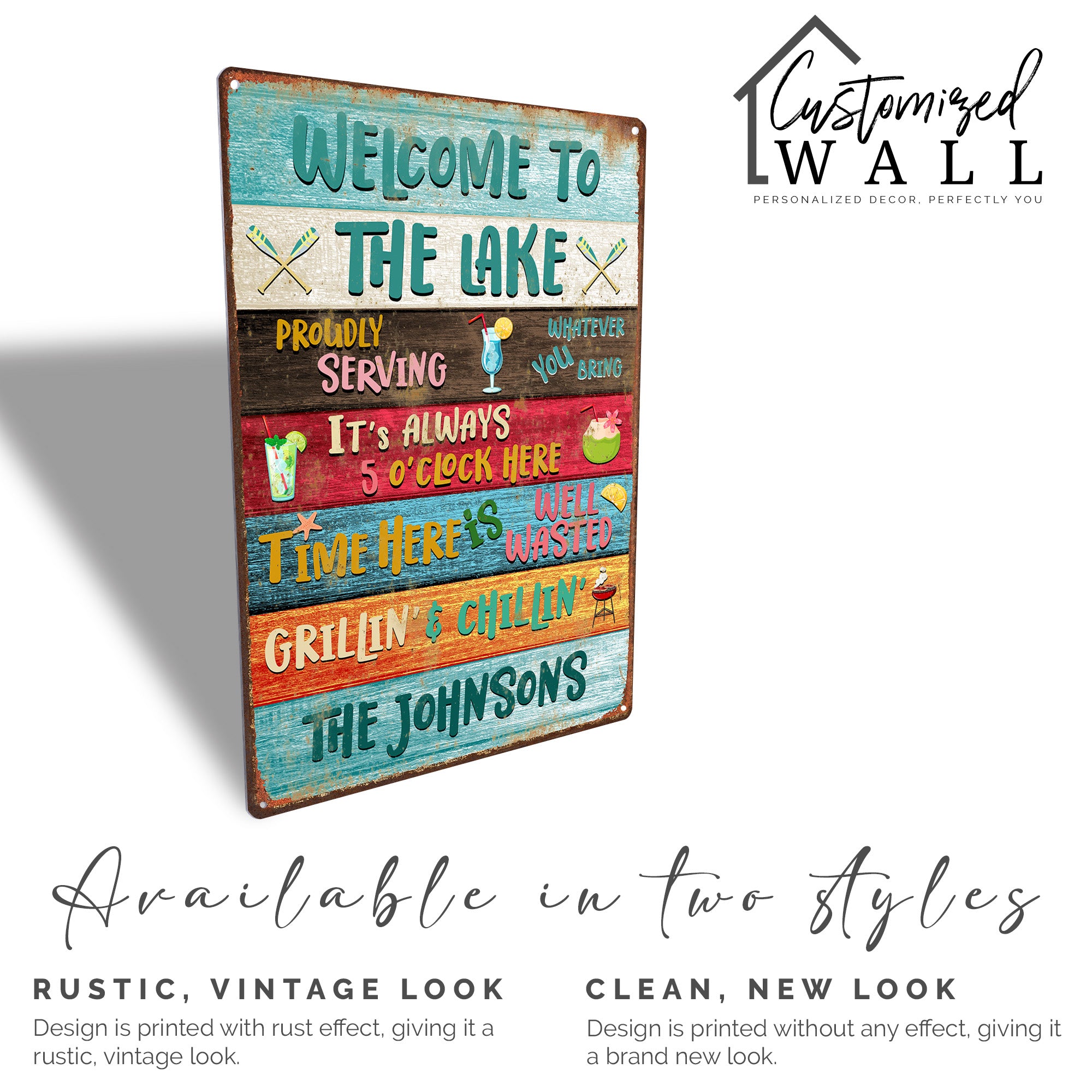 Embrace the spirit of lake living and create lasting memories with this delightful, personalized metal sign. Let it tell your family's story of lazy afternoons and lively nights by the water.