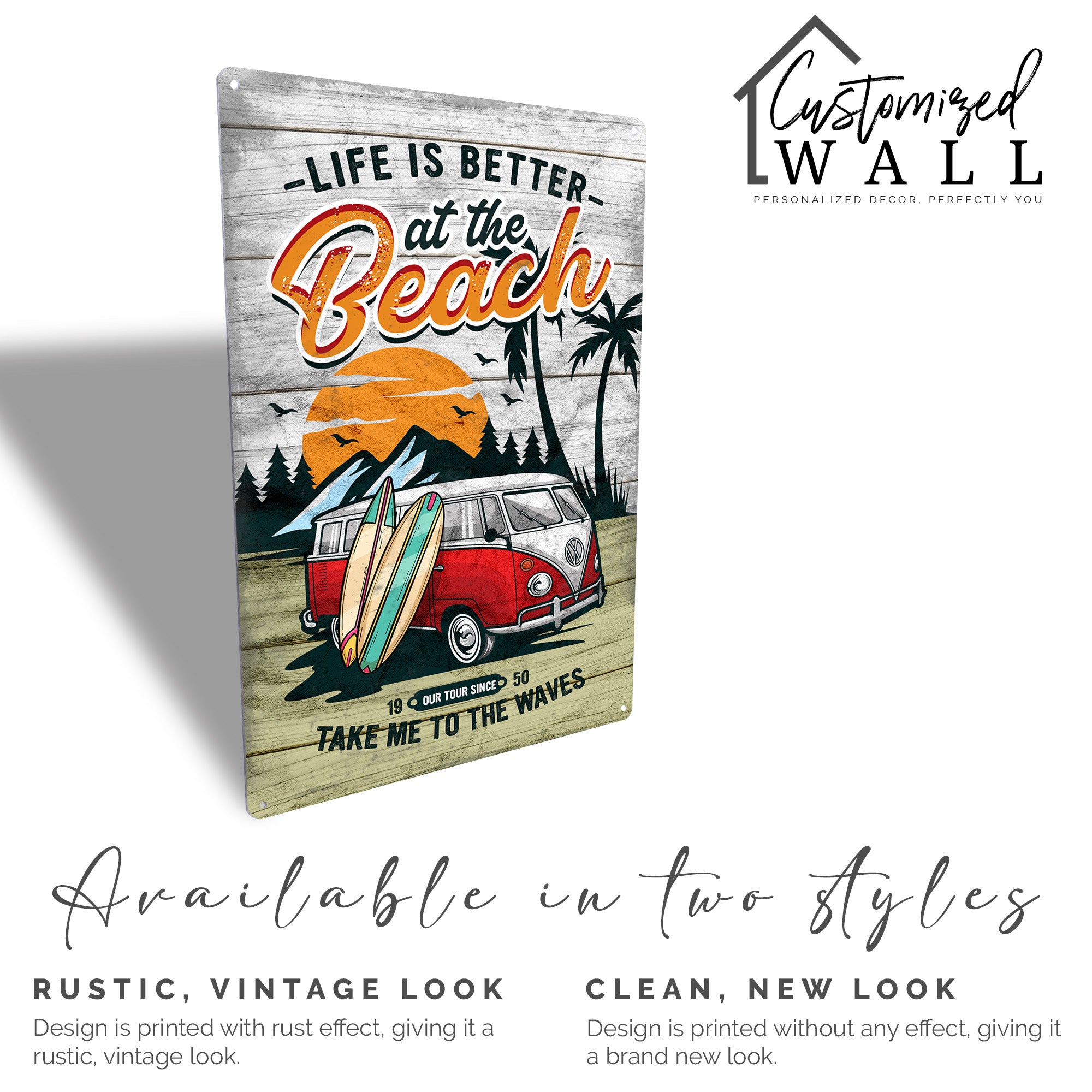 Bring the spirit of the beach to your space with our personalized "Life is Better at the Beach" Metal Sign. Featuring vibrant colors and retro design elements, this sign showcases a classic red surf van and sunlit beach scene, complete with palm trees and surfboards. Perfect for surf lovers, adventurers, and anyone with a love for the ocean, this piece of art is an uplifting reminder of sunny days and ocean waves.