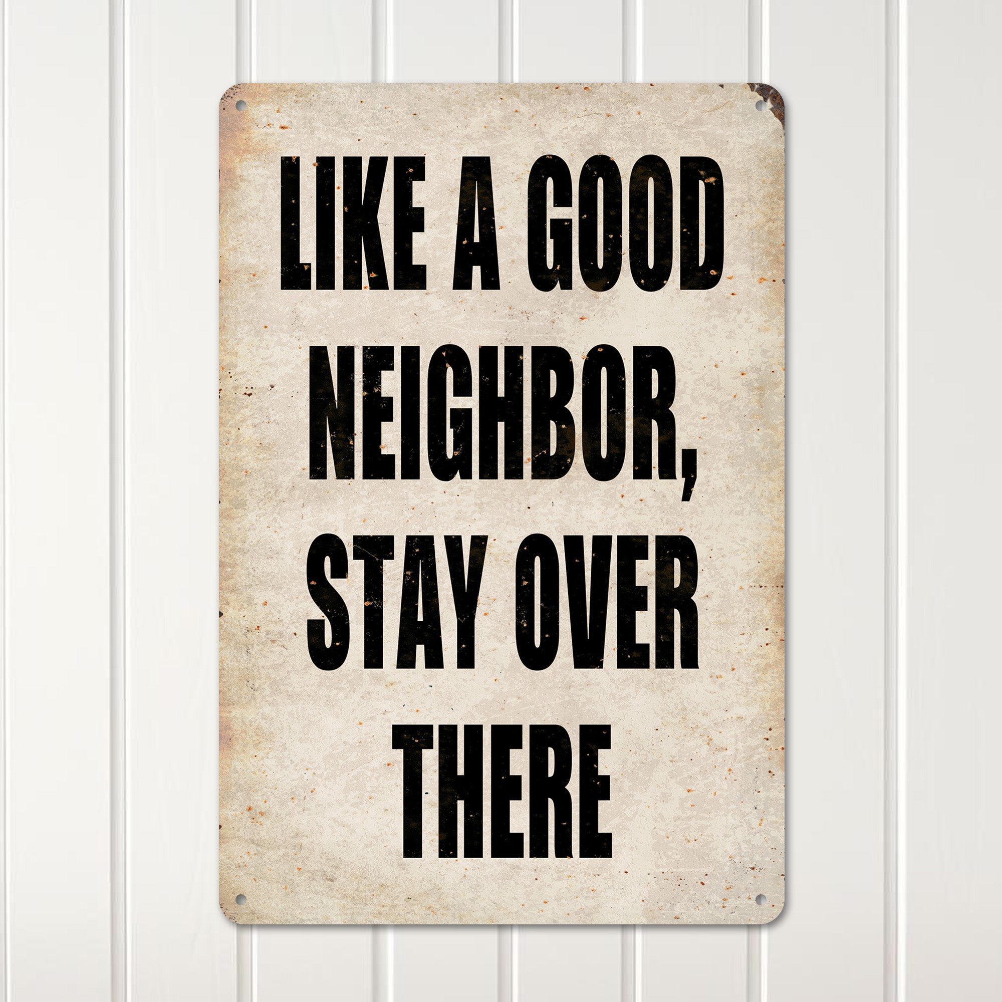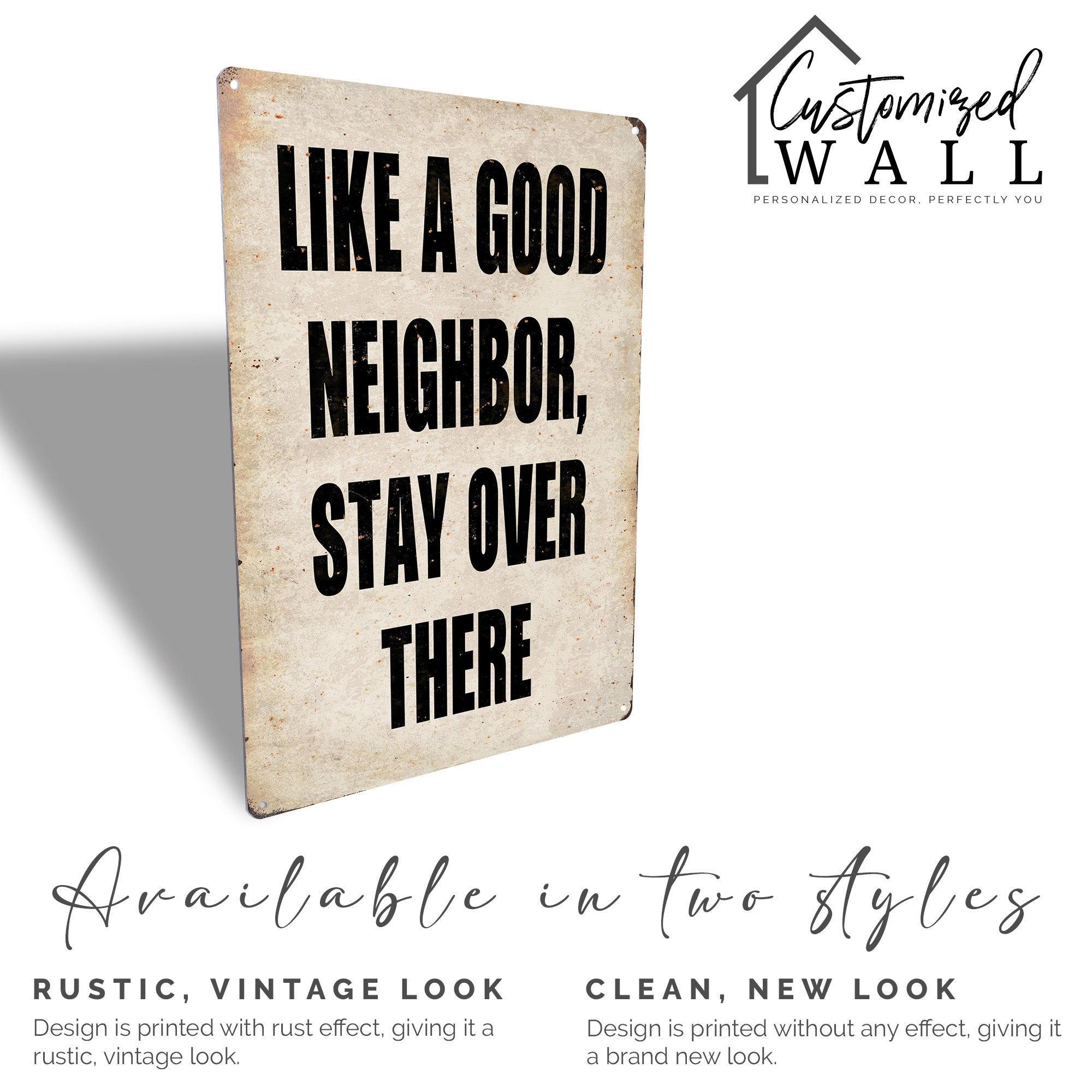 Introduce a touch of humor and charm to your living space with our "Like a Good Neighbor, Stay Over There" Metal Sign, skillfully crafted for those who appreciate a lighthearted approach. This horizontal metal sign features bold black lettering on a vintage, weathered background, adding a rustic touch to your decor.