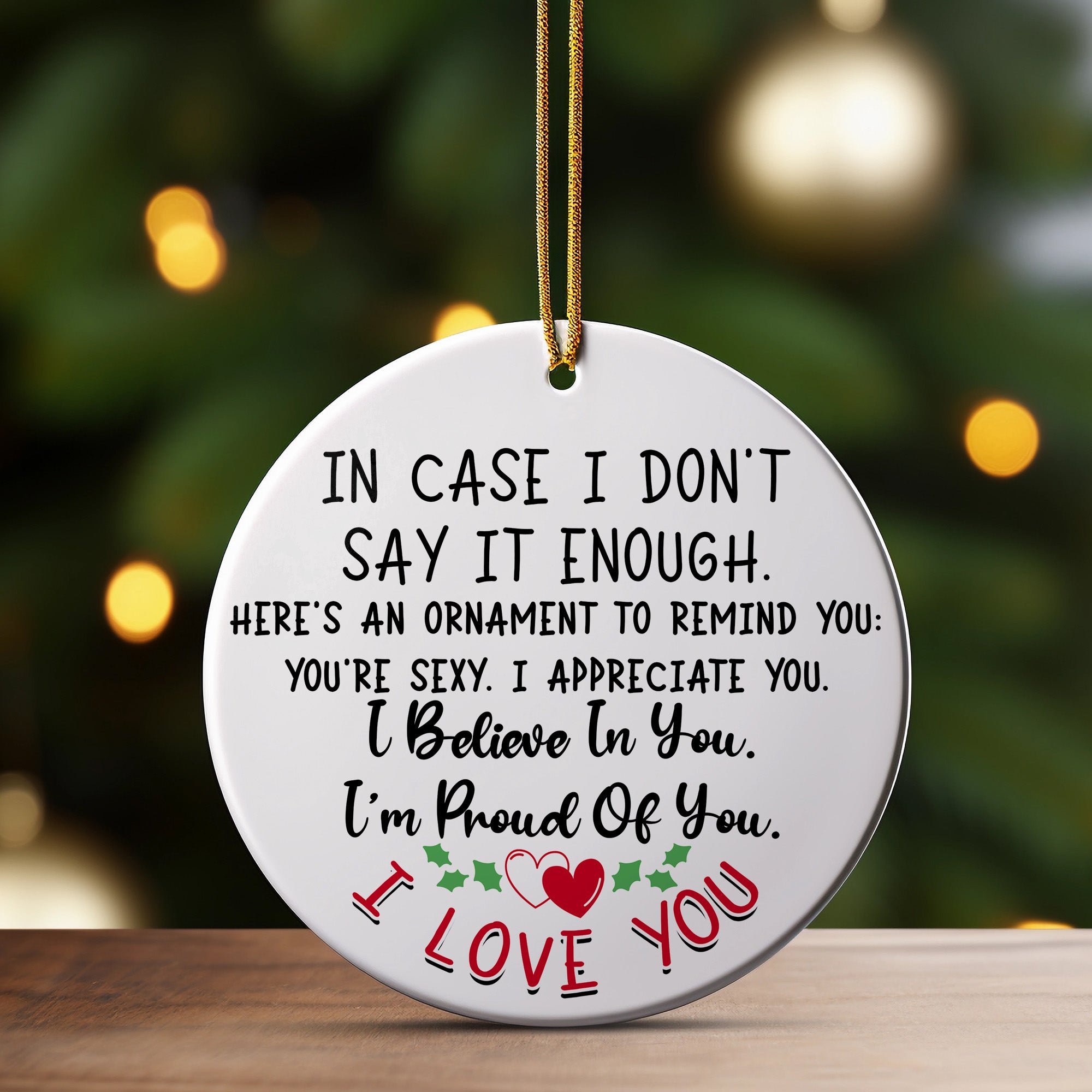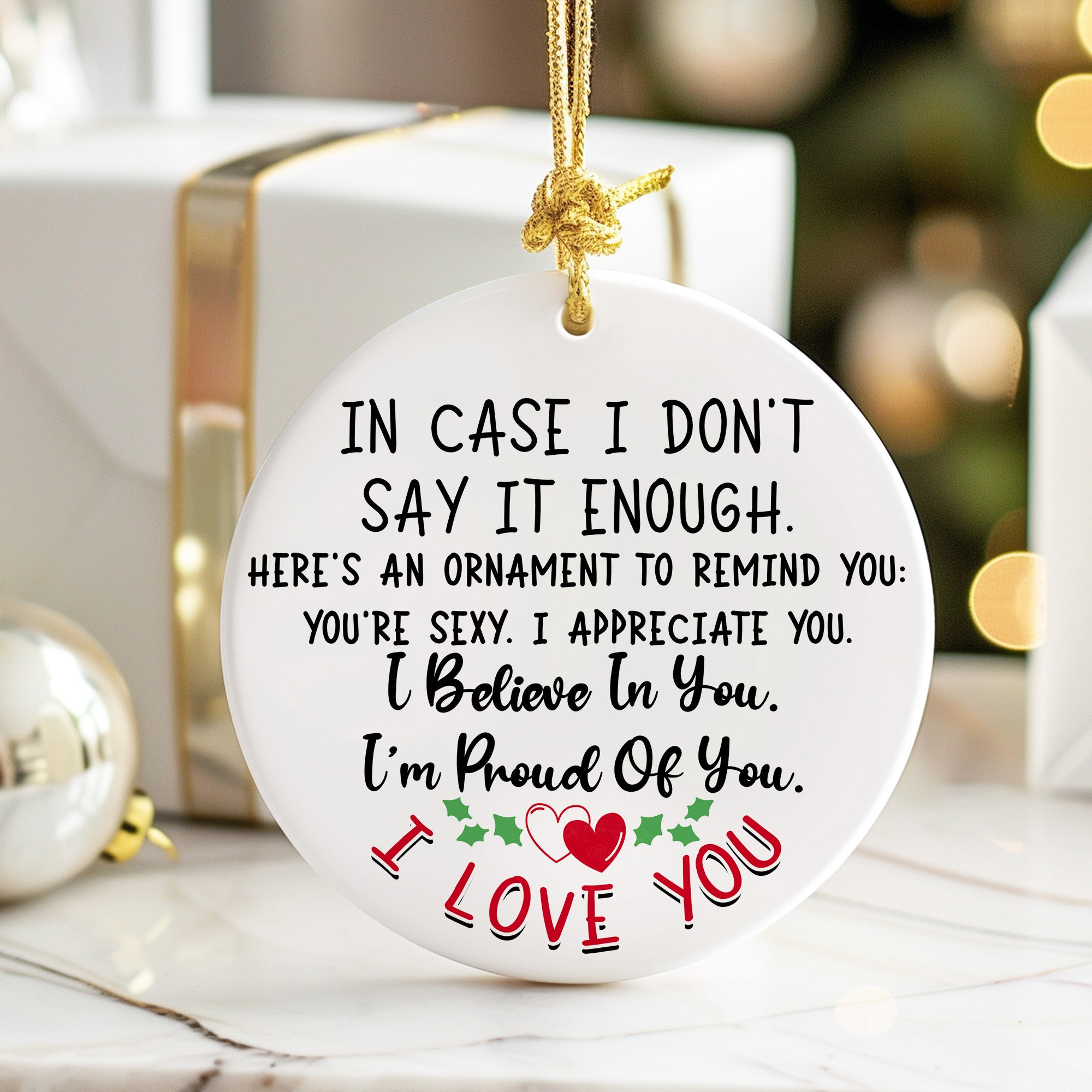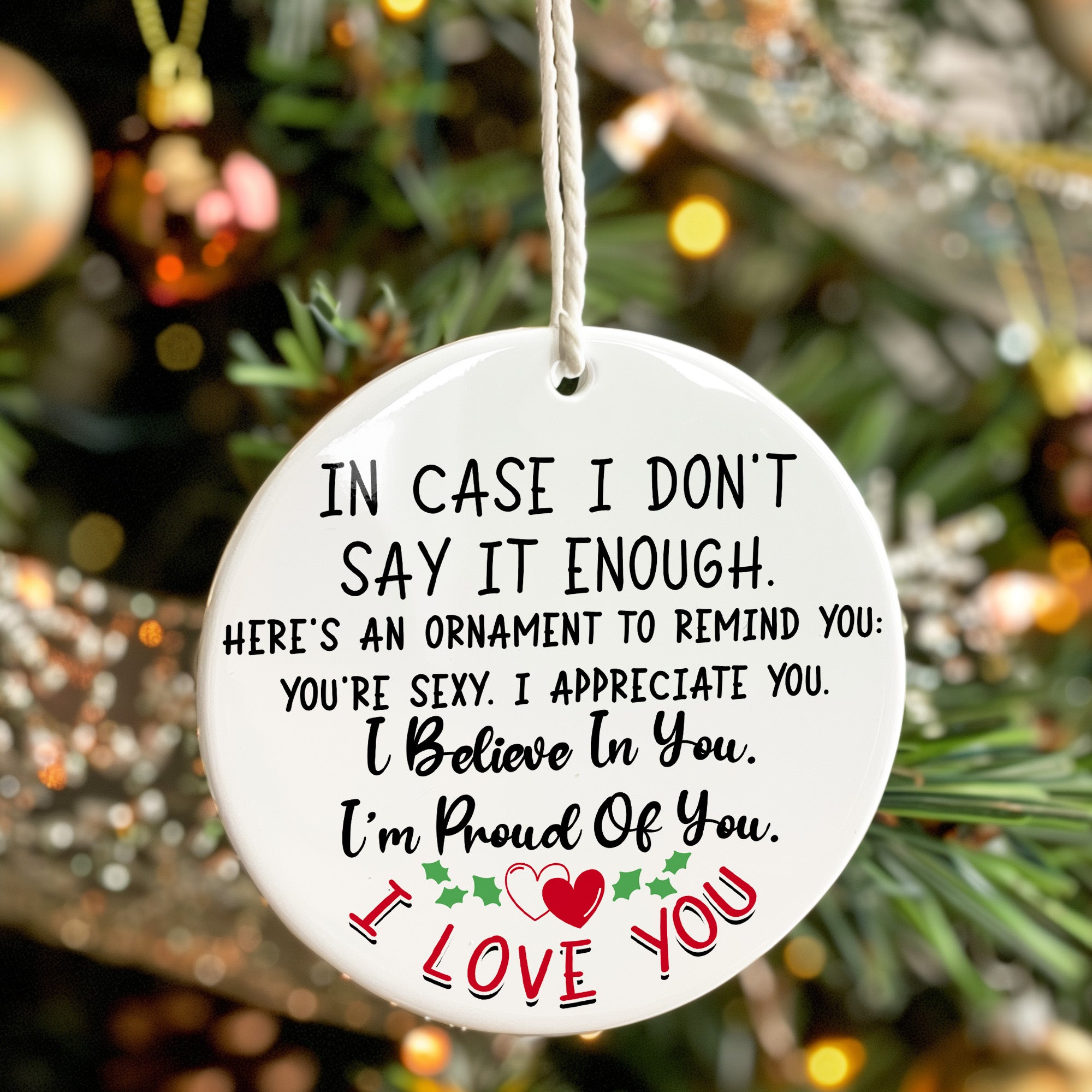 This beautifully handcrafted ceramic ornament is the perfect reminder of love and appreciation. Designed with elegant black and red typography on a crisp white background, it bears a heartfelt message: "In Case I Don't Say It Enough. Here's an Ornament to Remind You: You're Sexy. I Appreciate You. I Believe In You. I'm Proud Of You. I Love You." Adorned with charming holly motifs and two interlocking hearts, it's the ideal blend of festive spirit and personal warmth.