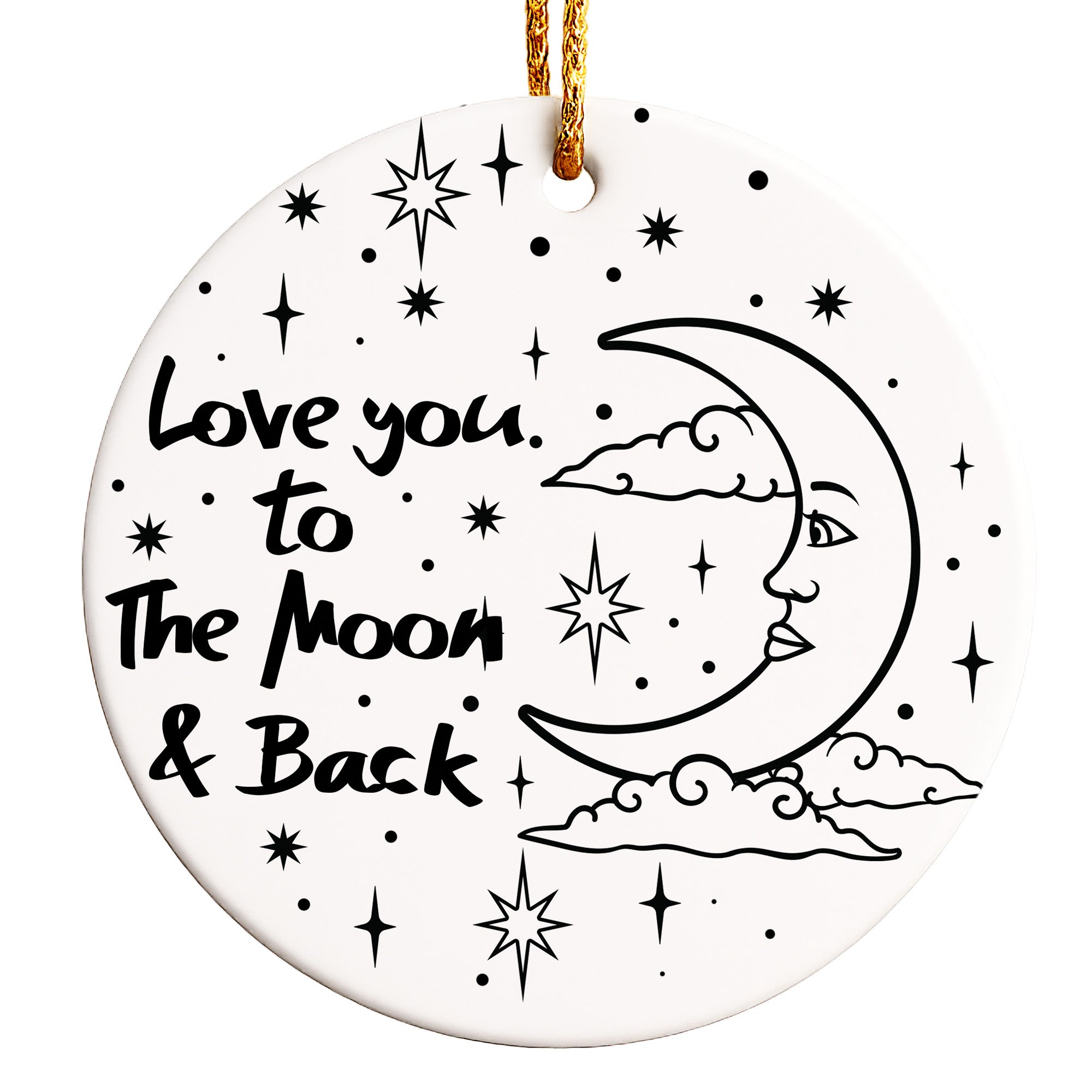 TAGS: personalized ornament, love you to the moon and back, ceramic ornament, handmade gift, customized keepsake, anniversary gift, Valentine's Day, gift for mom, gift for sister, gift for partner, sentimental ornament, elegant decoration, handcrafted piece, special occasion ornament, heartfelt message