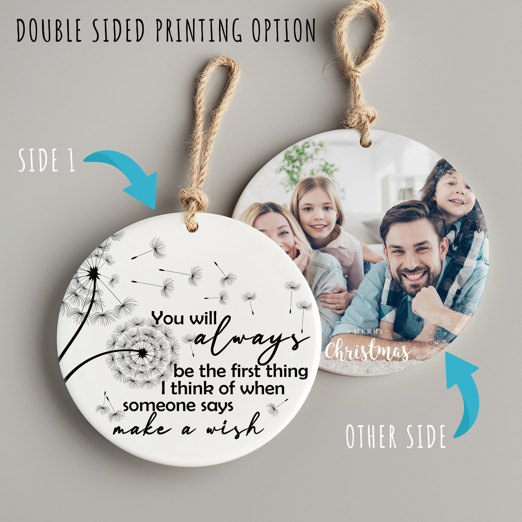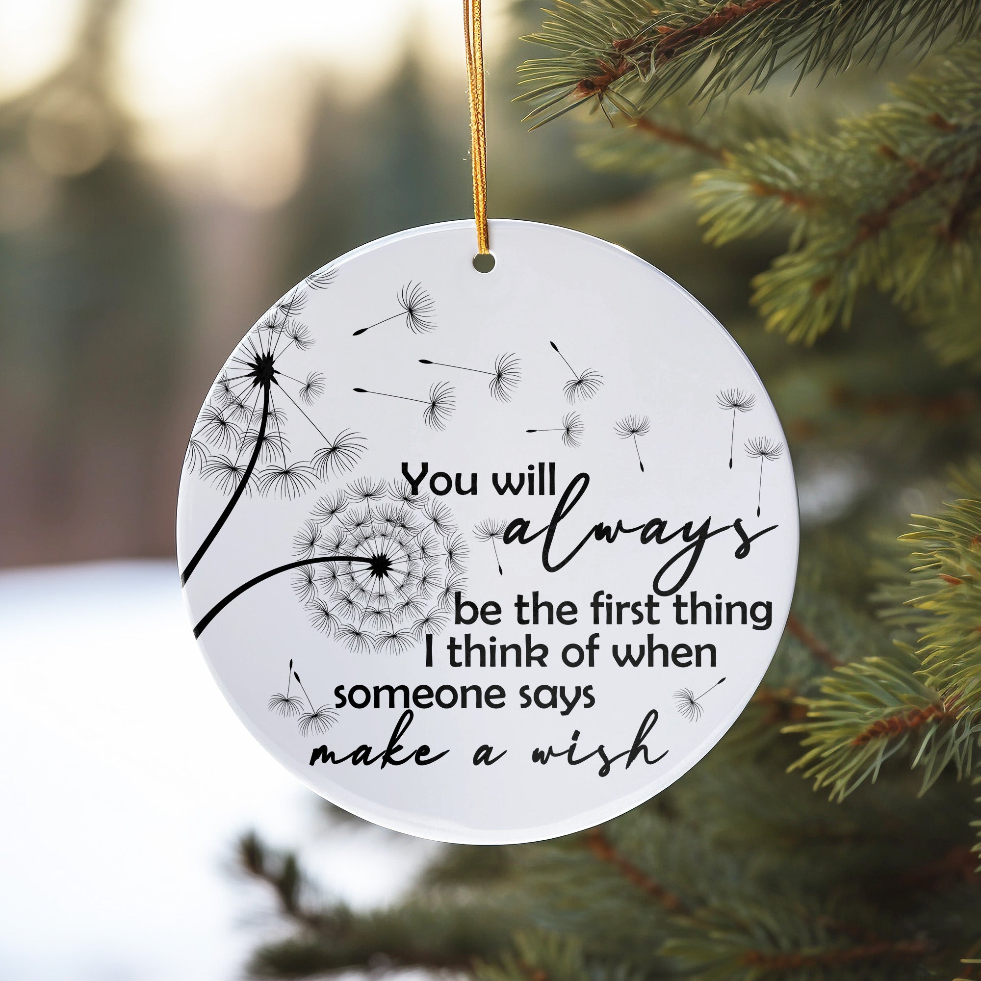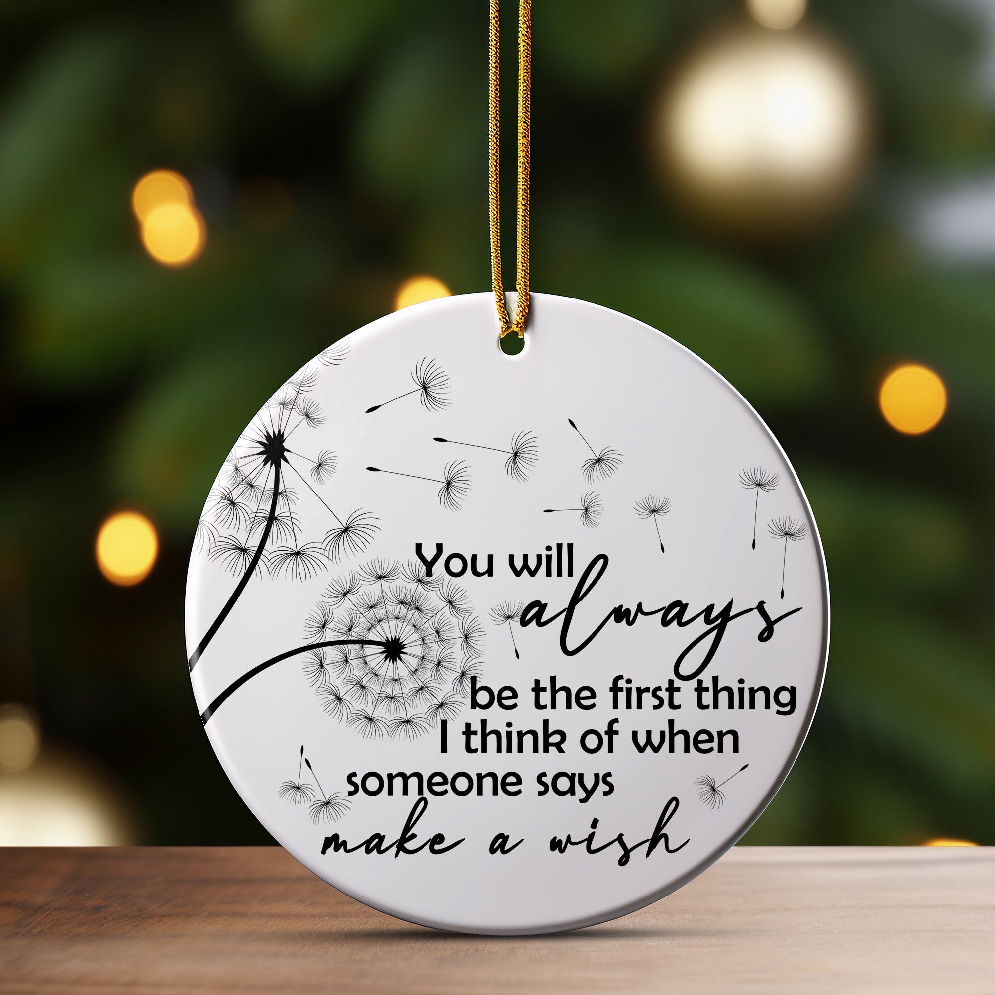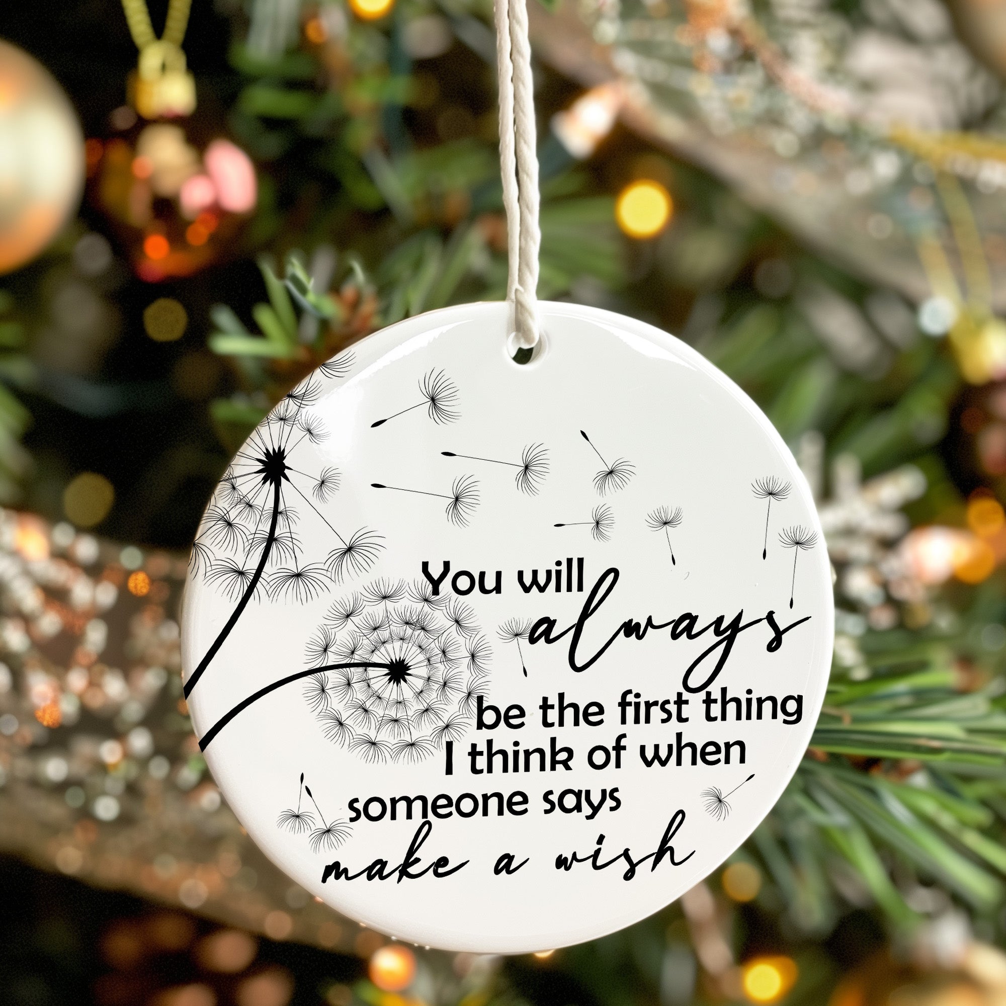 TAGS: personalized ornament, ceramic keepsake, handmade gift, heartfelt message, gift for mom, sister gift, dandelion design, make a wish ornament, customizable present, sentimental gift, holiday decor, unique ornament, meaningful gift, memorable keepsake, high-quality ceramic