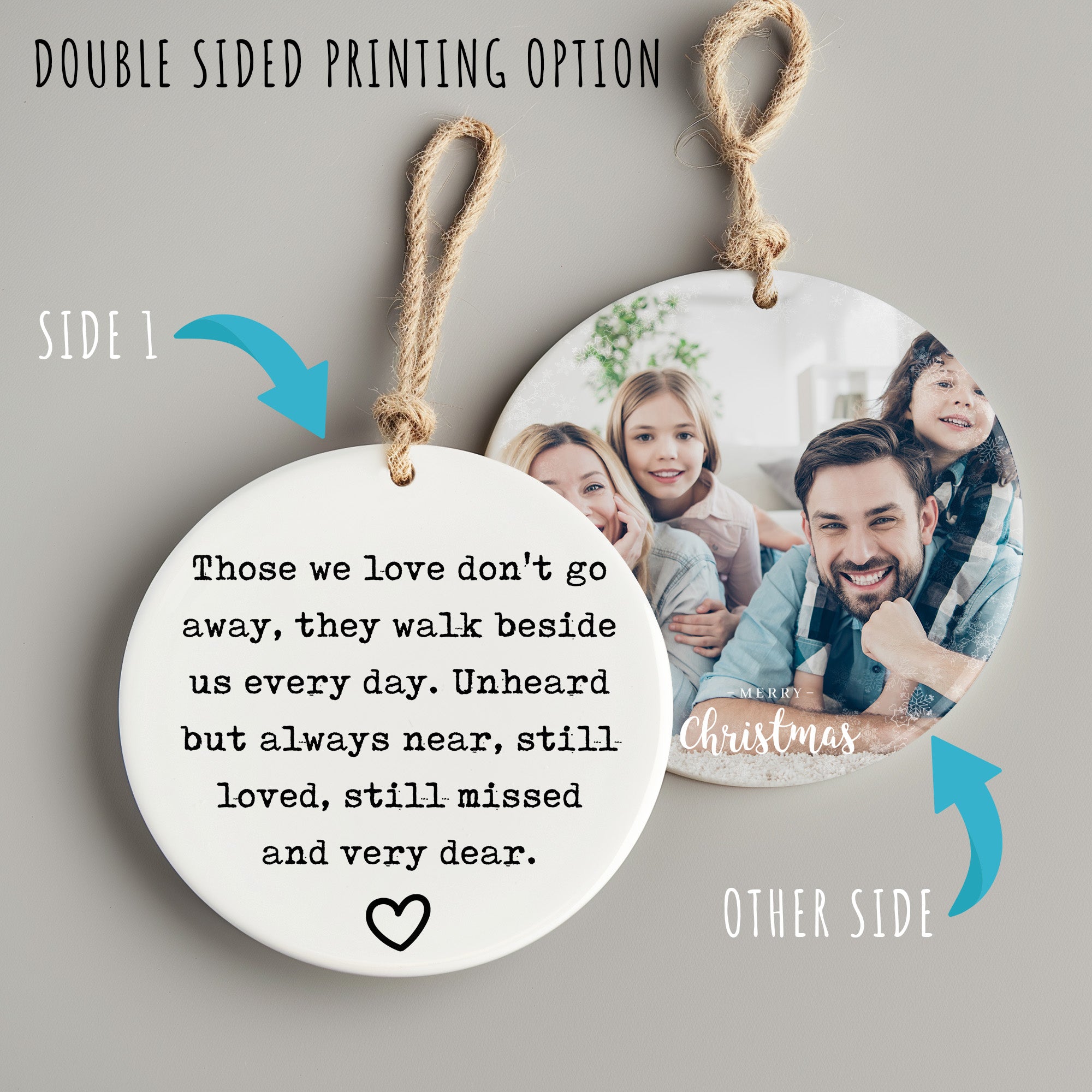 Discover the perfect way to honor and cherish the memory of loved ones with our Personalized Memorial Ceramic Ornament. This beautifully crafted ornament features an inspiring quote: "Those we love don't go away, they walk beside us every day. Unheard but always near, still loved, still missed, and very dear." Encased in a pure white glaze, this ornament elegantly displays the heartfelt message in black typewriter-style lettering, complemented by a simple heart symbol, creating a soothing and touching tribute.