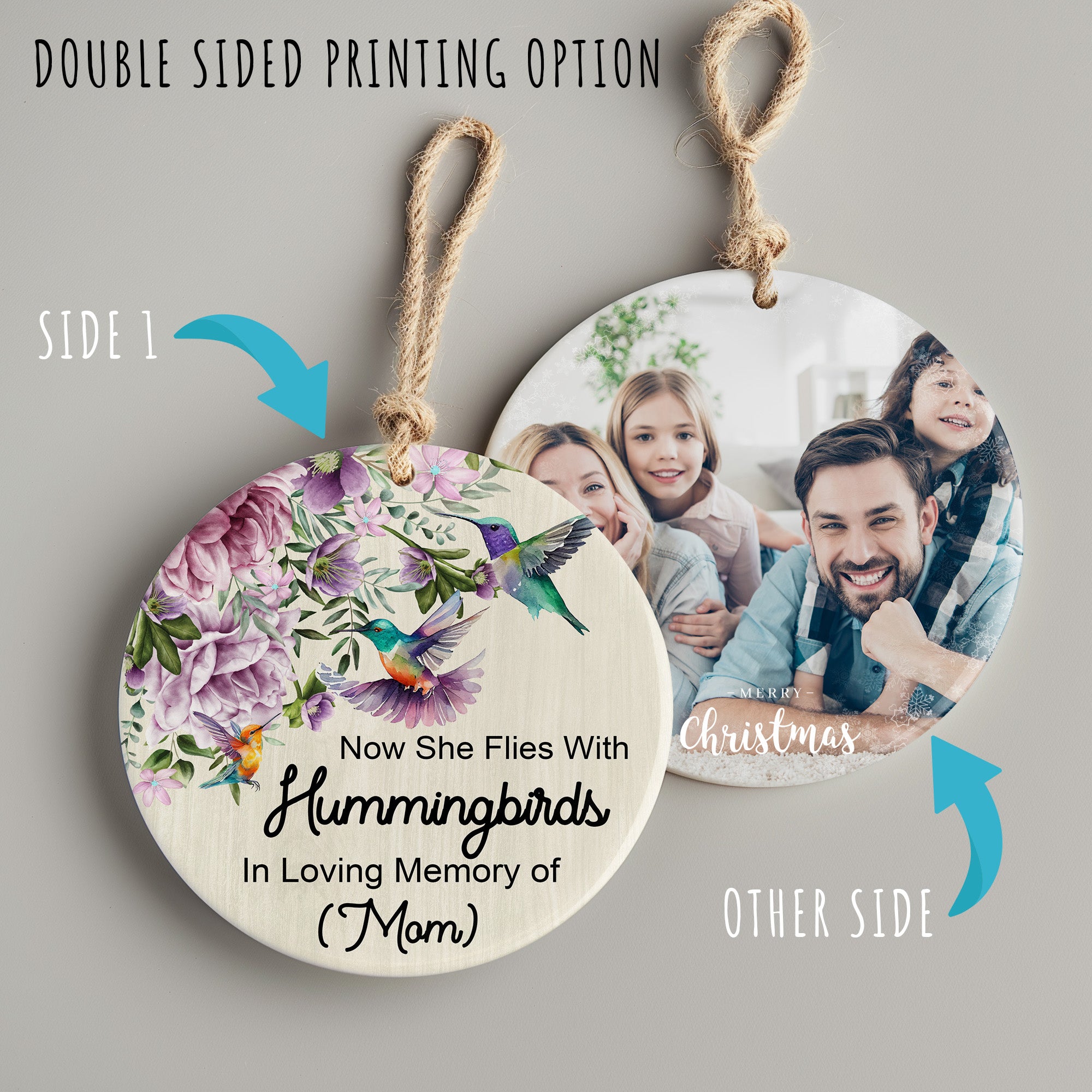 **TAGS:** memorial ornament, personalized gift, tribute to mom, remembrance ornament, hummingbird decoration, floral ceramic, custom keepsake, sympathy gift, memory ornament, bereavement gift, holiday ornament, memorial gift, loss of mother, celebration of life, handmade ornament