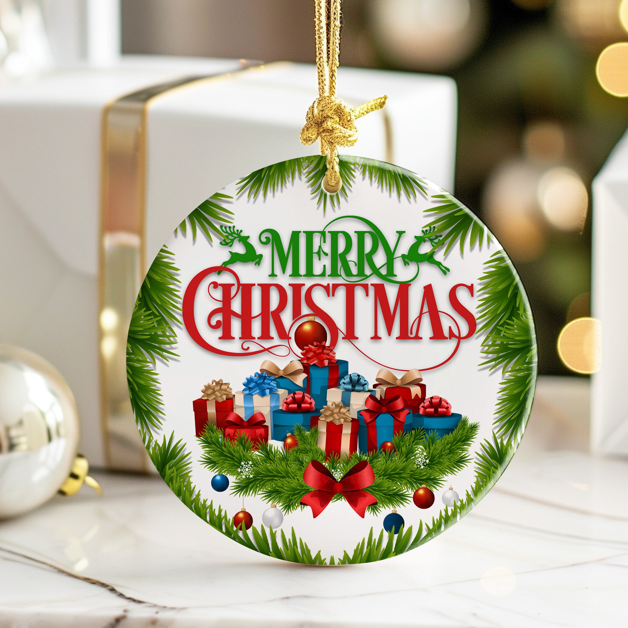 Featuring vibrant colors of red, green, and gold, the ornament is elegantly decorated with a classic "Merry Christmas" message, surrounded by charming gift boxes and seasonal greenery imagery. The intricate design captures the joyful essence of the holidays, giving your décor an extra festive touch.