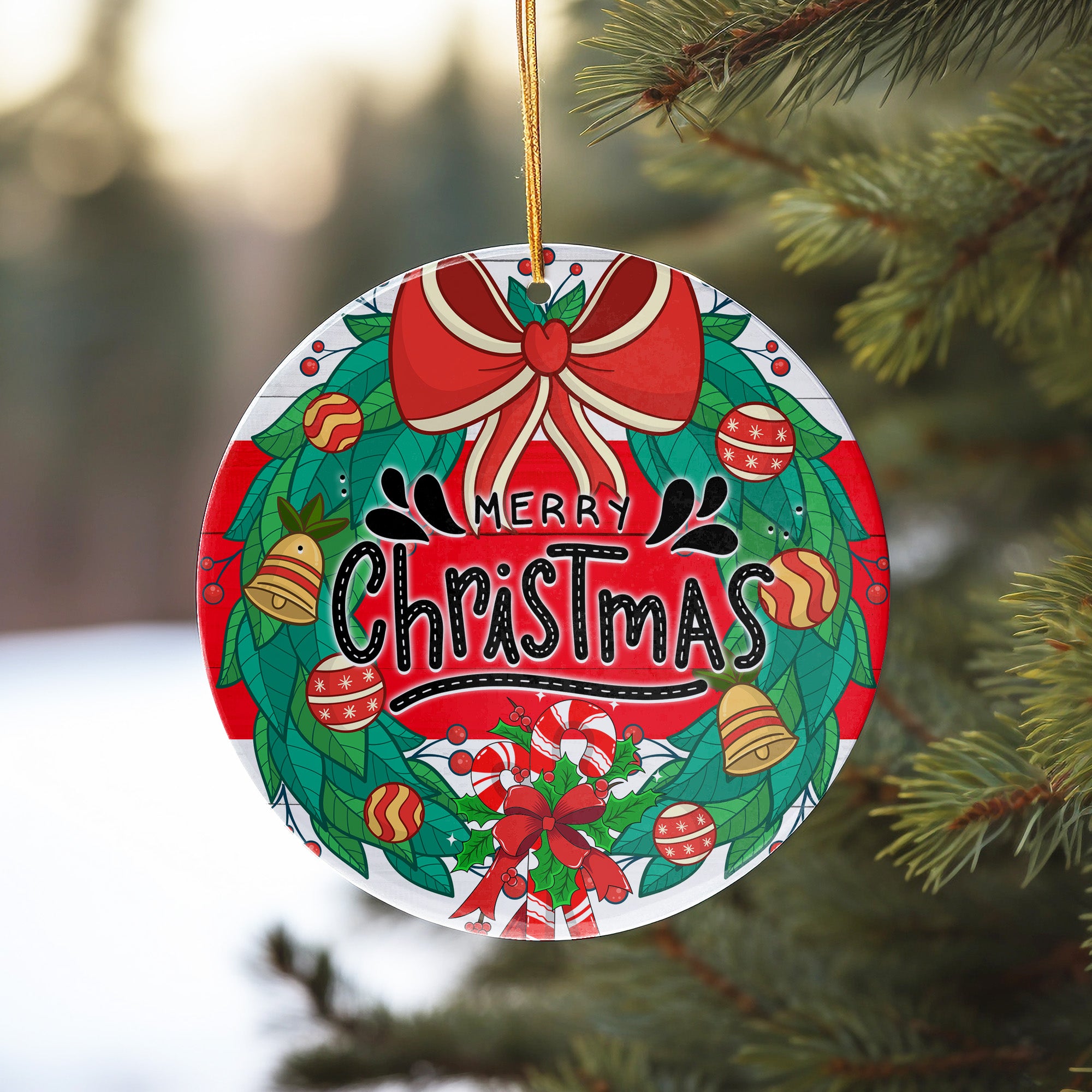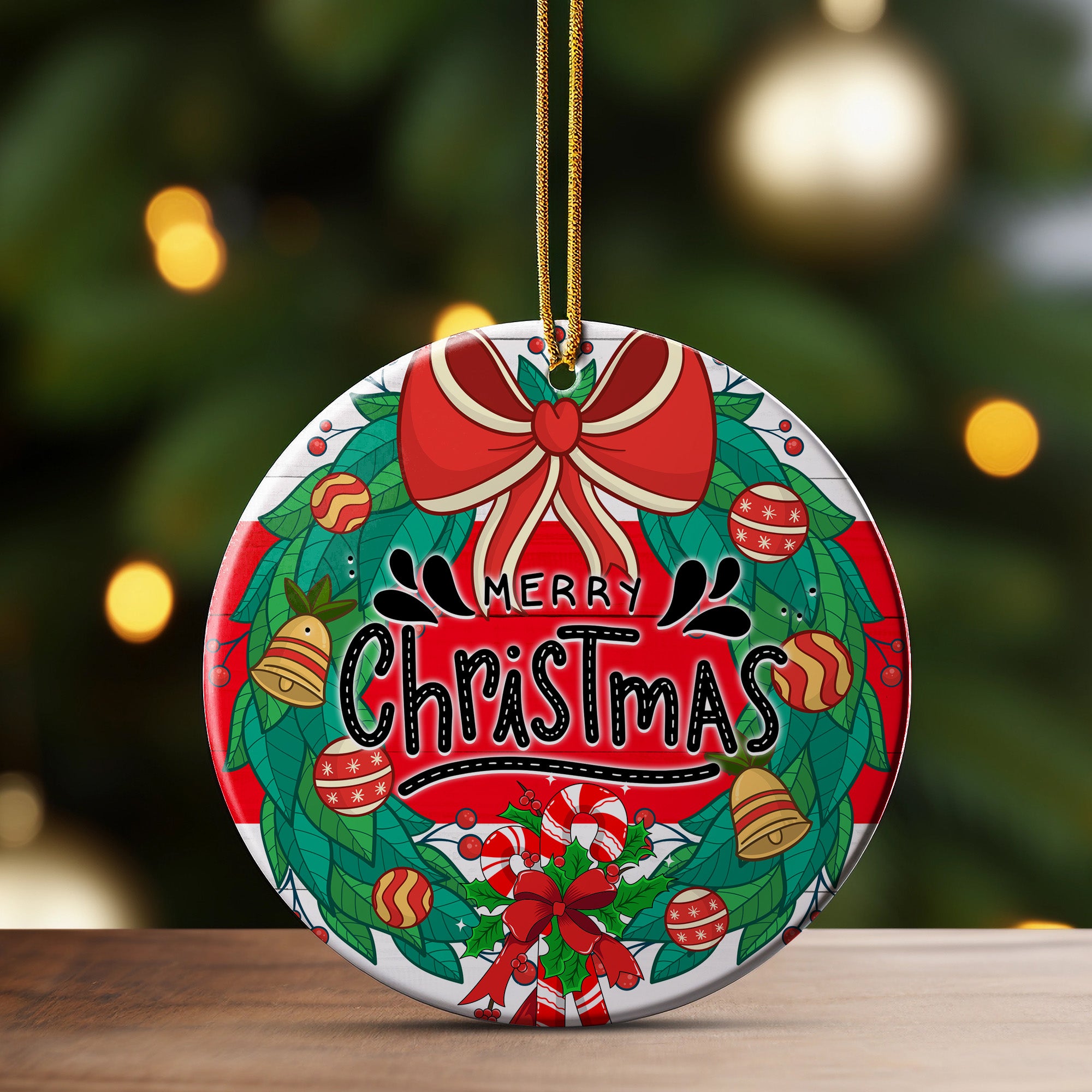 Celebrate the joy of the season with our exquisite Personalized Merry Christmas Ceramic Ornament. This handcrafted ornament captures the essence of holiday cheer with its vibrant design and intricate details. Featuring a lush wreath complete with red and green hues, candy canes, delicate ornaments, bells, and a beautiful red bow, this piece radiates festive spirit and elegance.