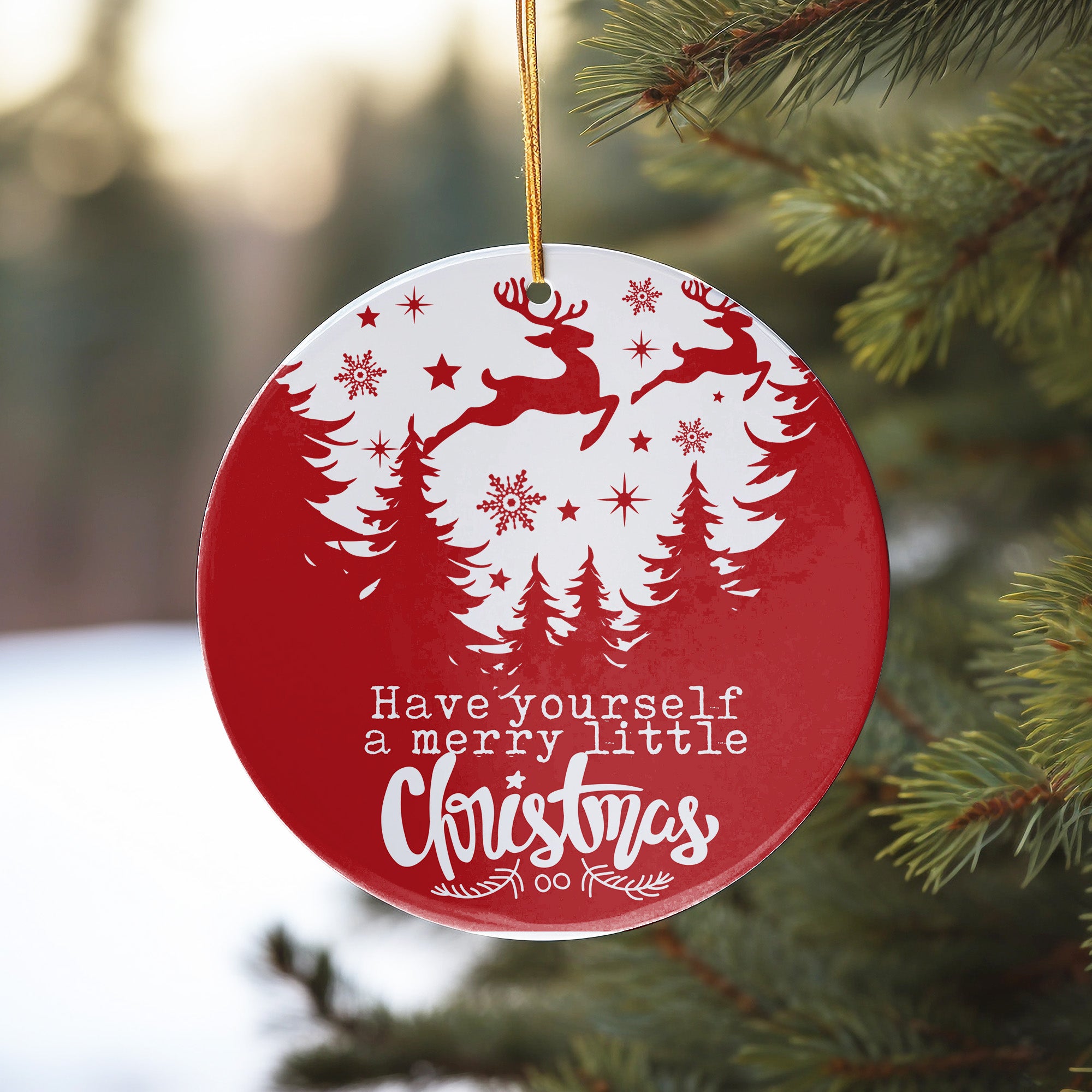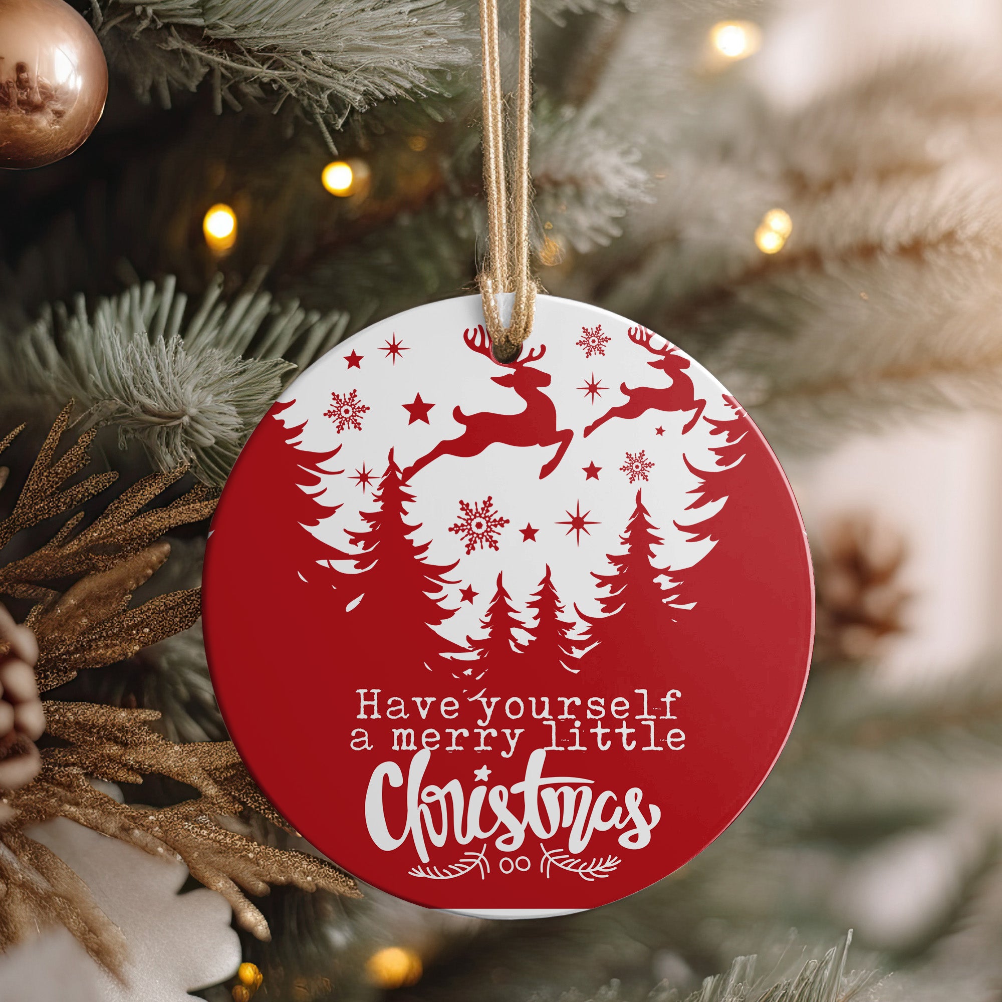 Bring the spirit of Christmas into your home with our Personalized Merry Little Christmas Ceramic Ornament. Crafted with care, this elegant ornament features a striking red and white design adorned with charming silhouettes of leaping reindeer and snow-dusted fir trees. The heartfelt message, "Have yourself a merry little Christmas," beautifully captures the joy of the season.