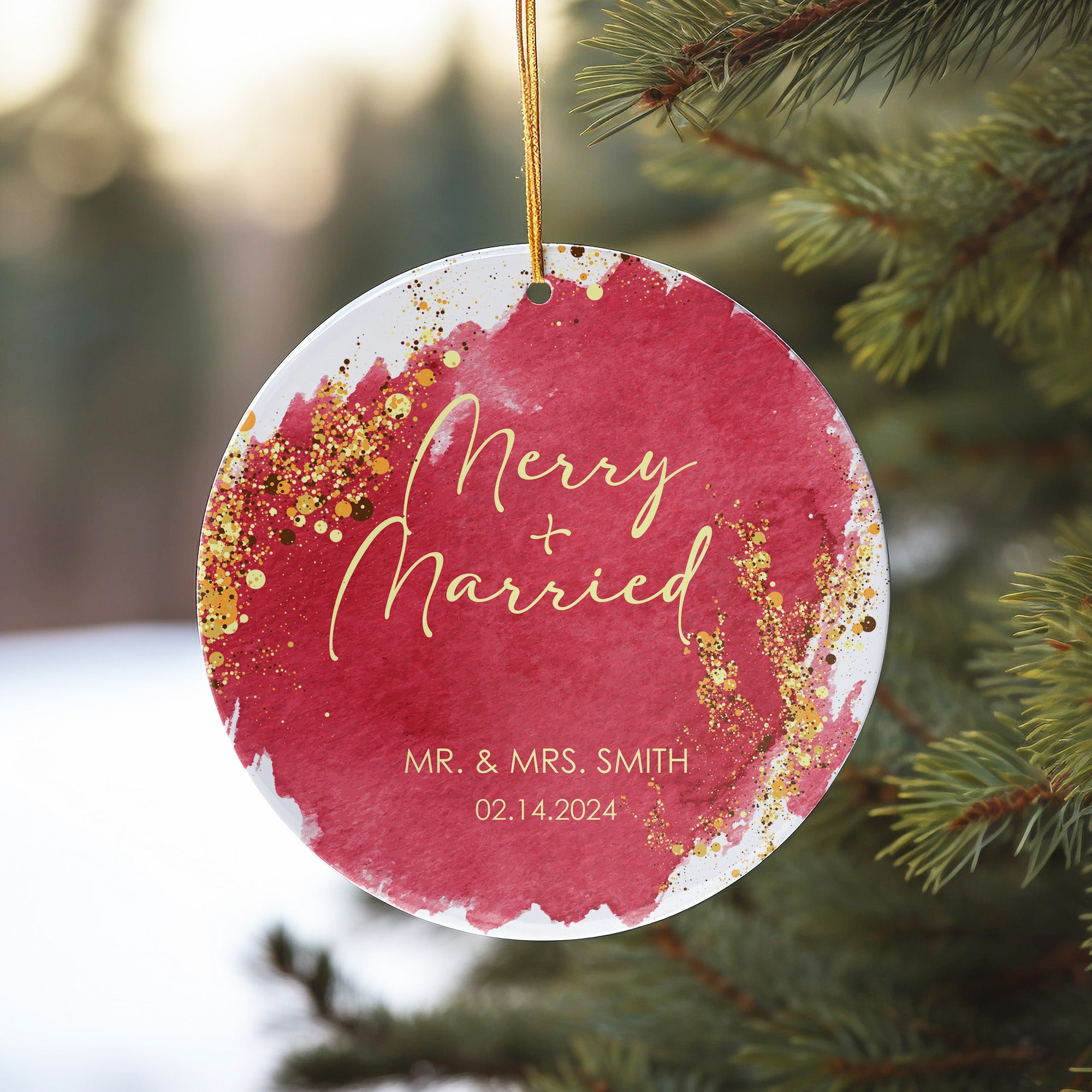 Celebrate love and unity with our "Merry + Married" personalized ceramic ornament, a charming keepsake that will forever hold the memory of your special day. Crafted from high-quality ceramic, this ornament boasts a beautiful watercolor design in rich red and gold tones, accented by luxurious gold splatter that adds a touch of elegance and festivity.