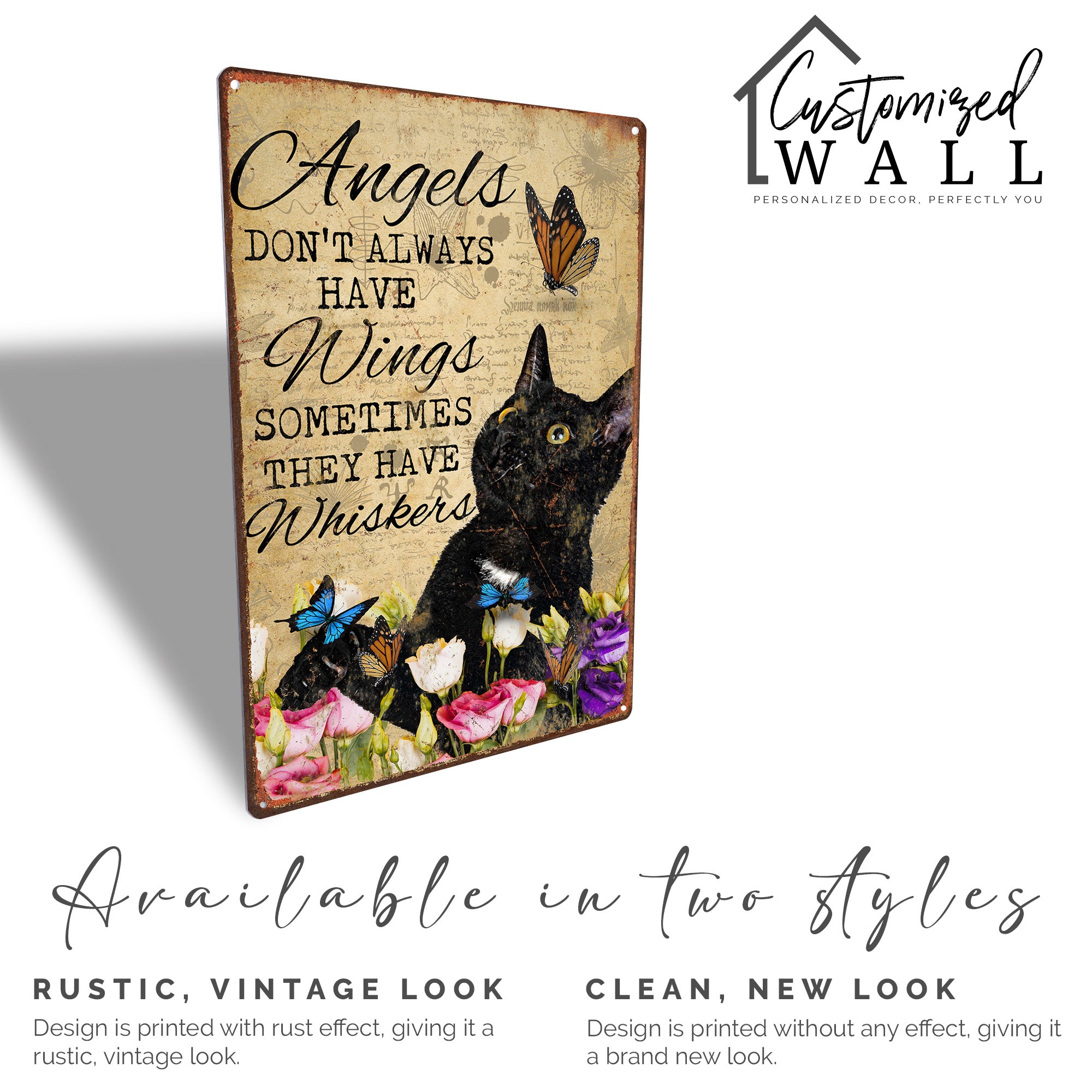 Discover the perfect blend of charm and personalization with our handcrafted metal sign featuring a heartwarming message and enchanting design. This exquisite piece showcases a striking black cat gazing thoughtfully at a butterfly, surrounded by vibrant flowers and butterflies. The inspirational quote, "Angels don't always have wings, sometimes they have whiskers," adds a touch of warmth and emotion, making it an ideal gift for any cat lover.