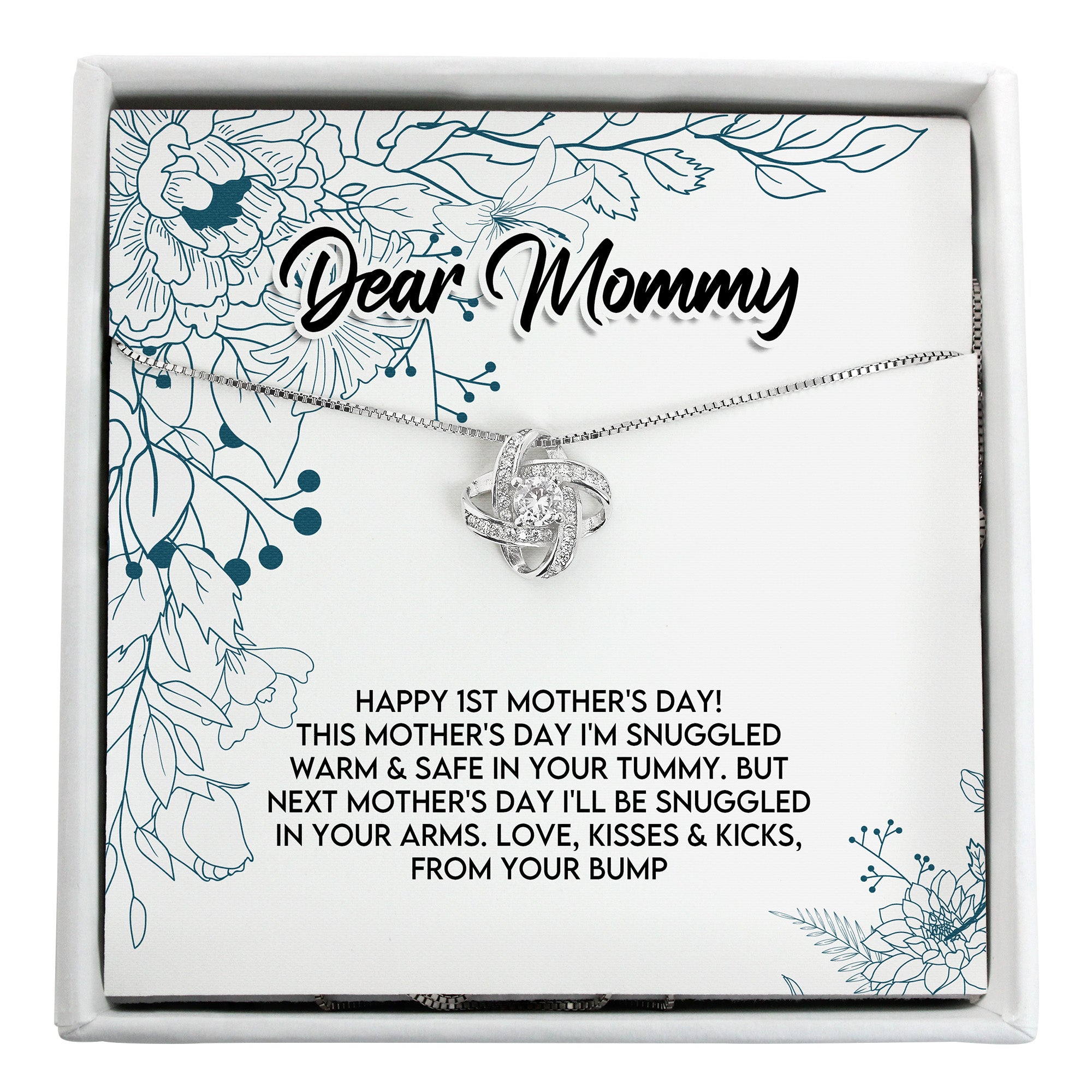 TAGS: Mother's Day gift, expecting mom gift, personalized necklace, first-time mom, pregnancy gift, sentimental jewelry, elegant keepsake, handmade necklace, quality craftsmanship, floral design card, customized message, gift for sister, gift for wife, mommy-to-be, emotional connection jewelry