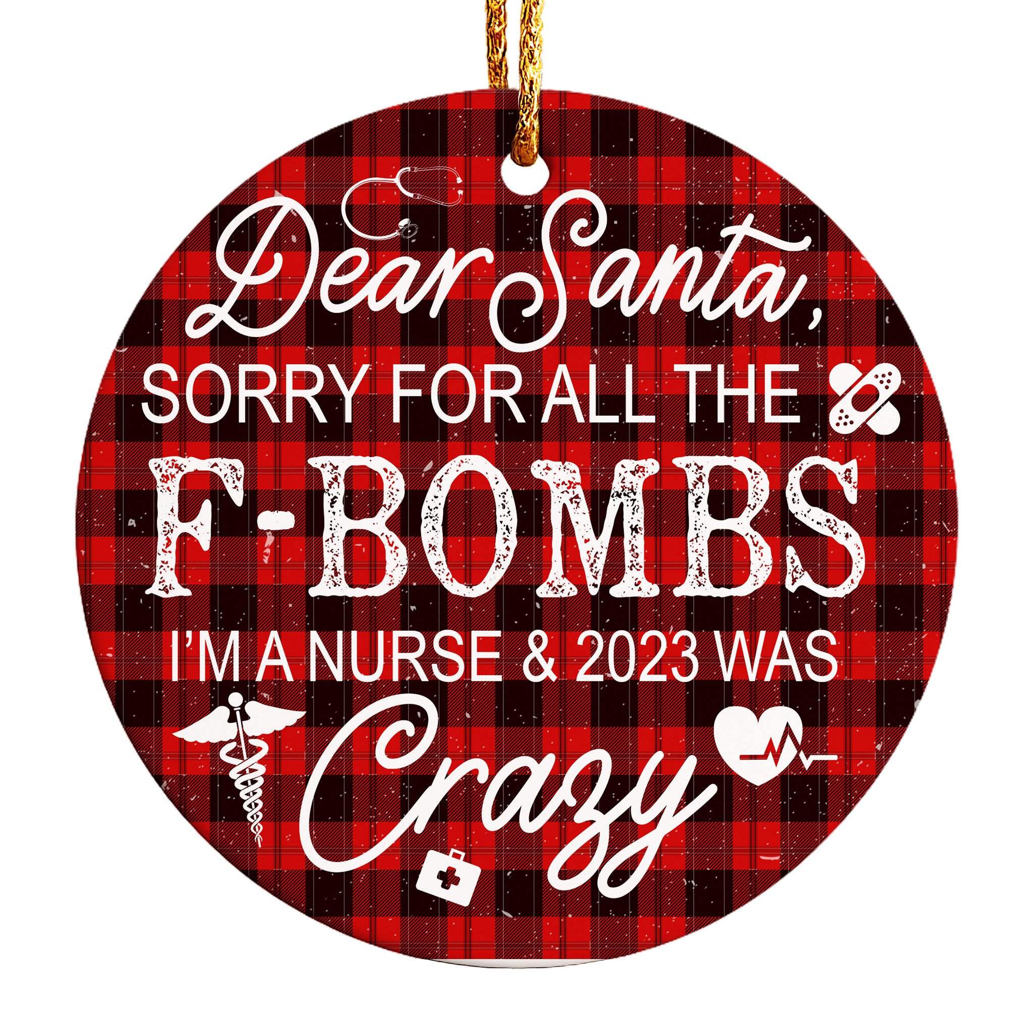 Embrace the spirit of humor this holiday season with our Personalized Nurse Christmas Ornament. Crafted with care from high-quality ceramic, this unique ornament features a classic red and black plaid pattern, embellished with playful text: "Dear Santa, Sorry for all the F-Bombs. I'm a Nurse & 2023 was Crazy." Perfect for the hardworking nurse in your life, this ornament blends heartfelt gratitude with a touch of humor.