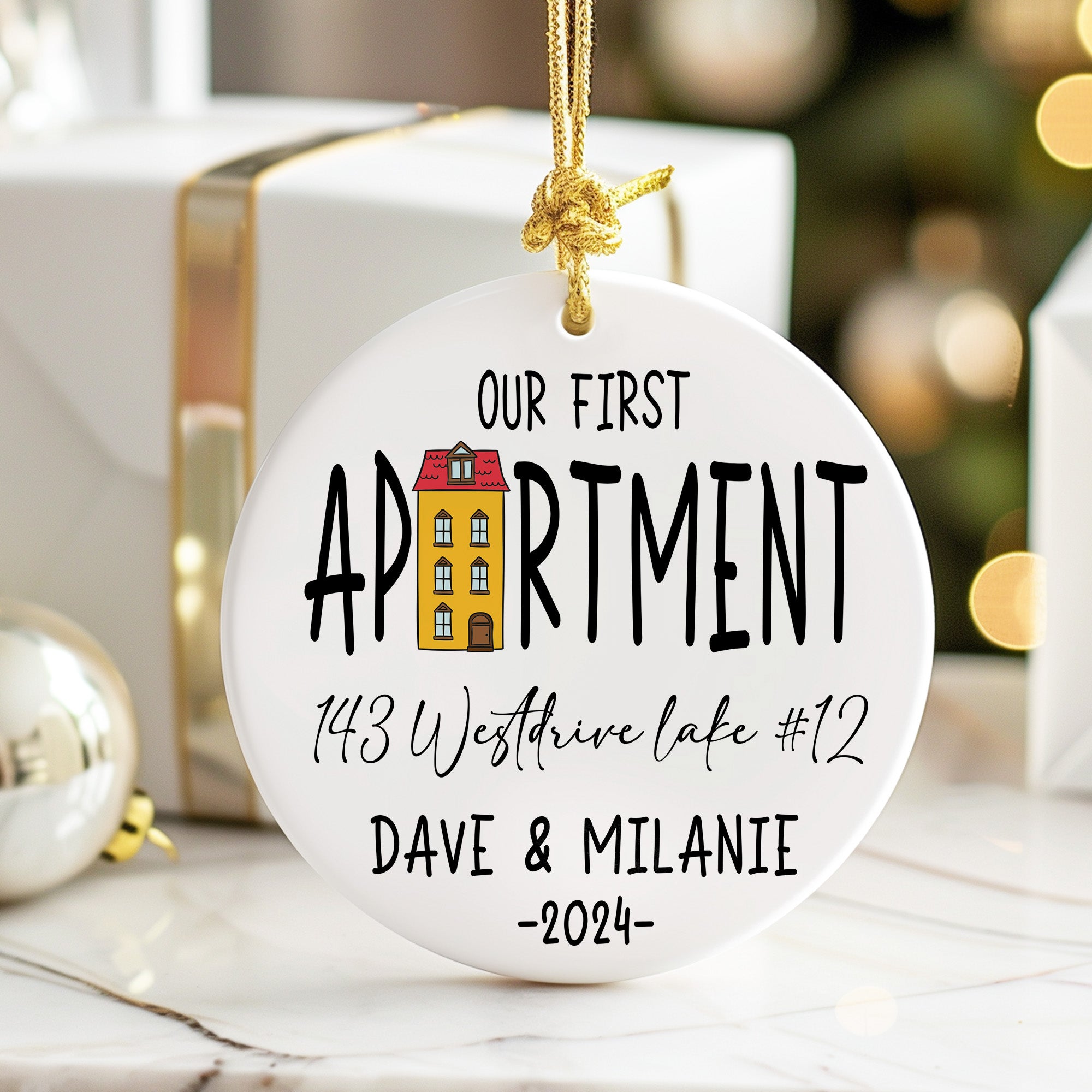 TAGS: personalized ornament, first apartment gift, new home keepsake, custom ceramic ornament, housewarming gift, handmade holiday decor, new homeowner, couple's first home, custom address ornament, first apartment memory, sentimental gift, unique Christmas ornament, gift for couples, 2024 keepsake, home decor accessory