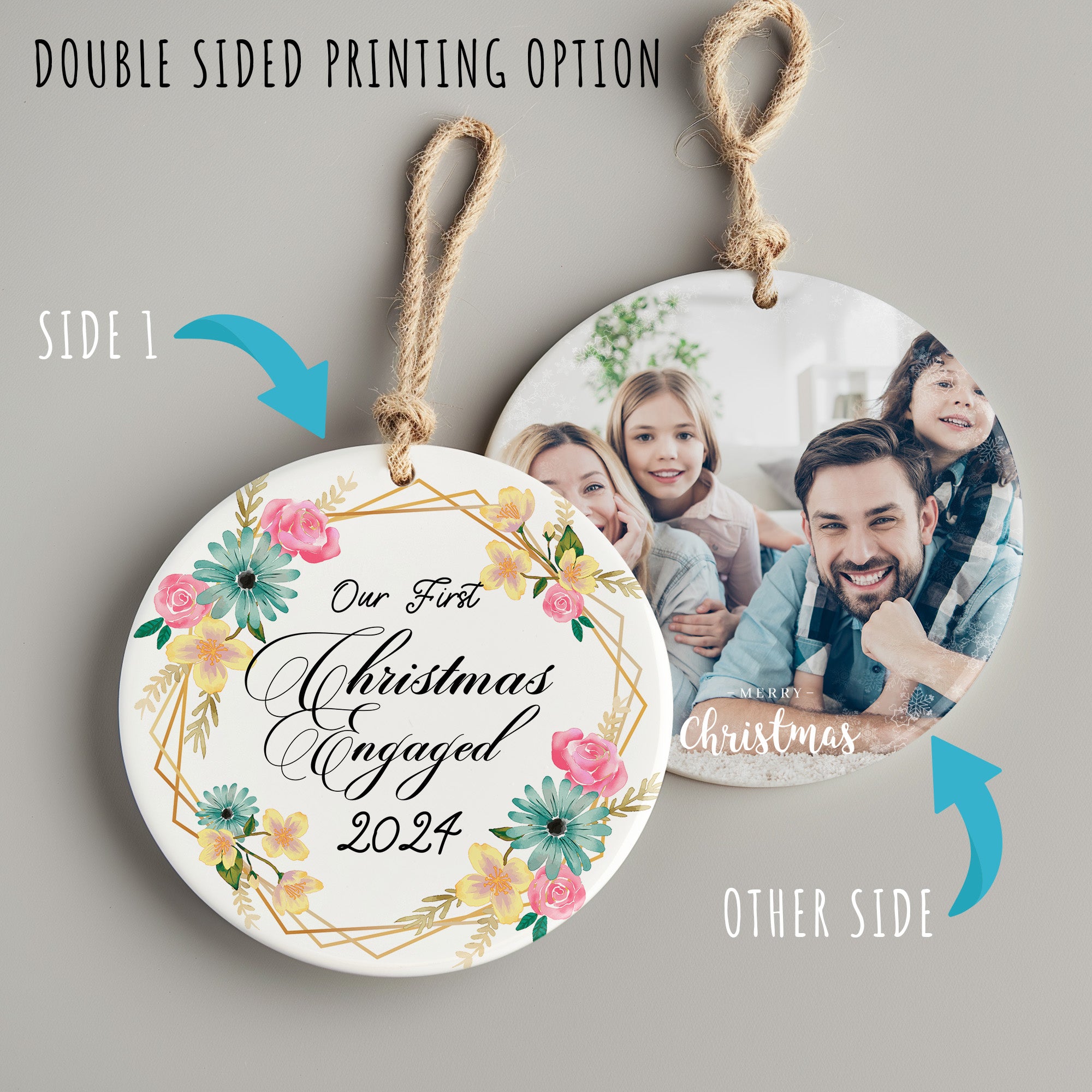 TAGS: personalized ornament, first Christmas engaged, engagement gift, floral ceramic ornament, handmade keepsake, holiday decoration, wedding keepsake, gift for couple, custom ornament, Christmas ornament 2024, engagement celebration, newly engaged, sentimental gift, newlyweds, engagement ornament