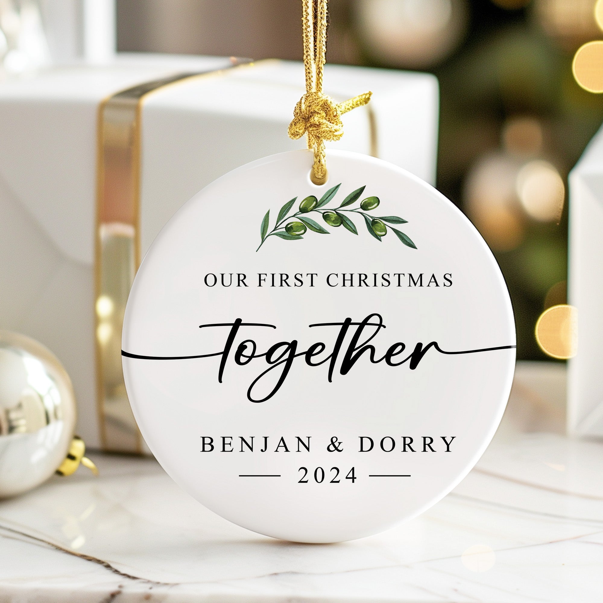 TAGS: personalized ornament, first Christmas together, couple's keepsake, ceramic ornament, 2024 Christmas gift, custom couple ornament, olive branch design, holiday decoration, personalized gift, first Christmas gift, newlywed ornament, couple's Christmas decoration, custom names ornament, romantic gift, handmade Christmas keepsake, mom gift, sister gift, newlyweds, personalized Christmas tree ornament.