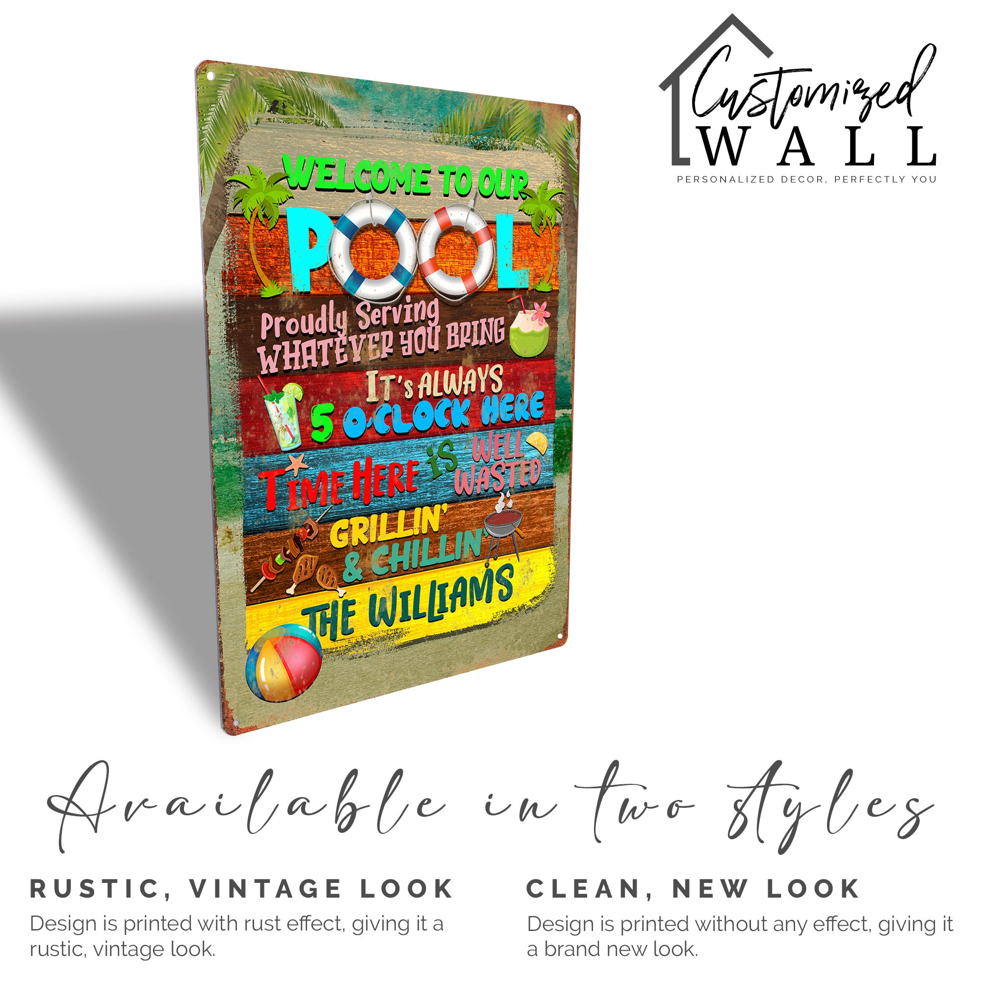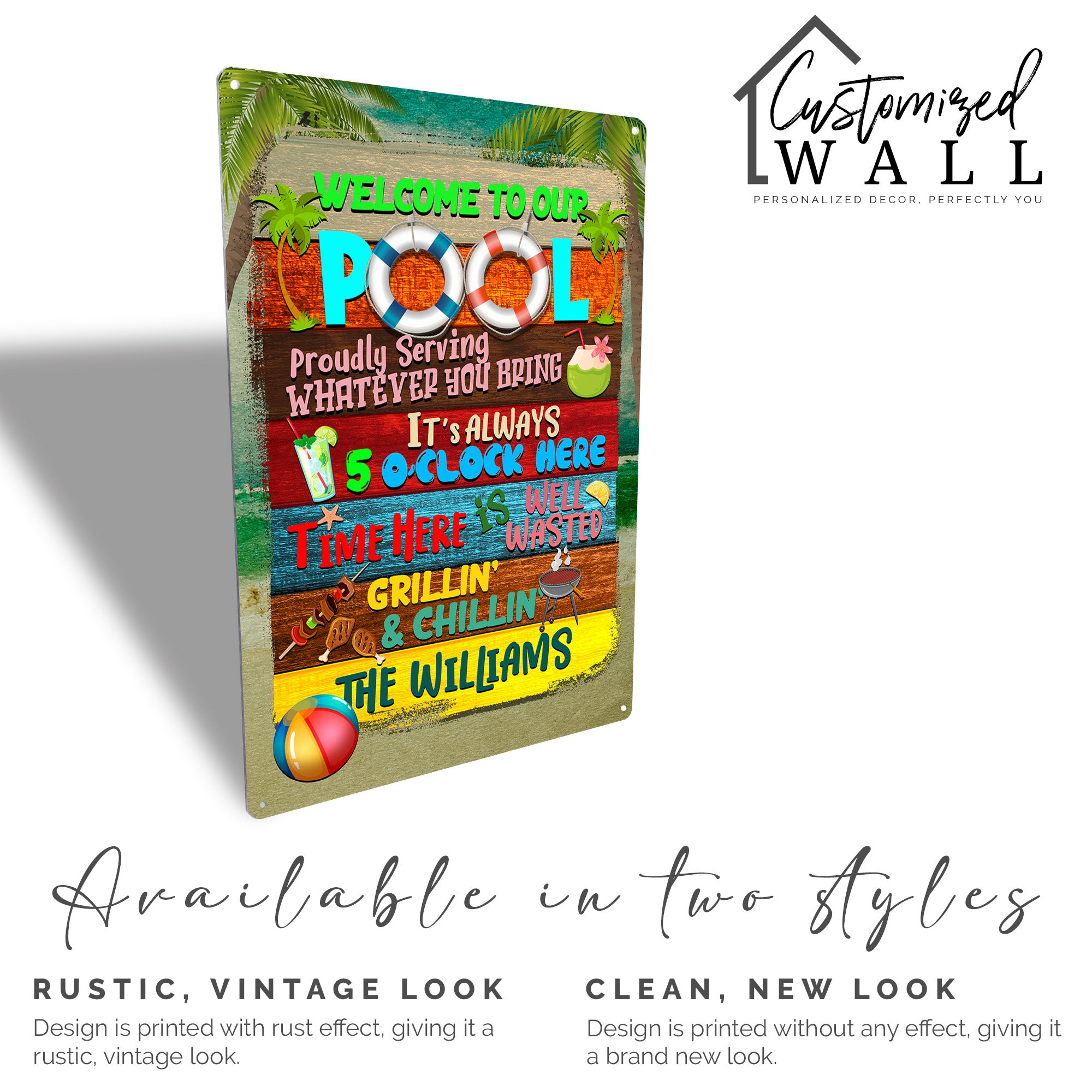 Transform your poolside into a vibrant oasis with our Personalized Poolside Metal Sign. Crafted with care and an eye for detail, this colorful sign is perfect for adding a personal touch to your outdoor space. Featuring a lively mix of bold and cheerful colors, playful text, and tropical imagery, it brings a whimsical and inviting atmosphere to your backyard gatherings.