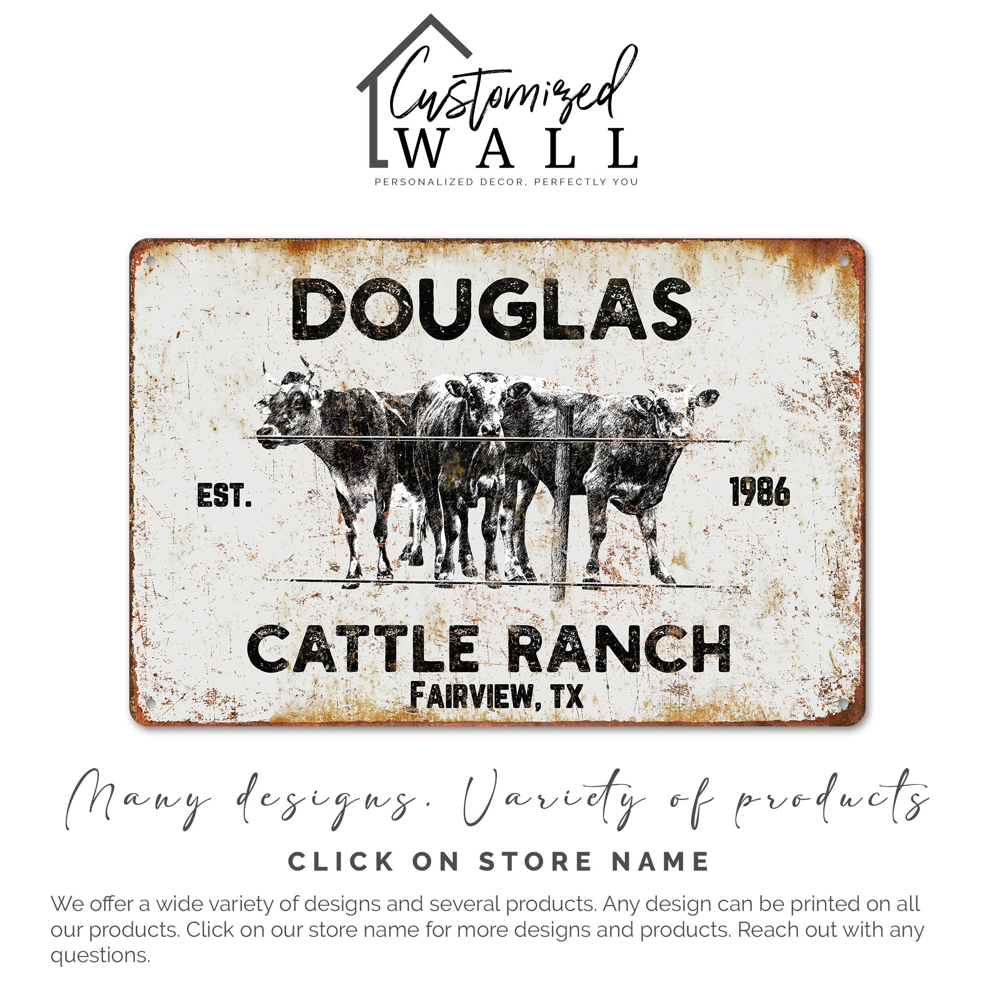 TAGS: personalized sign, rustic decor, cattle ranch, custom metal sign, farmhouse style, gift for farmers, ranch enthusiasts, family name sign, outdoor decor, farmhouse gift, housewarming present, country living, vintage metal sign, established sign, custom gift