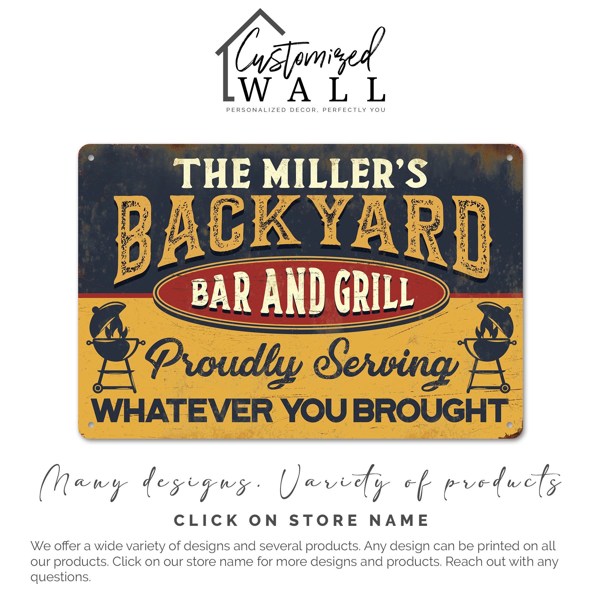 Elevate your outdoor gatherings with our Personalized Rustic Metal Sign, expertly crafted to bring charm and humor to any backyard bar and grill setup. This horizontal sign features a vintage-inspired design with rich earthy tones—navy, gold, and deep red—accentuating bold, distressed lettering that reads: "The Miller's Backyard Bar and Grill - Proudly Serving Whatever You Brought." The playful grill imagery adds a touch of whimsy, making this sign an inviting focal point for any space.