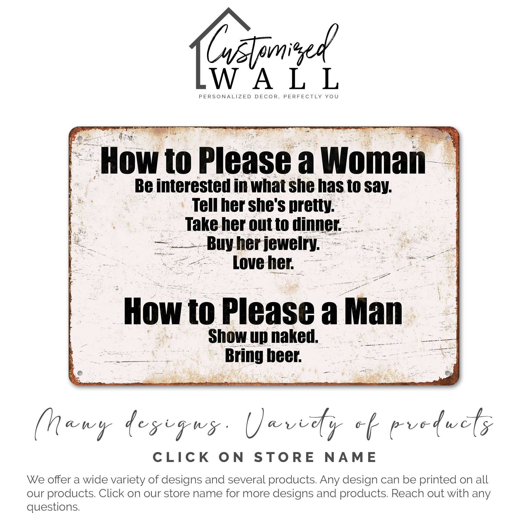 Bring a smile to your loved ones with our Personalized Rustic Metal Sign featuring light-hearted, humorous advice on how to please both women and men. Crafted with care, this durable metal plaque is perfect for adding a touch of whimsy to any space, from the home to a bar or man cave. The distressed finish and bold typography ensure it stands out while maintaining a vintage charm.