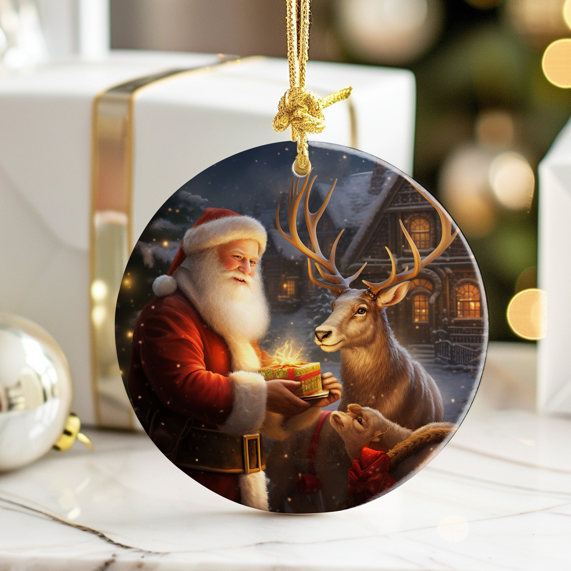 Add a touch of magic to your holiday decor with our Personalized Santa & Reindeer Ceramic Ornament. This handmade treasure captures the joyous spirit of Christmas, featuring a heartwarming scene of Santa presenting a beautifully wrapped gift to his charming reindeer companions. The rich, vibrant colors of Santa's iconic red suit and the gentle glow of the gift create an enchanting winter wonderland backdrop.