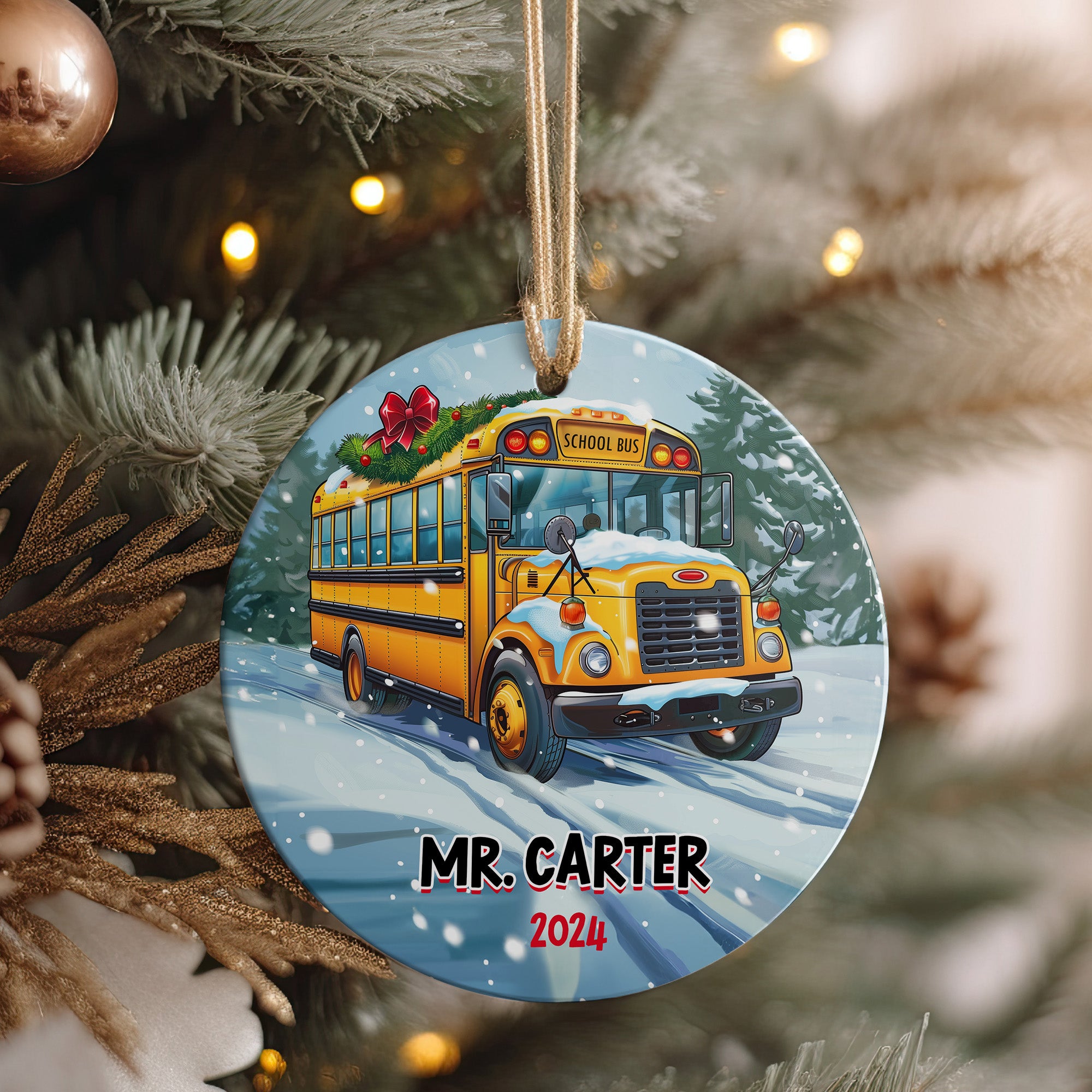 Perfect for holiday gifting, this ornament is an expressive way to show gratitude to those who make daily school journeys safe and joyful. Whether it's for a beloved bus driver or a cherished teacher named Mr. Carter, this ornament extends a personal thank you and a festive greeting.