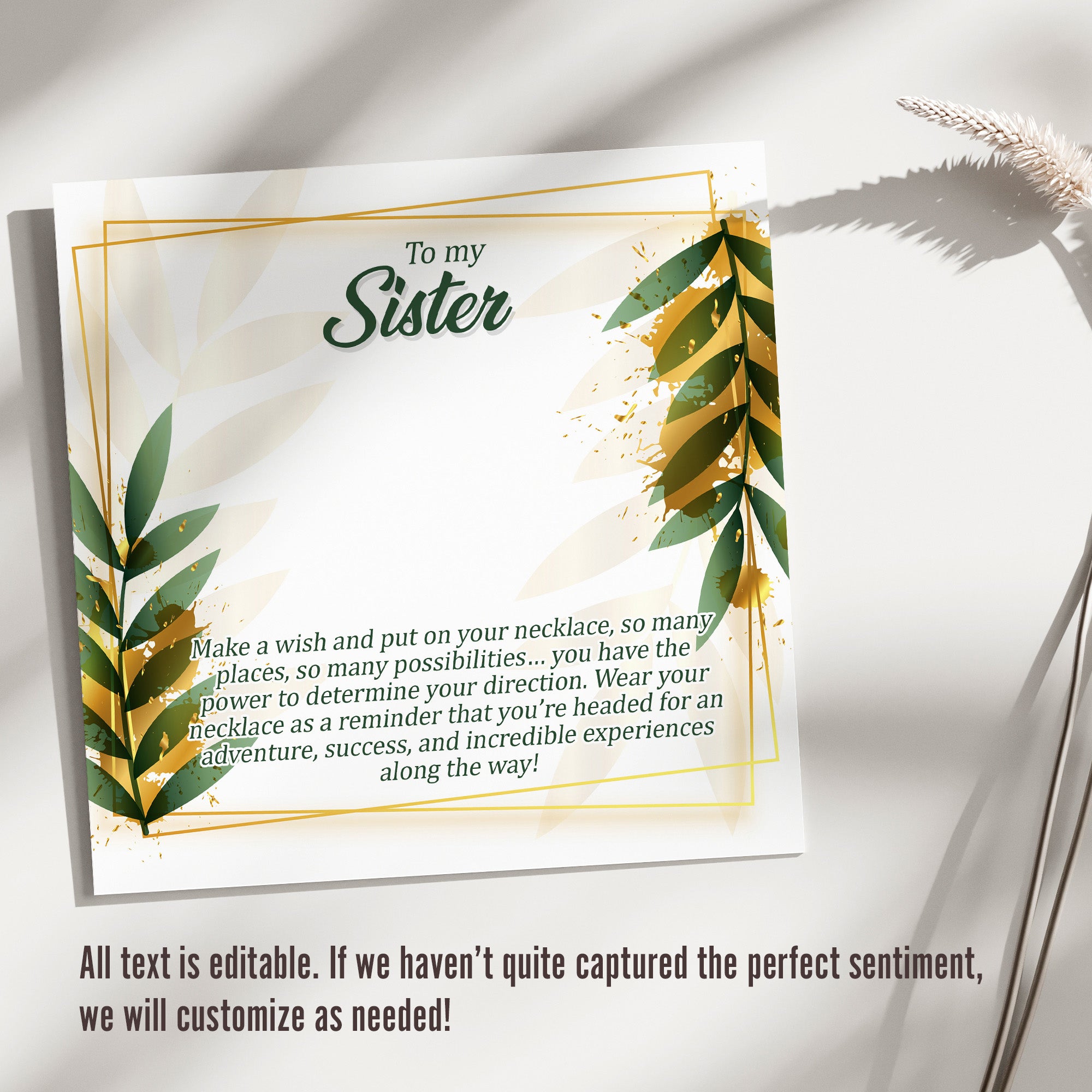 The message card, adorned with lush green foliage and gentle golden accents, enhances the emotional appeal of this gift. The carefully crafted text invites your sister to make a wish, reminding her of the endless possibilities that await her journey toward adventure and success. This thoughtful design not only captures the essence of sisterly love but also provides a daily reminder of inspiration and support.