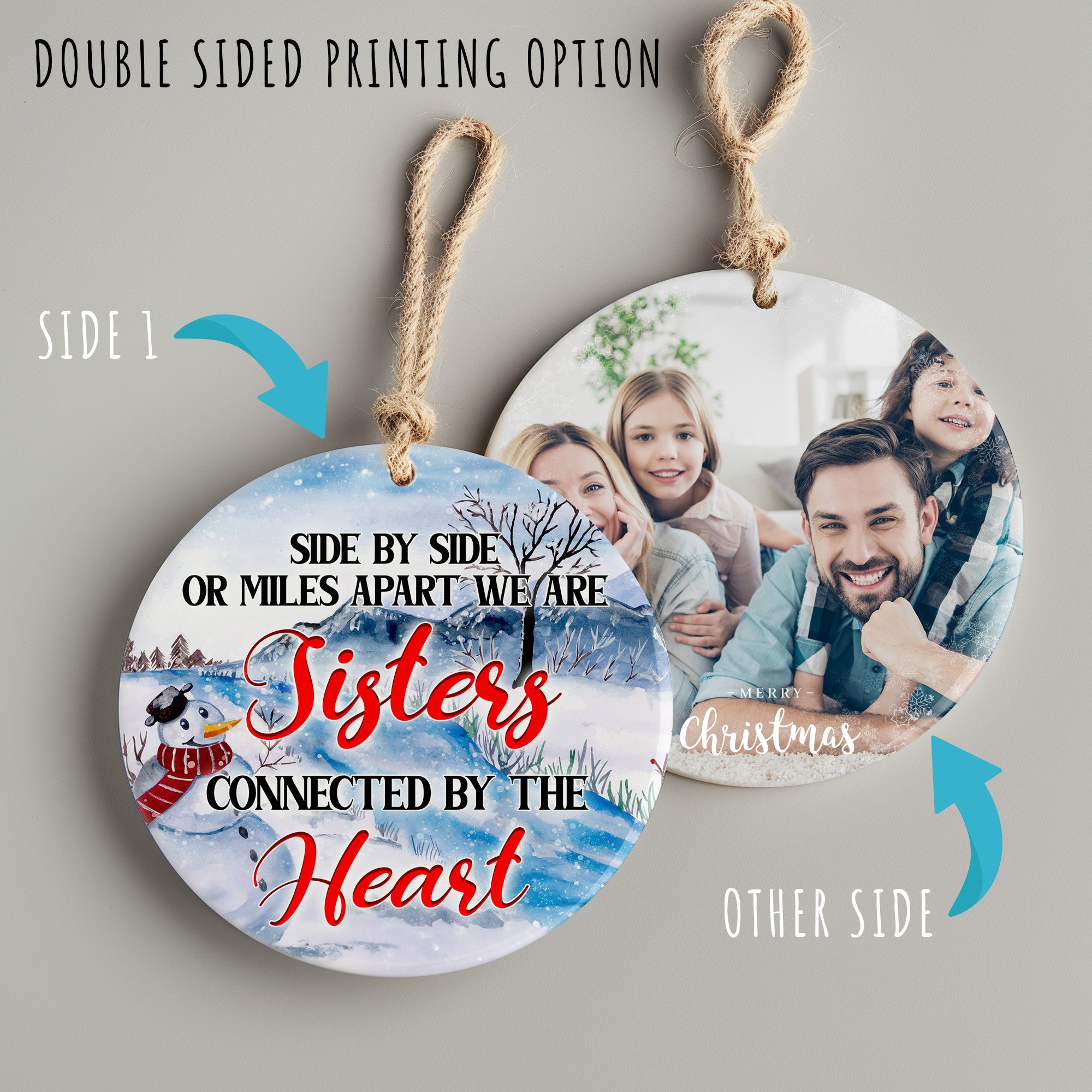 Embrace the spirit of the season and the joy of sisterhood with this lovely personalized ceramic ornament, a heartfelt addition to any festive occasion.