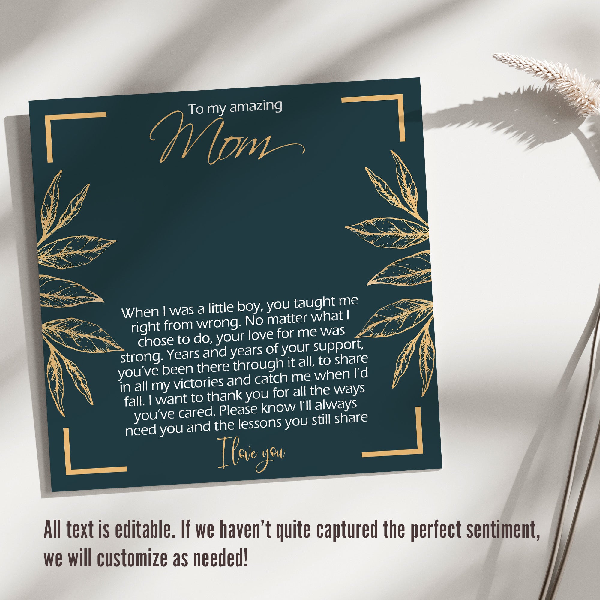 This gift is not only a piece of jewelry; it's a story of appreciation and love. The heartfelt message on the card reads, "When I was a little boy, you taught me right from wrong..." making it a cherished keepsake she will treasure forever.