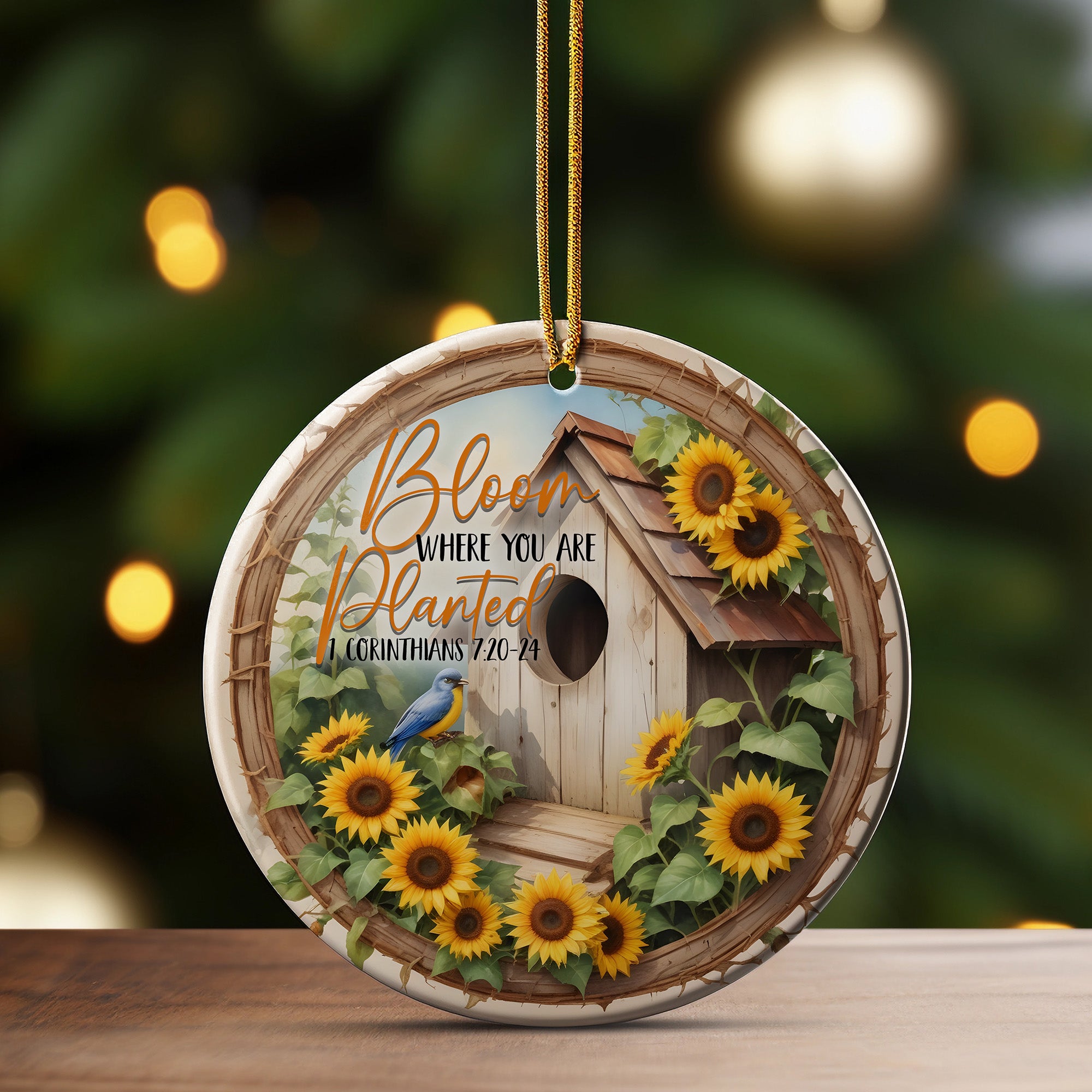 Adorn your living space with our exquisite "Bloom Where You Are Planted" Ceramic Ornament. Crafted with attention to detail, this charming piece features vibrant sunflowers, a serene birdhouse, and a delightful bird, beautifully captured on premium ceramic. The heartwarming message from 1 Corinthians 7:20-24 infuses inspiration and positivity into any room.