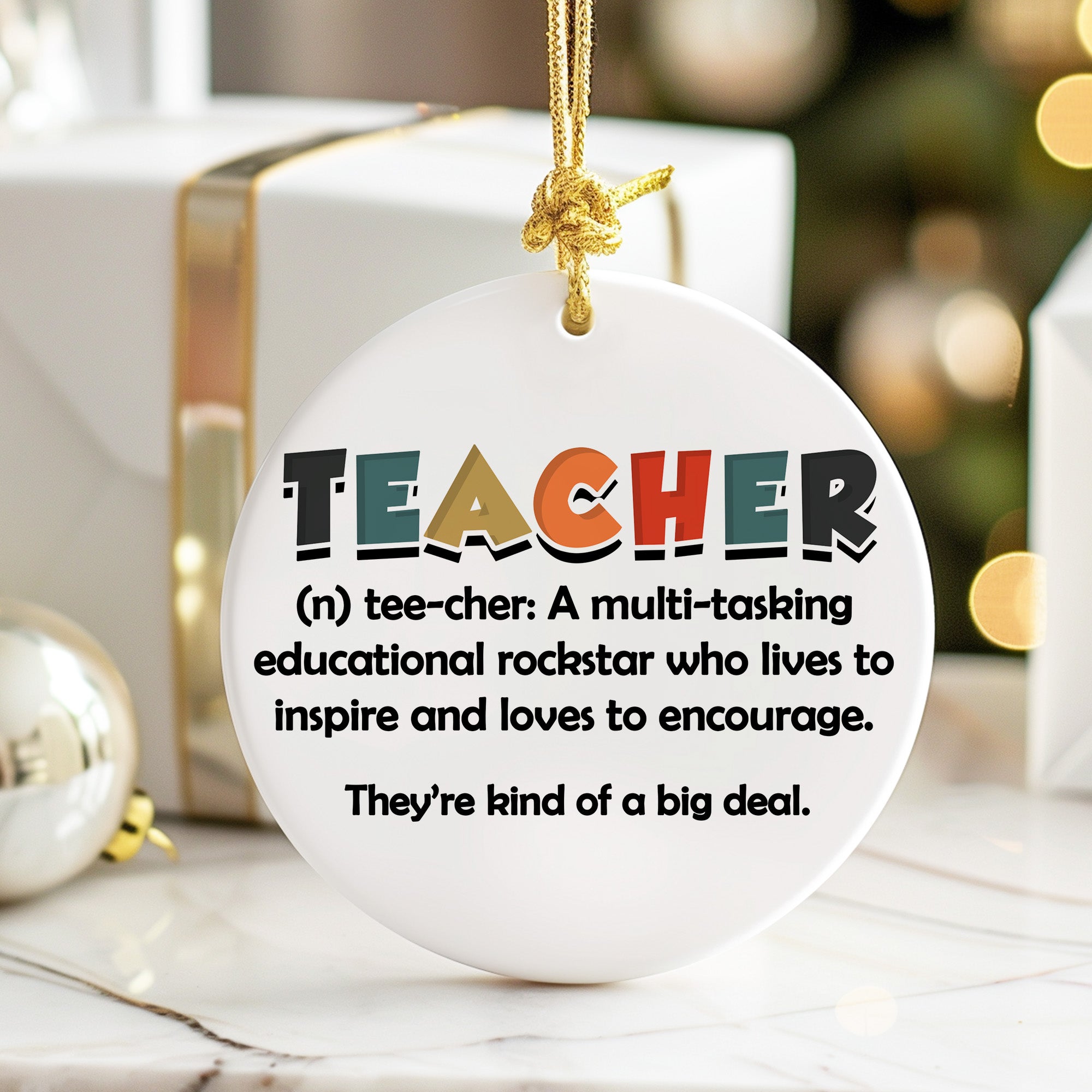 The ornament displays a heartfelt definition of a teacher as a "multi-tasking educational rockstar who lives to inspire and loves to encourage." This thoughtful message captures the essence of educators' dedication and impact, making it a perfect token of appreciation.