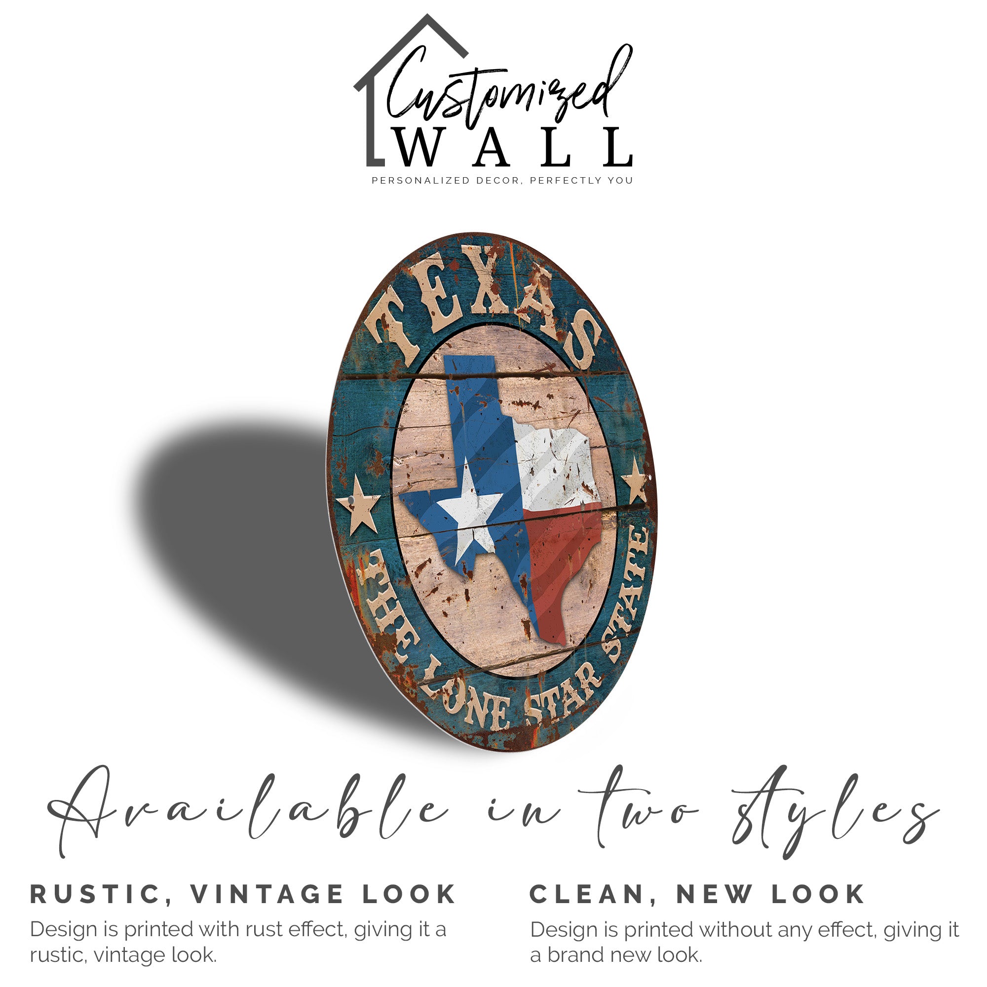 Celebrate your love for Texas with this beautifully crafted Texas Metal Sign, featuring the famous "Lone Star State" theme. This round sign boasts a captivating design with the iconic Texas state shape highlighted in vibrant blue, red, and white colors, reminiscent of the Texas flag. The rustic wood-inspired background adds a warm, inviting touch to any space, making it the perfect piece for your home or office.