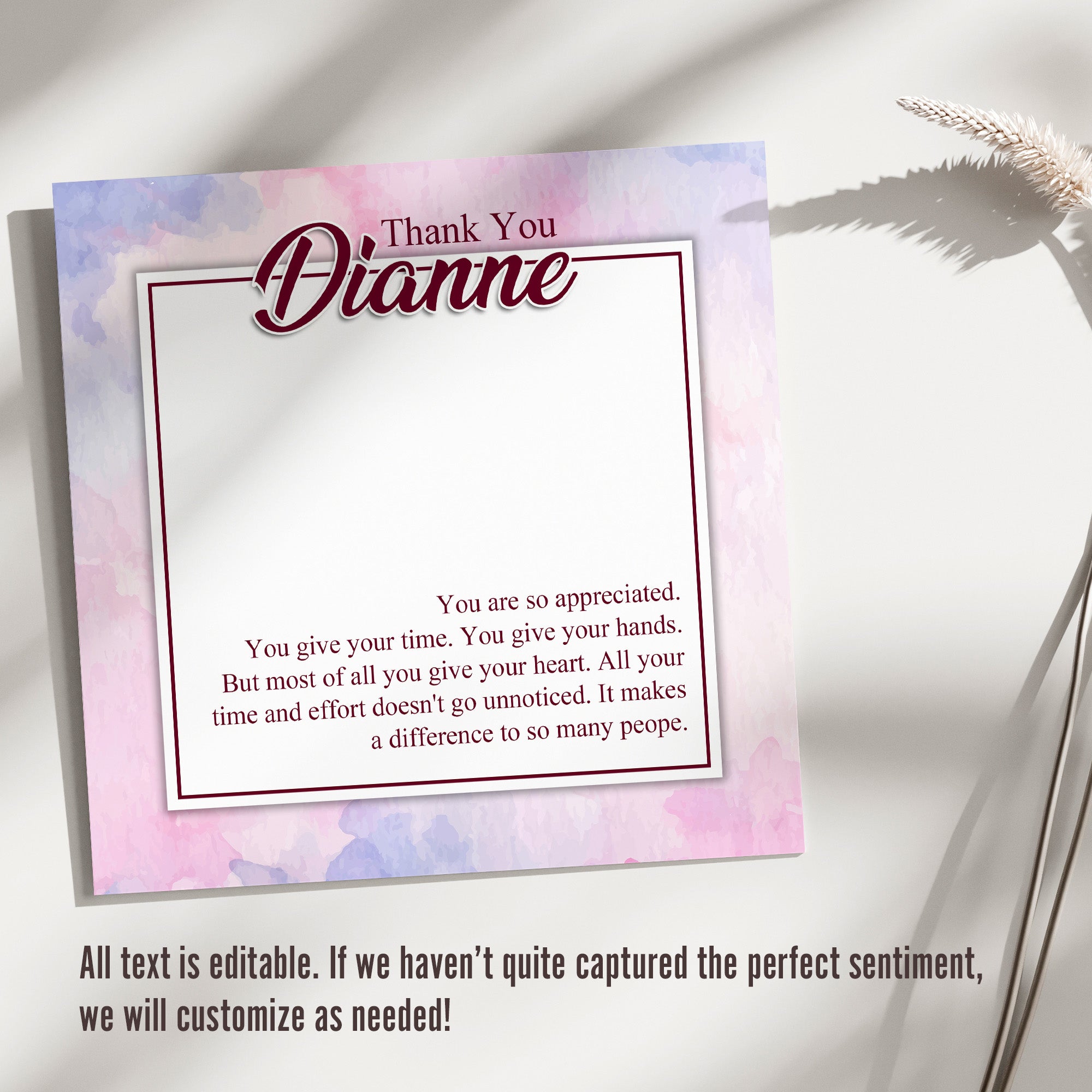 This necklace comes complete with a personalized message card, adorned in soft watercolor hues of pink and lavender, creating a warm and inviting background. The text "Thank You Dianne" graces the card, but you can customize this to feature any name, making this gift truly special and unique.