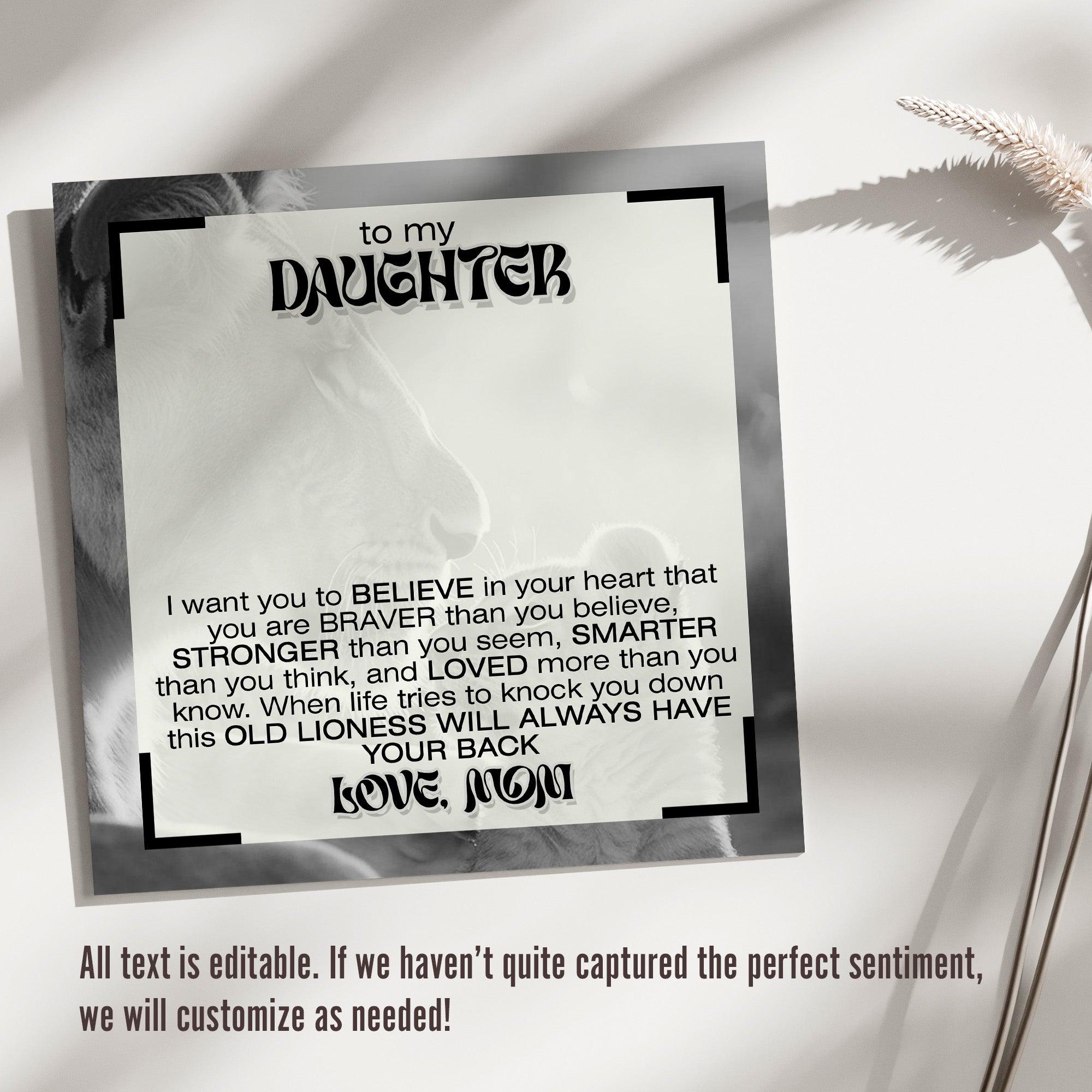 The necklace comes beautifully packaged with a heartfelt message card, adorned in soft, neutral tones. The card reads, "I want you to BELIEVE in your heart that you are BRAVER than you believe, STRONGER than you seem, SMARTER than you think, and LOVED more than you know. When life tries to knock you down, this OLD LIONESS WILL ALWAYS HAVE YOUR BACK. LOVE, MOM." This message is sure to touch the heart of your daughter, reminding her of your unwavering love and support.
