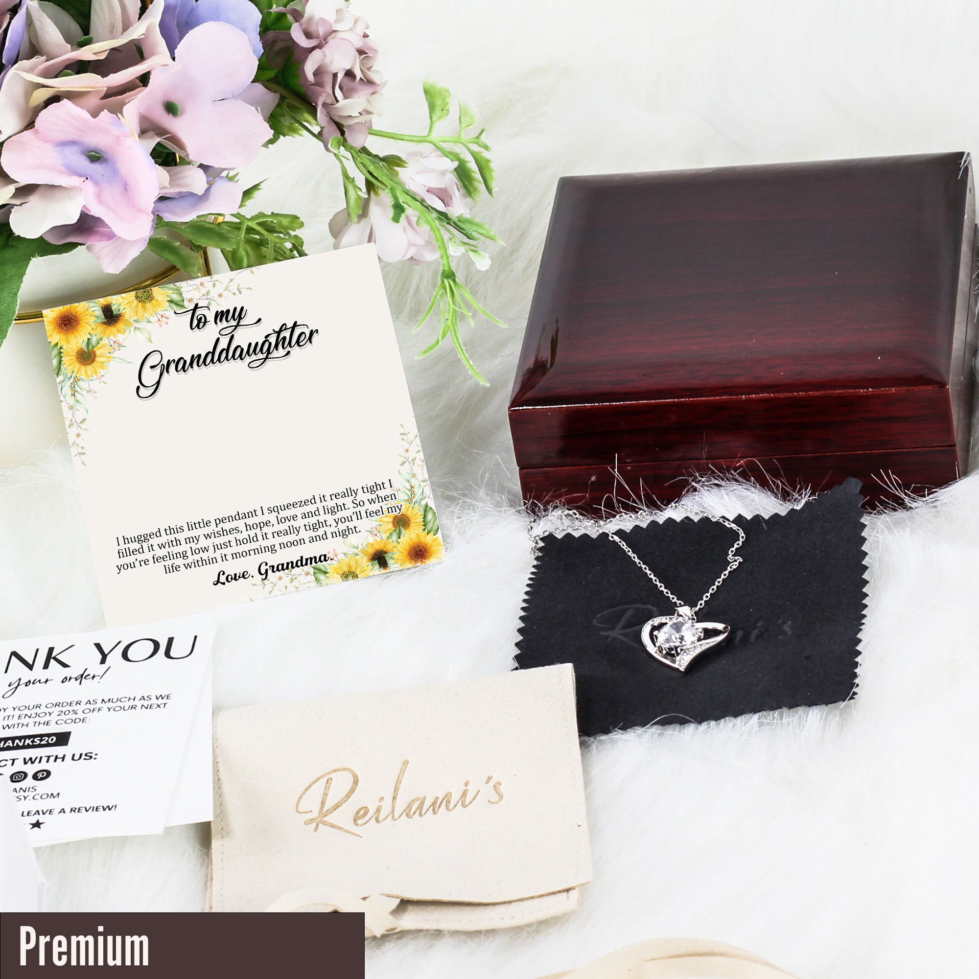 Gift your beloved granddaughter a keepsake that speaks from the heart. This stunning necklace features a delicate interwoven pendant encrusted with shimmering stones, symbolizing the unbreakable bond between a grandmother and her granddaughter. The message card, adorned with vibrant sunflower illustrations, exudes warmth and positivity, capturing the nurturing essence of this heartfelt gift.