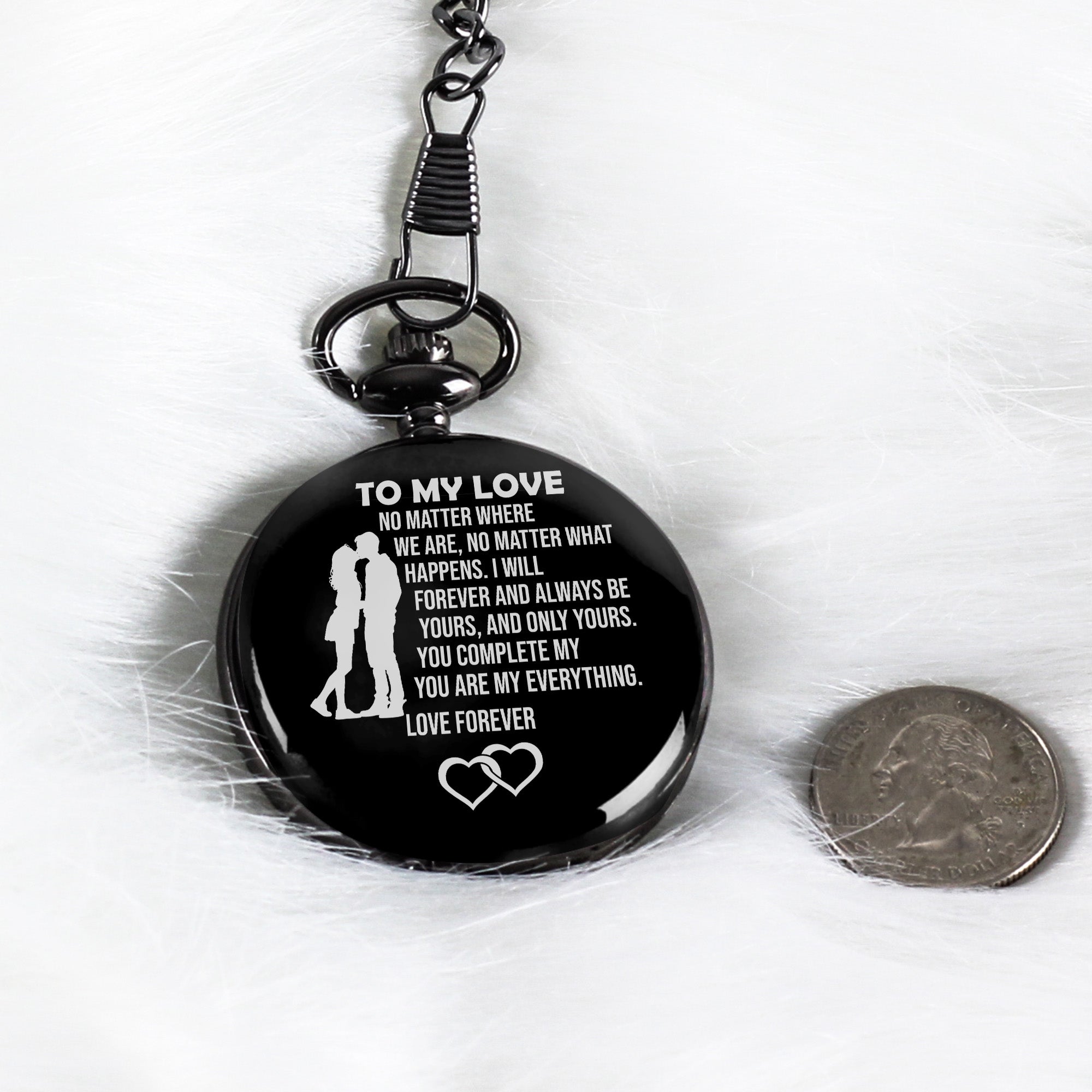 Crafted with precision, this pocket watch boasts high-quality materials that ensure durability and a lasting shine. Its intricate design exudes sophistication, offering a classic touch that complements both modern and traditional styles. The watch face highlights a heartfelt message: "To My Love, No Matter Where We Are, No Matter What Happens. I Will Forever And Always Be Yours, And Only Yours. You Complete My... You Are My Everything. Love Forever." This sentimental engraving serves as a constant reminder of love and commitment.